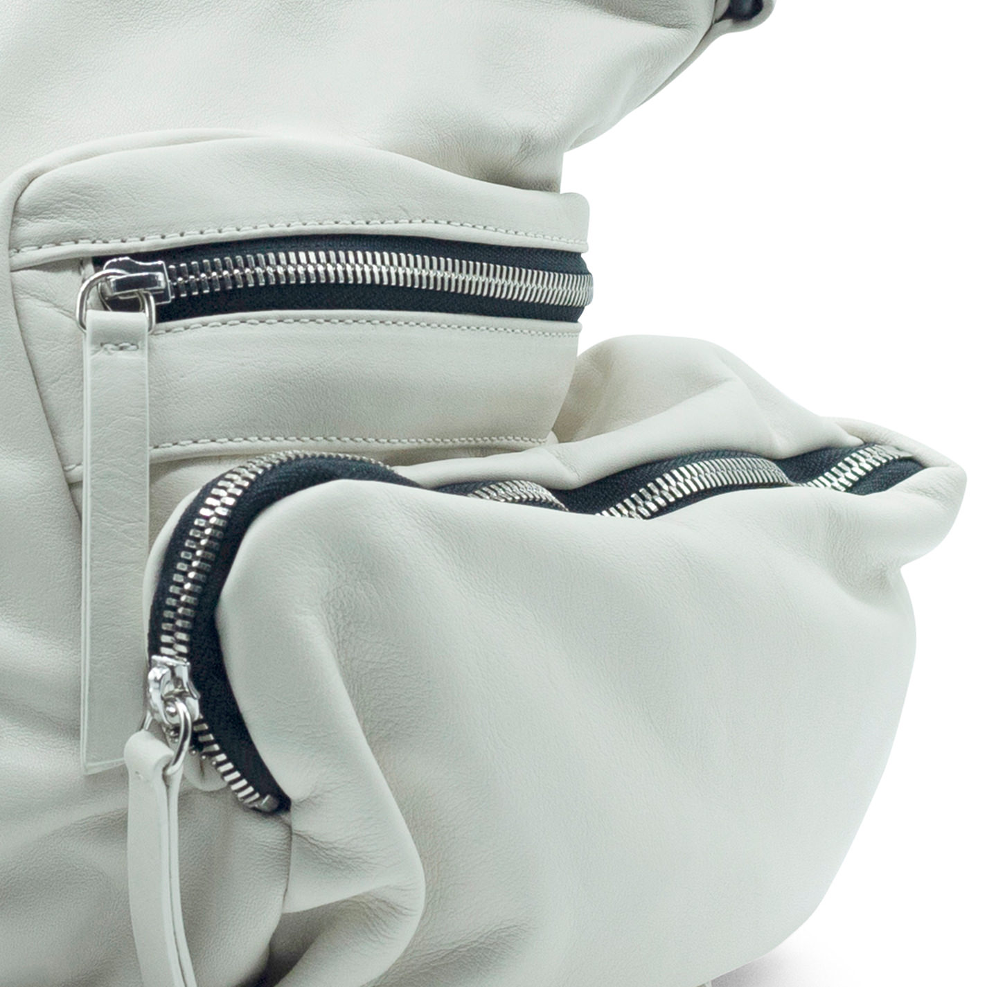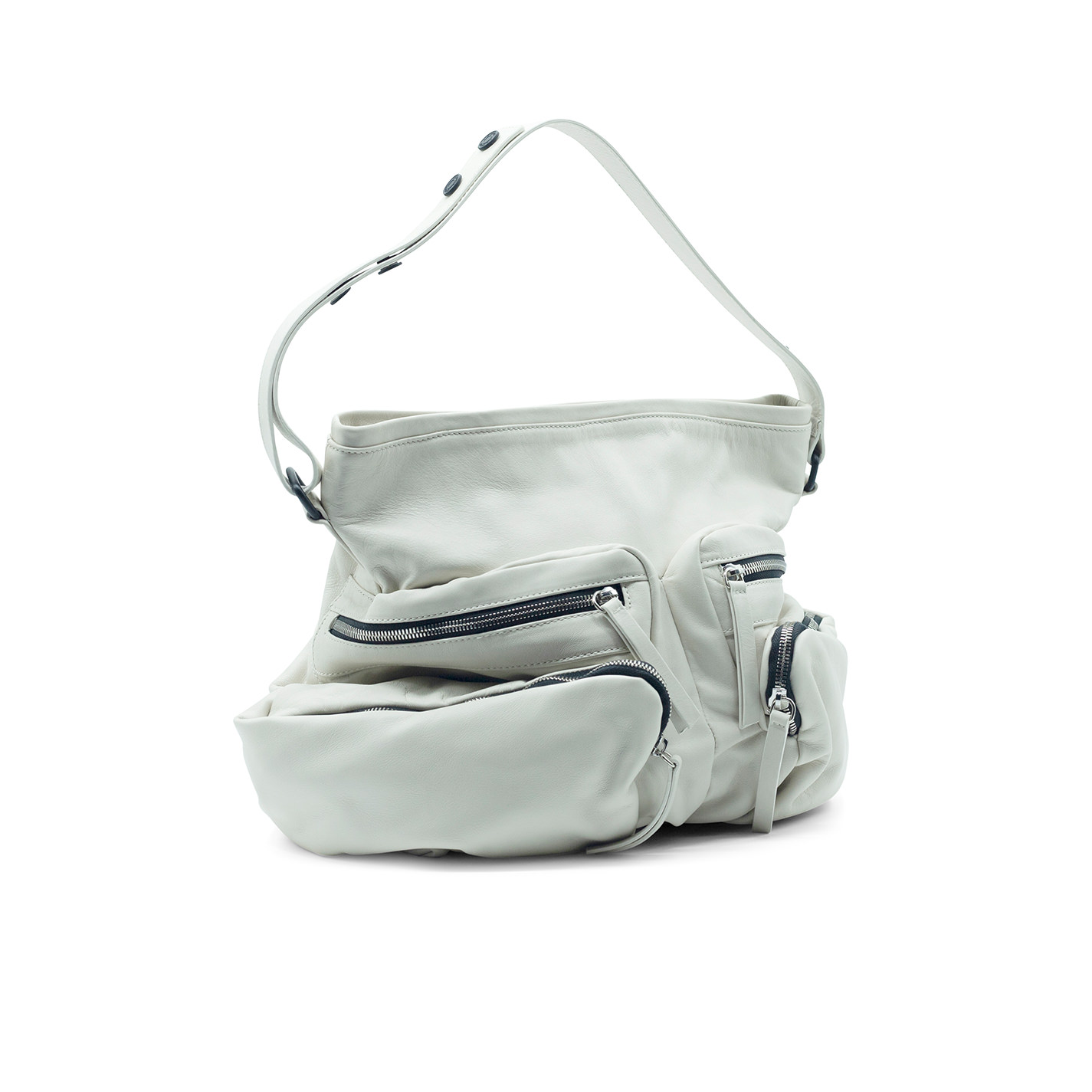 Zipped cream bagin soft nappa calfskin with maxi pockets on the front. Snap closure and adjustable shoulder strap.
