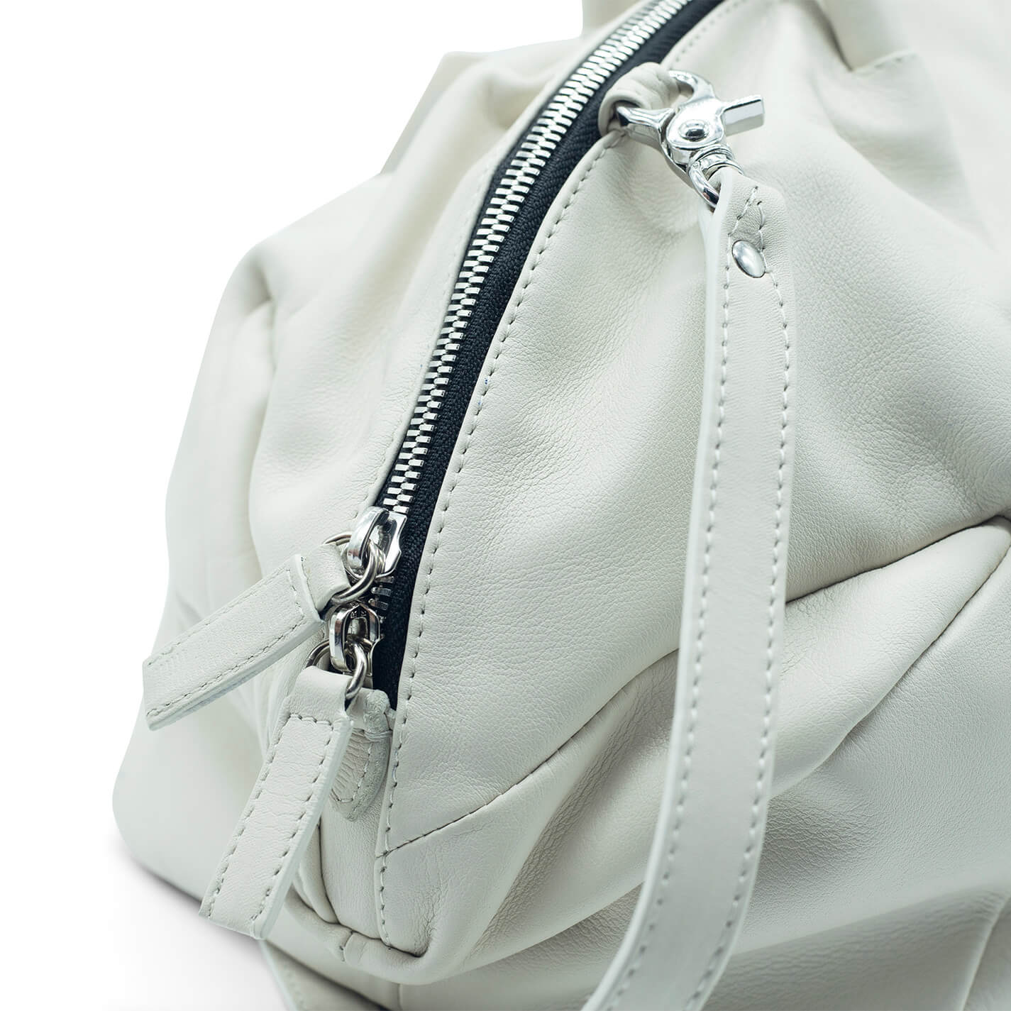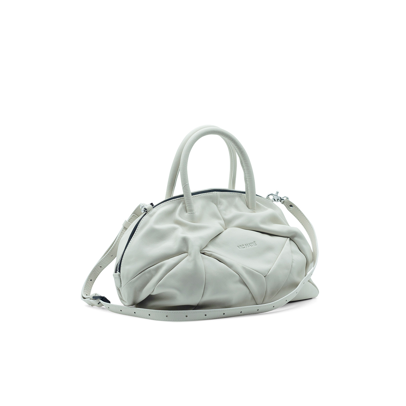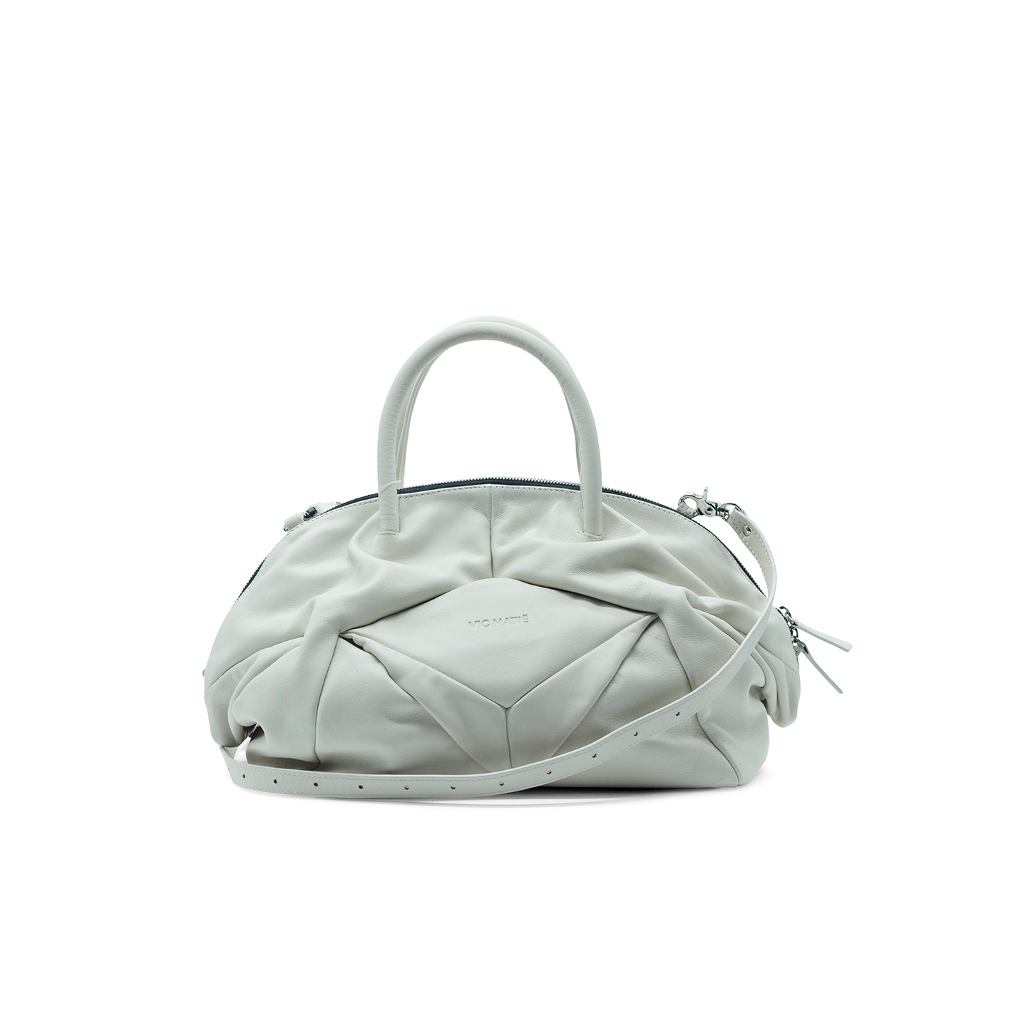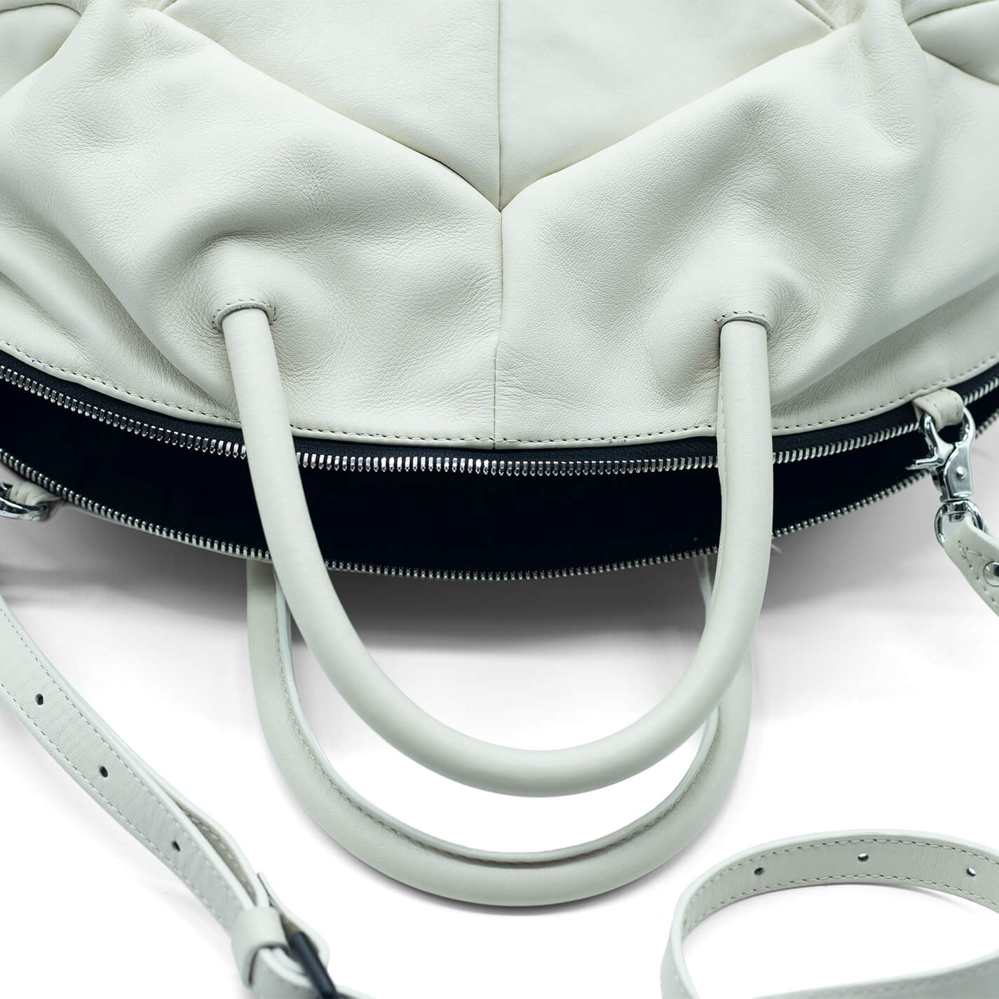 Cream wedge trunkmade of soft calfskin with rigid handles and metal zip closure. Detachable and adjustable shoulder strap.