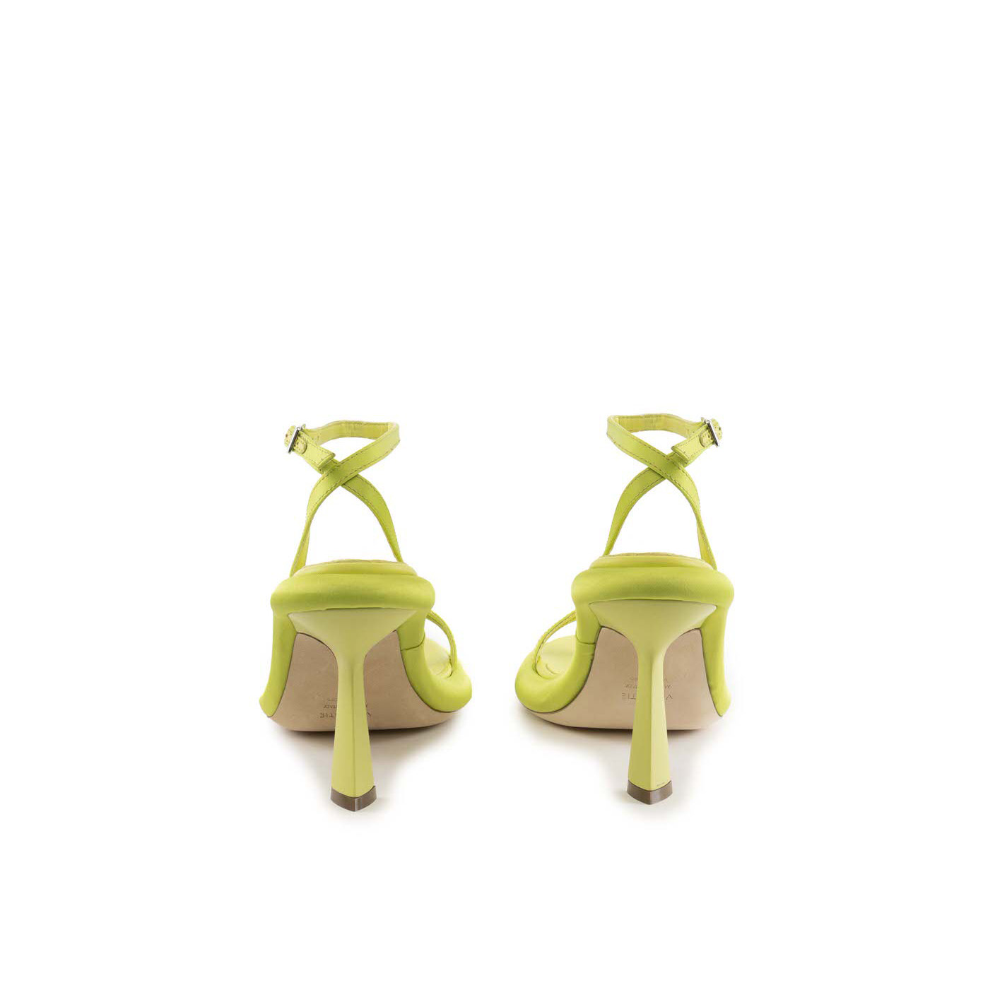 Lime satin Dosh sandals with strips at the front, strips that criss-cross at the ankle and adjustable strap. Leather sole, leather-covered curved platform, and matt coated "slash" heel. Comfortable leather-covered insole. Made in Italy.