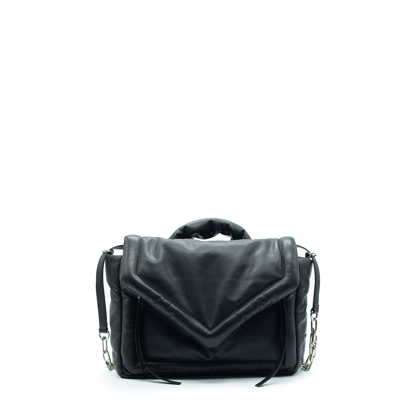 Black handbag, crafted from soft Nappa calfskin, padded leather with raised edges, and zip fastening hidden by a flap. It features zipped front pockets with tassels, and a metal chain shoulder strap.