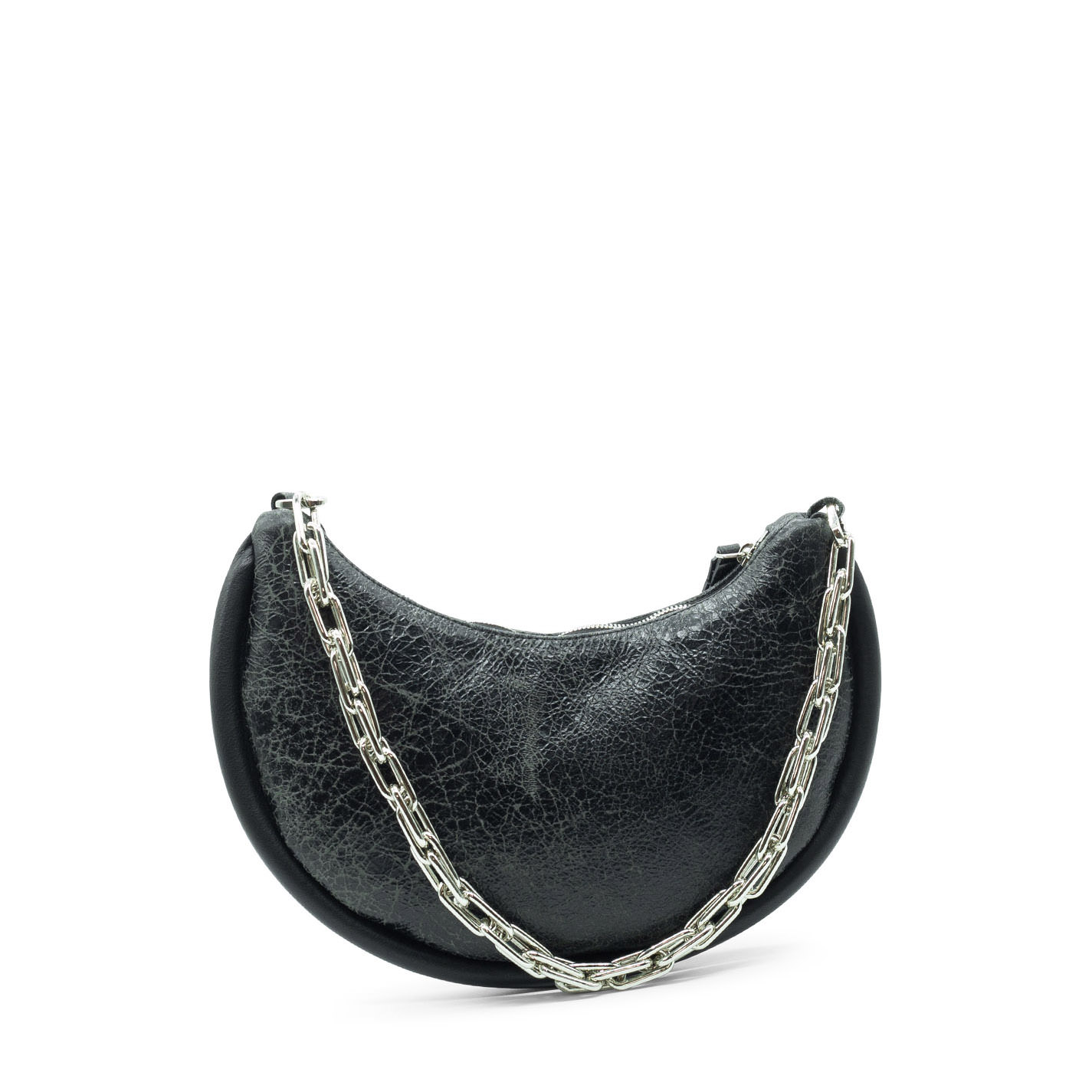 Grey crescent handbag with 1990s "punk-style" cracked leather effect, with a maxi profile. It features a detachable metal chain shoulder strap, and zip fastening.