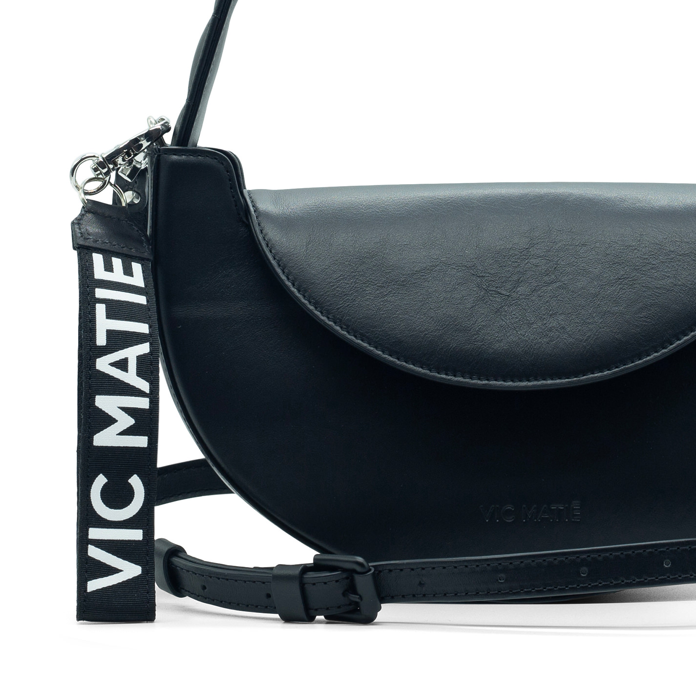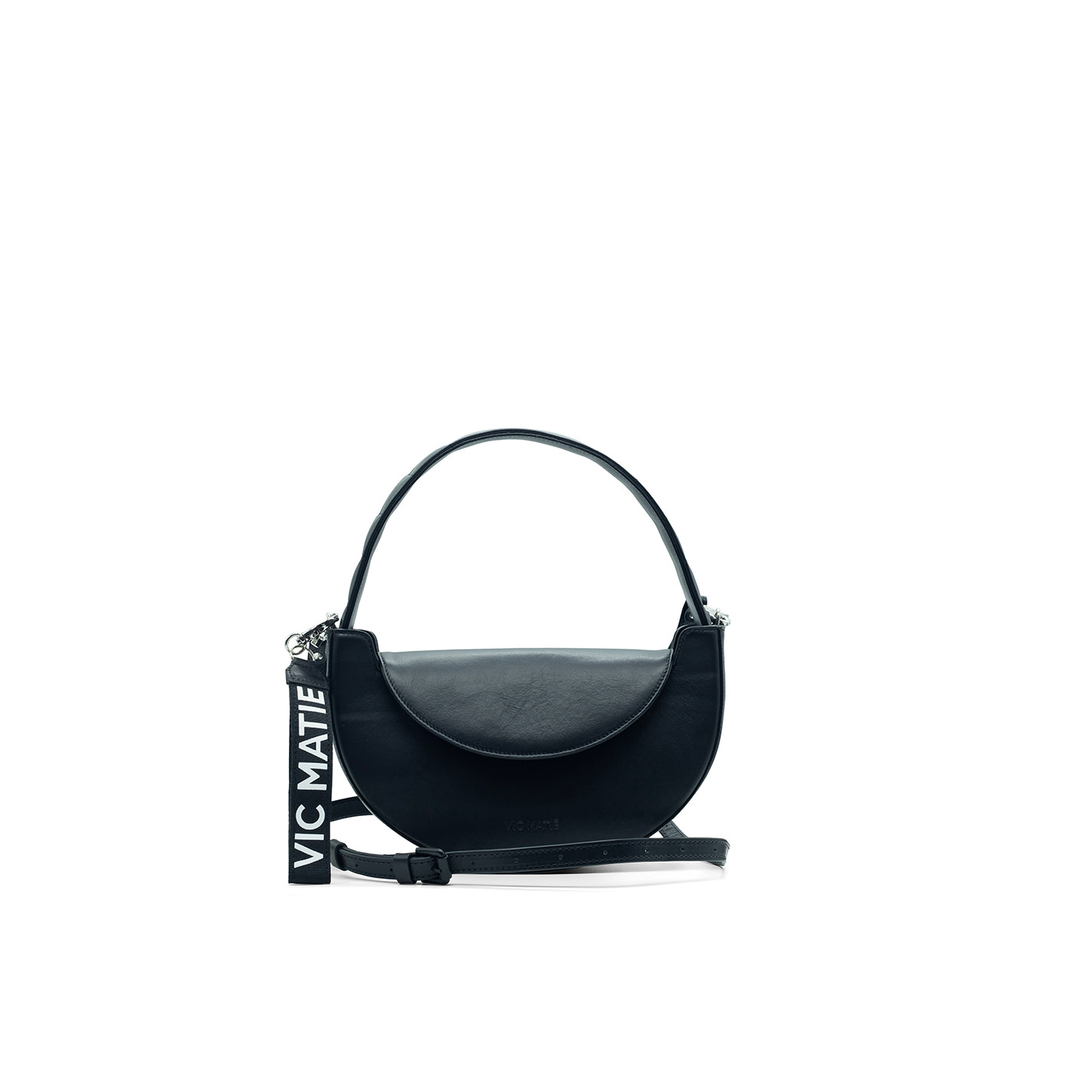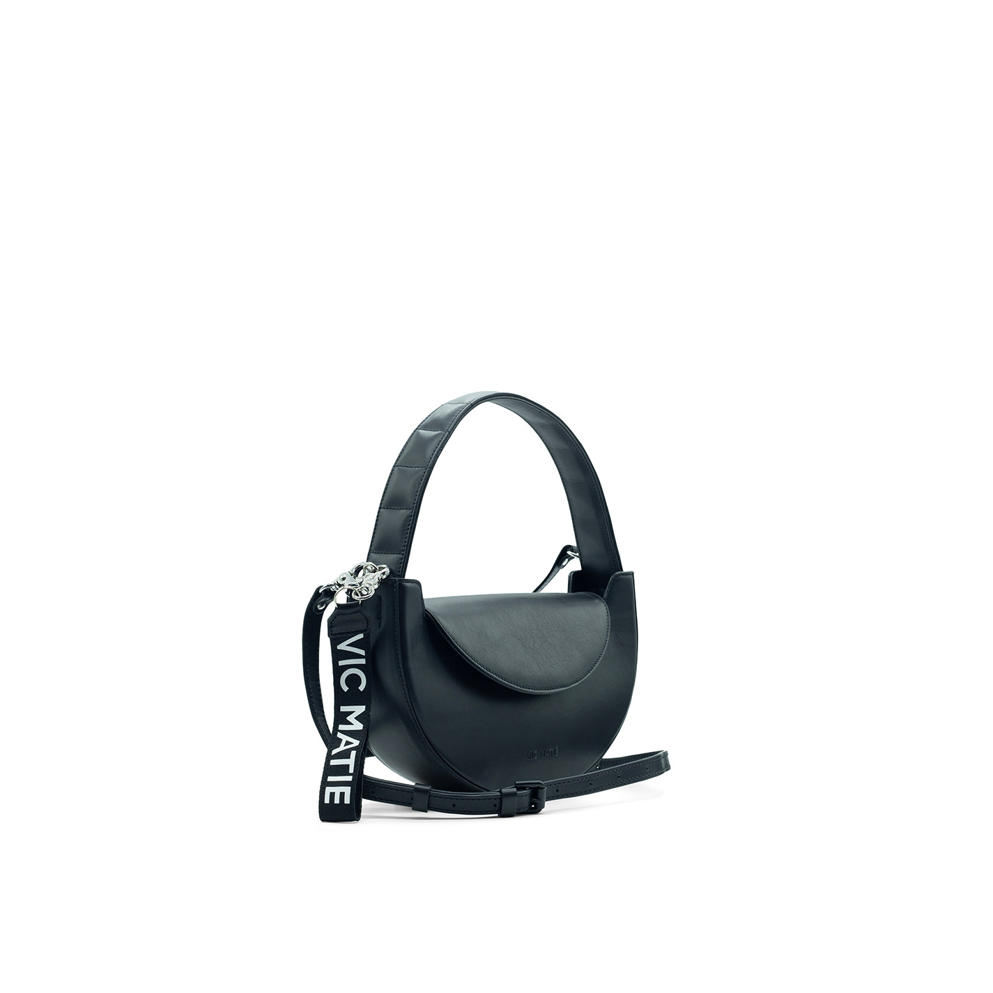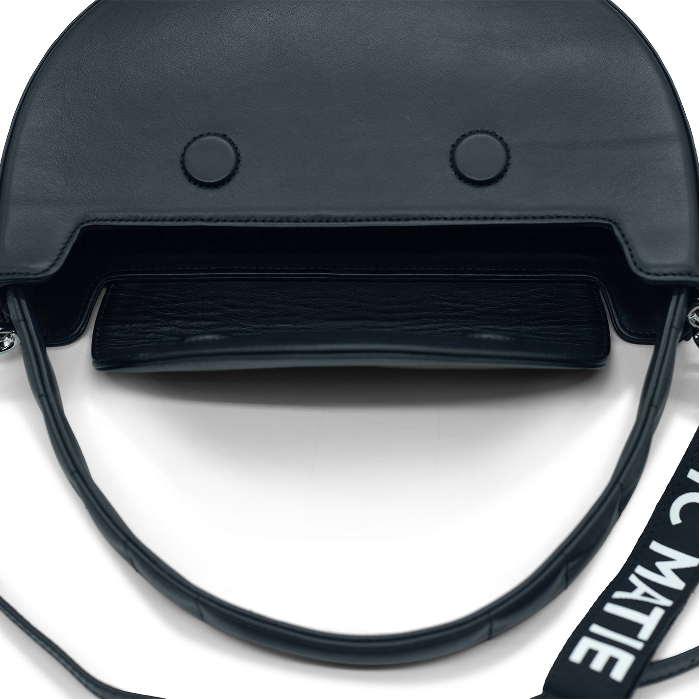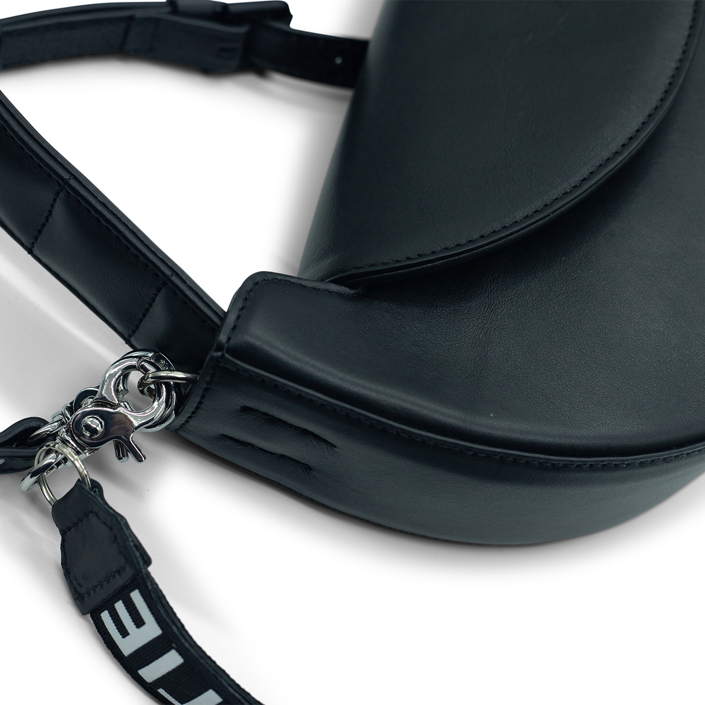 Black Half Moonin smooth calfskin, structured, closure with hidden magnets on flap. Large topstitched handle and adjustable and detachable leather shoulder strap. Logoed keyring supplied.