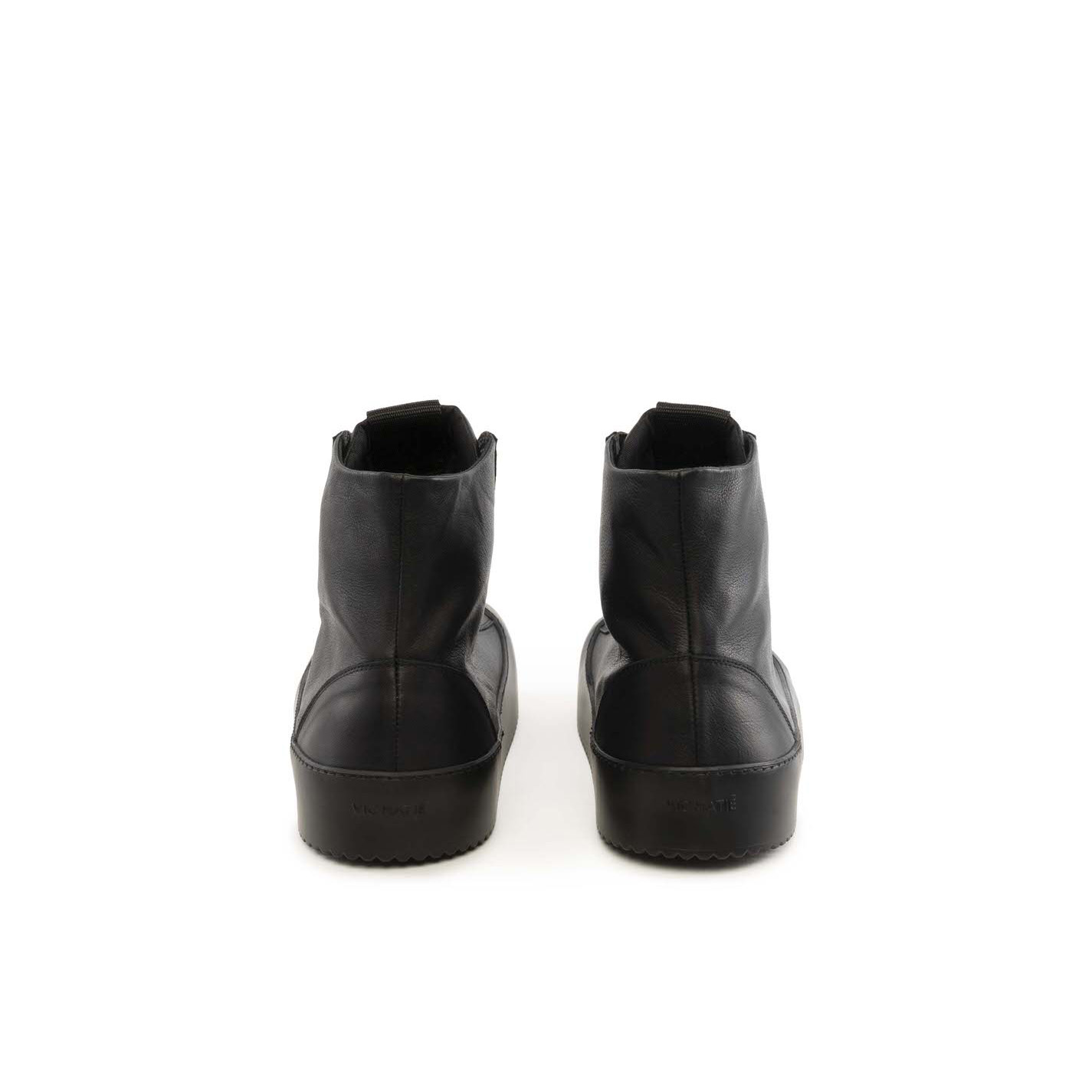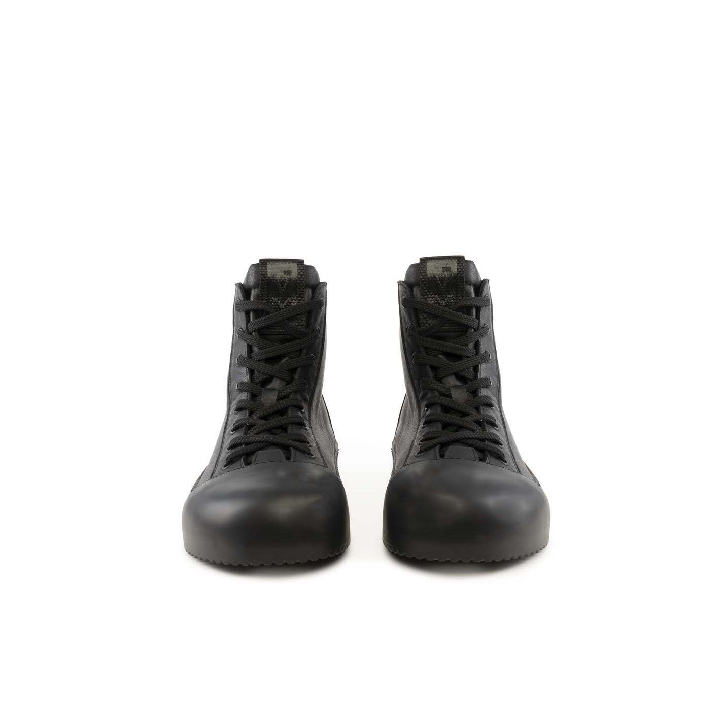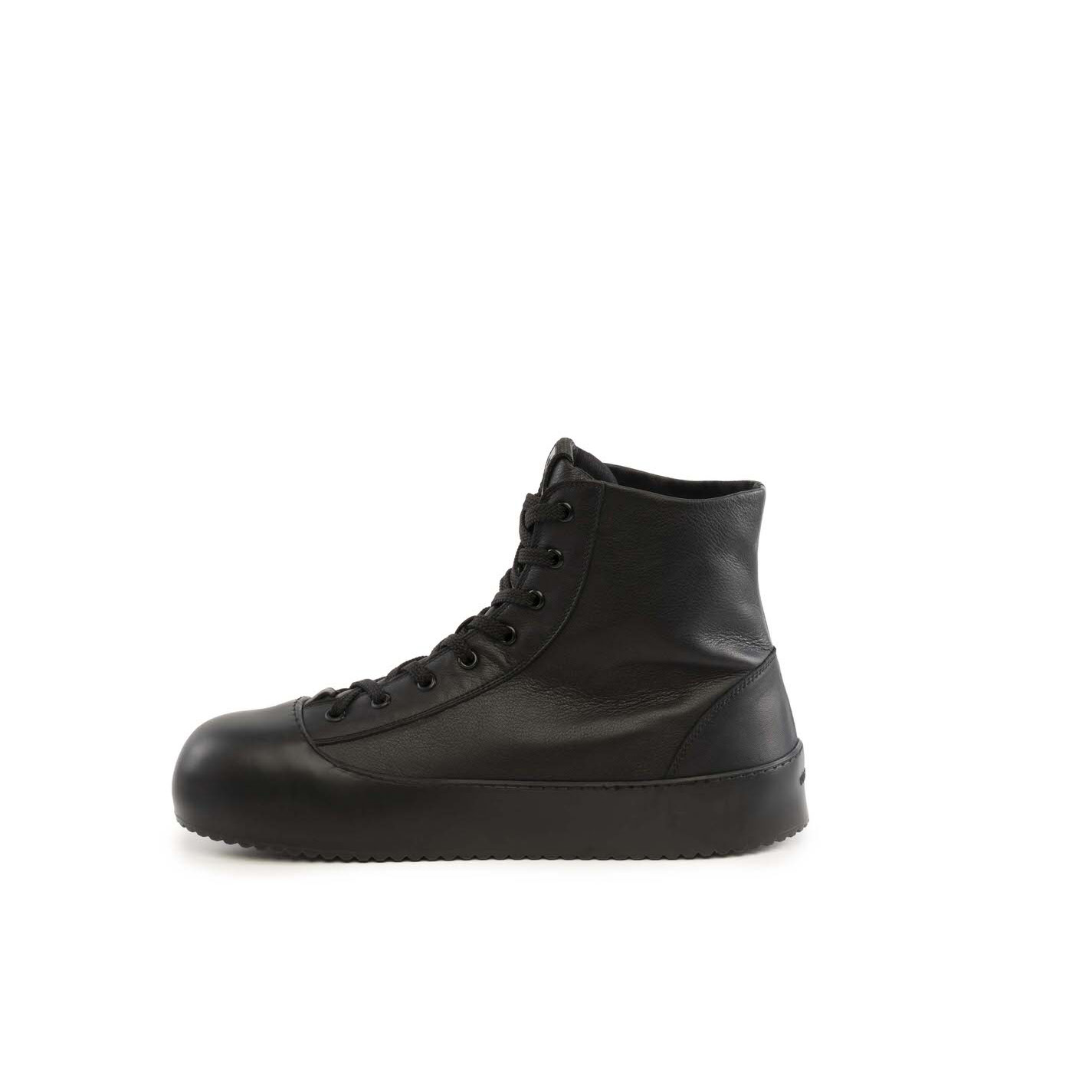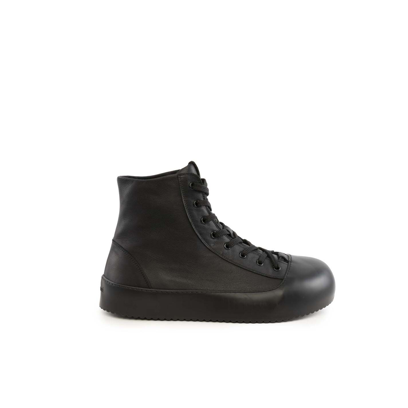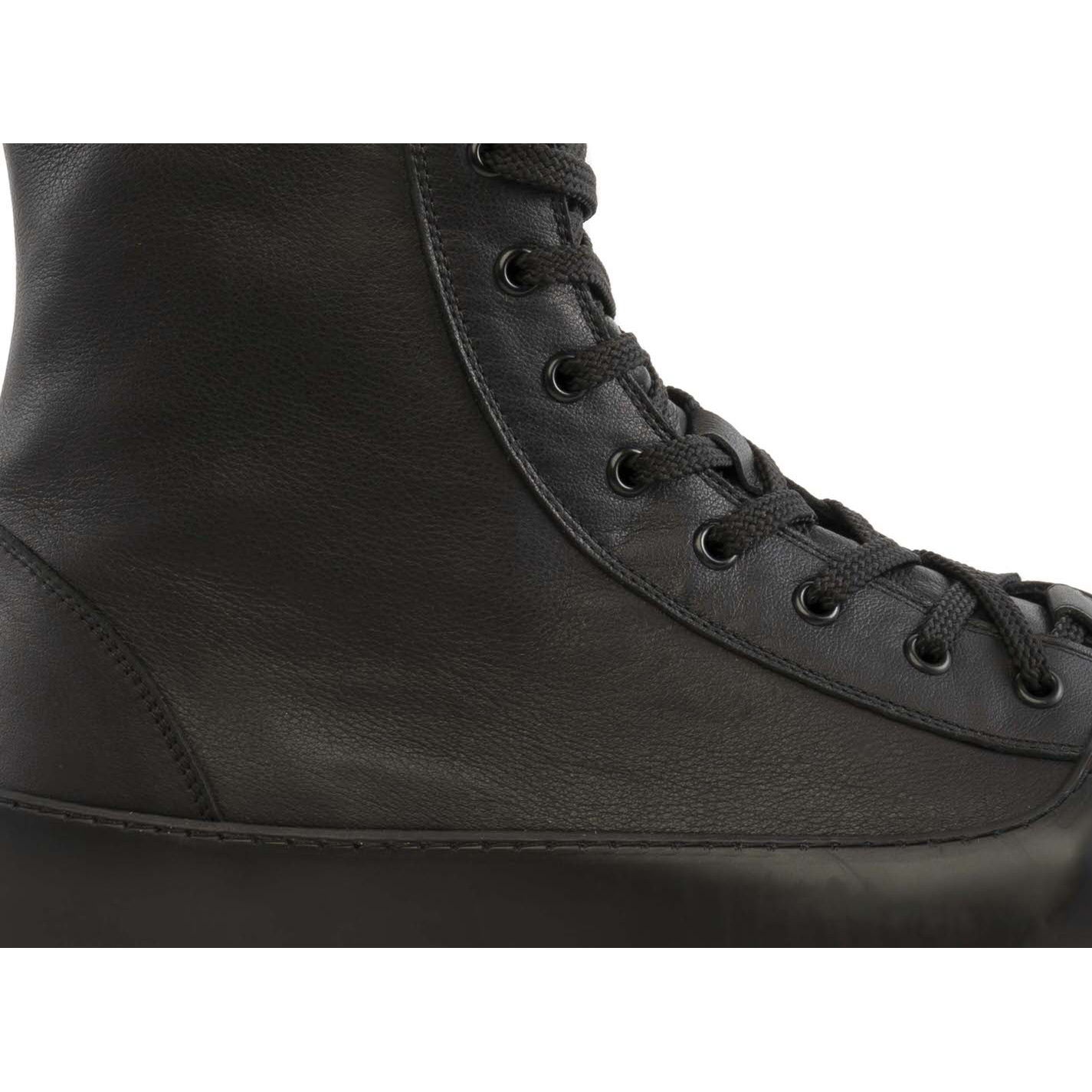 Men's Waders black combat boots in soft fine-grained calfskin, with padding along the topline and lacing. Tone-on-tone eyelets and lacing. Enveloping rubber sole, very light tread strips, and soft leather-covered insole. Made in Italy.