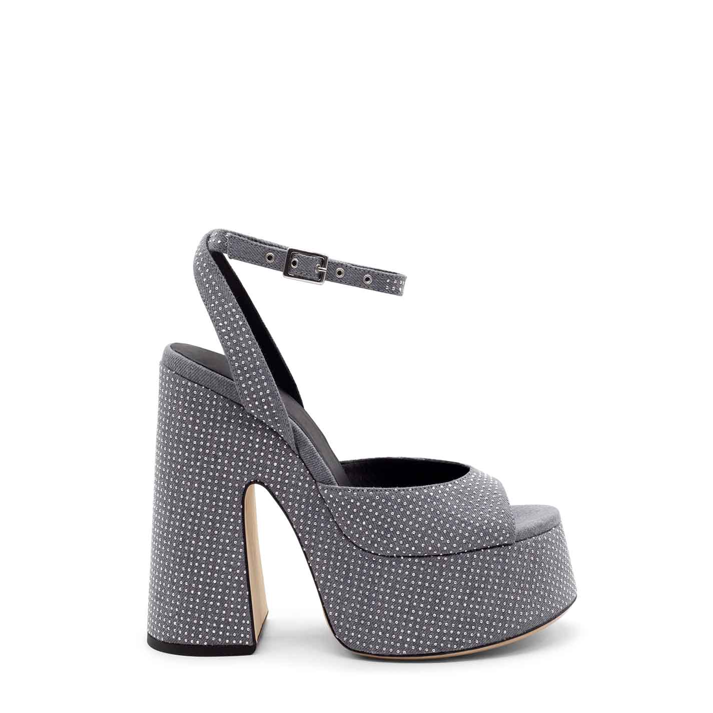 Flared sandals in grey washed denim, embellished all over with silver micro studs. Adjustable ankle strap. Leather sole and leather-covered, one-piece "flared" platform. Made in Italy.