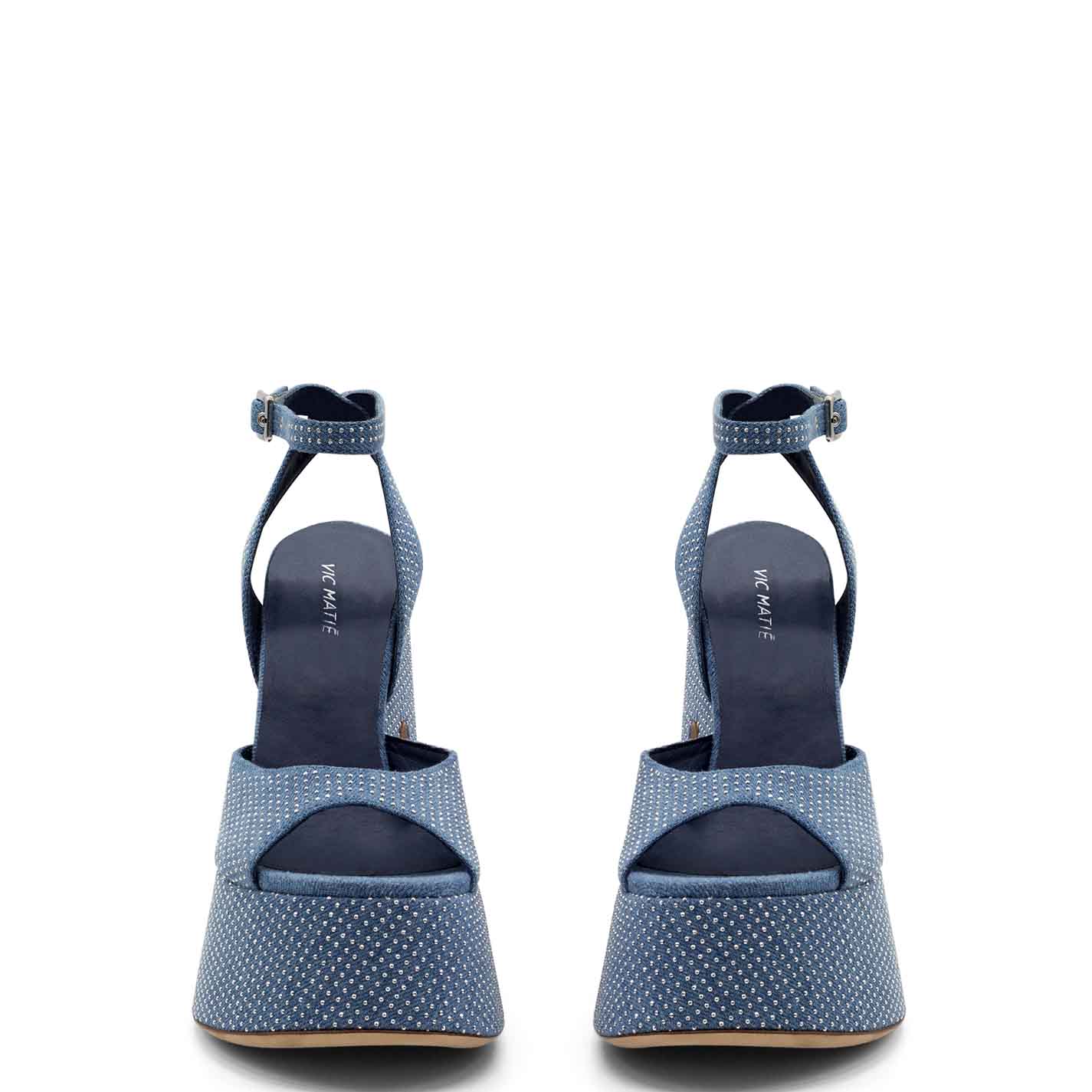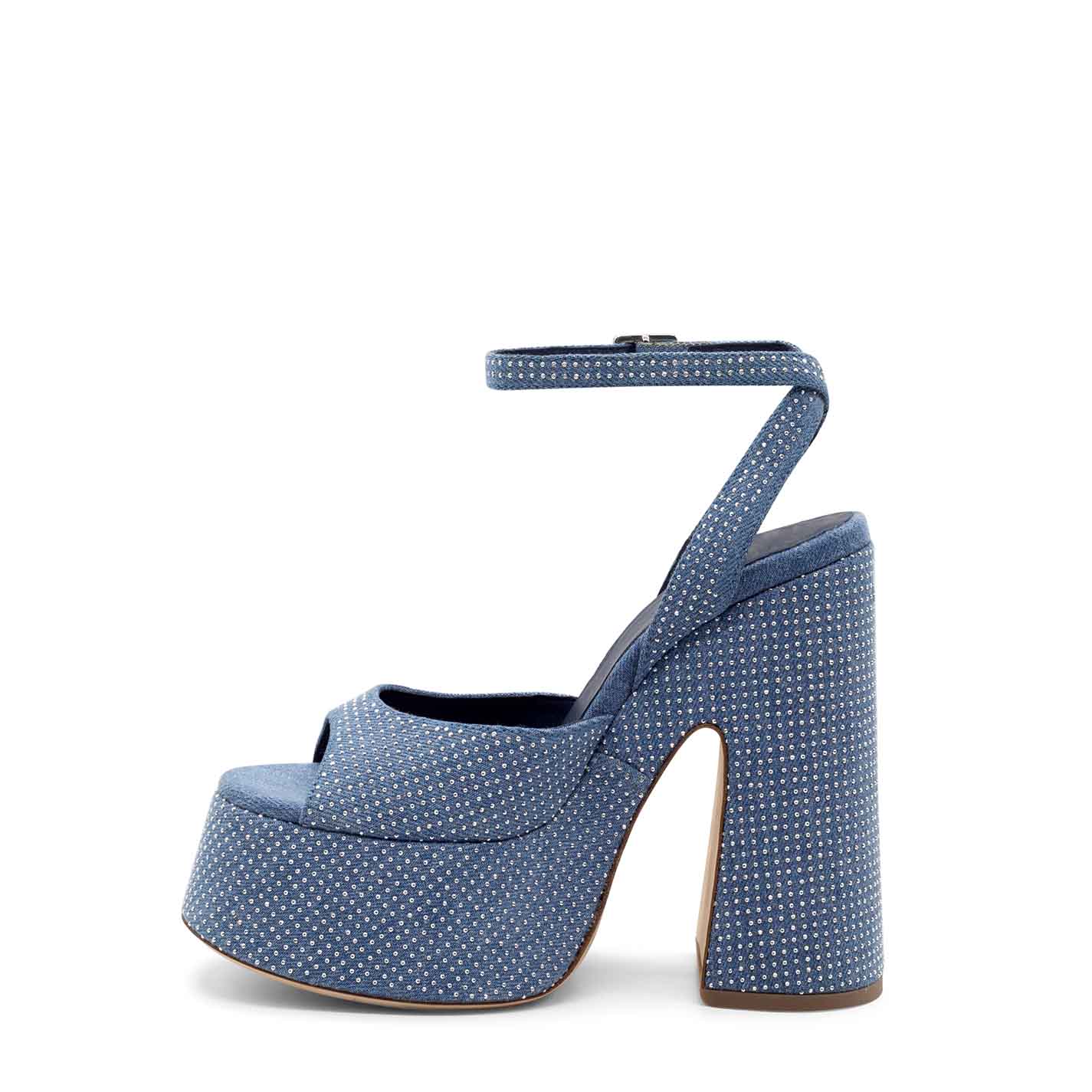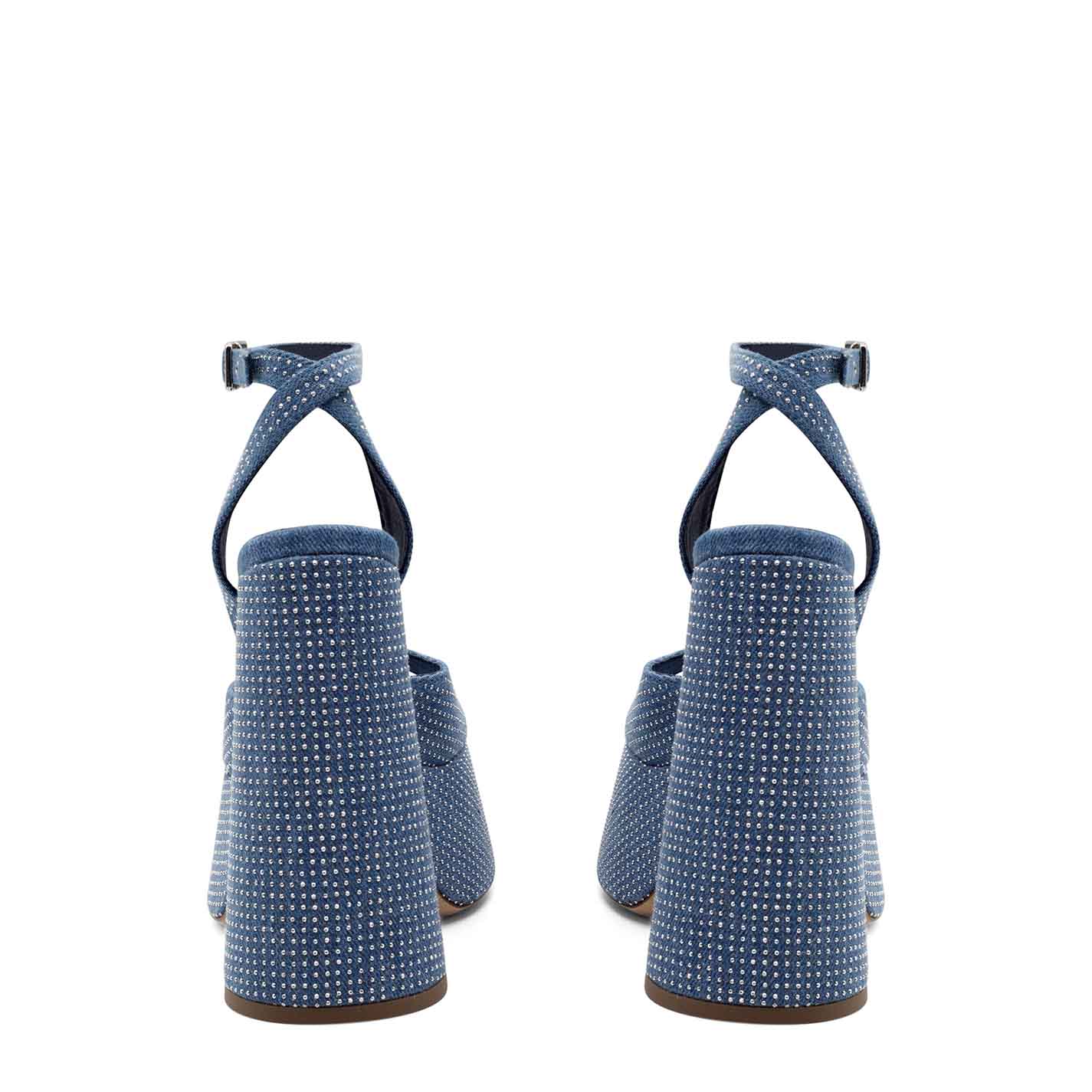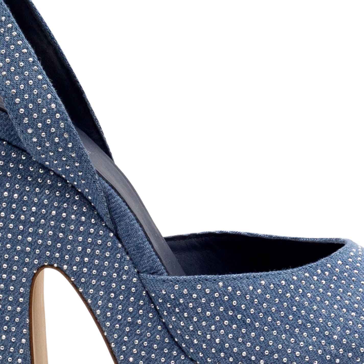 Flared sandals in light blue washed denim, embellished all over with silver micro studs. Adjustable ankle strap. Leather sole and leather-covered, one-piece "flared" platform. Made in Italy.