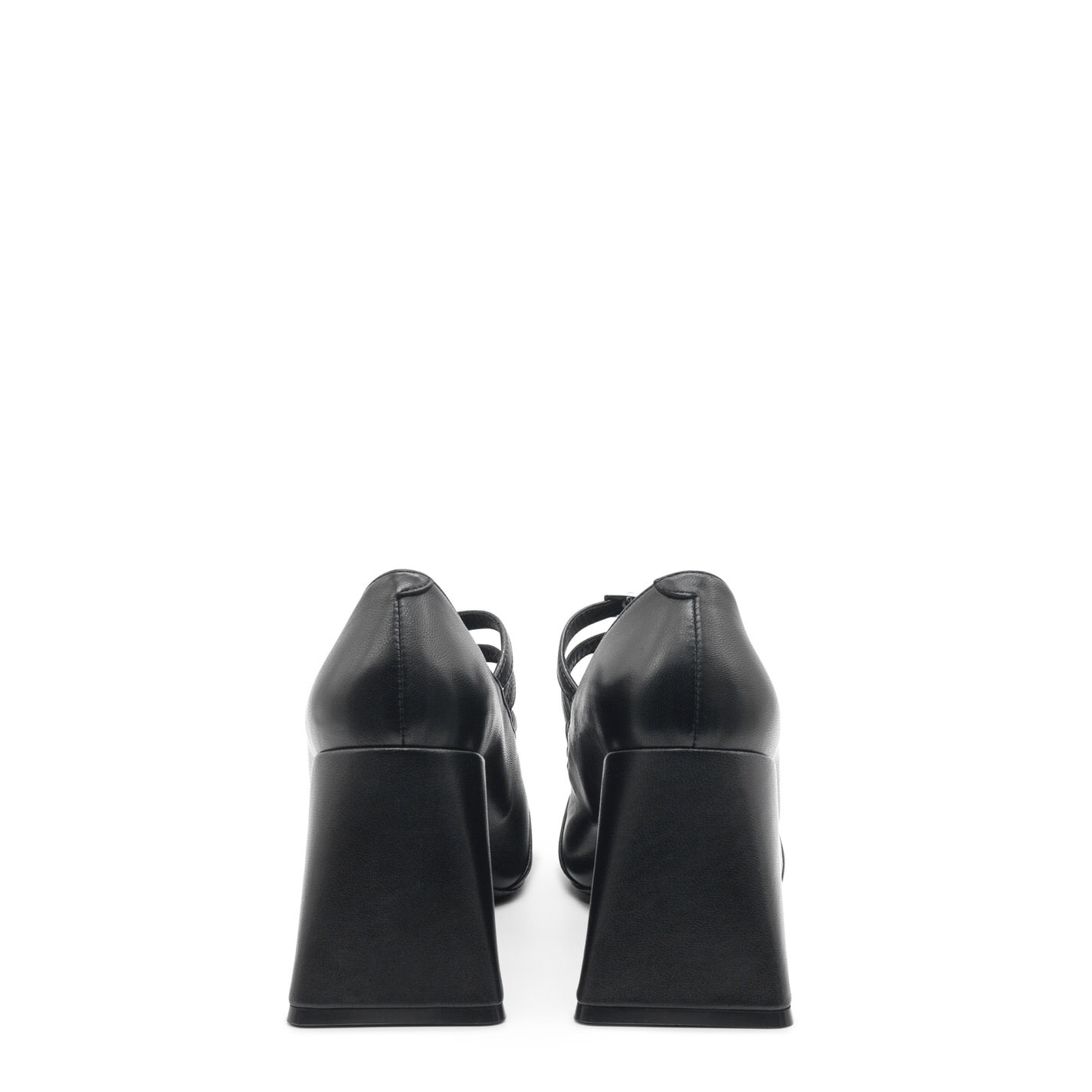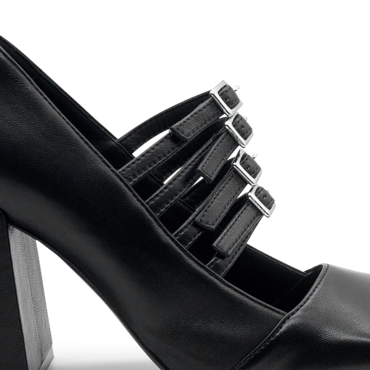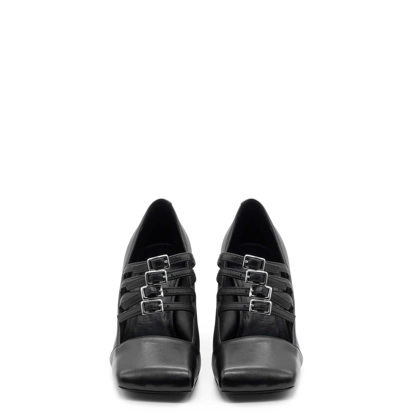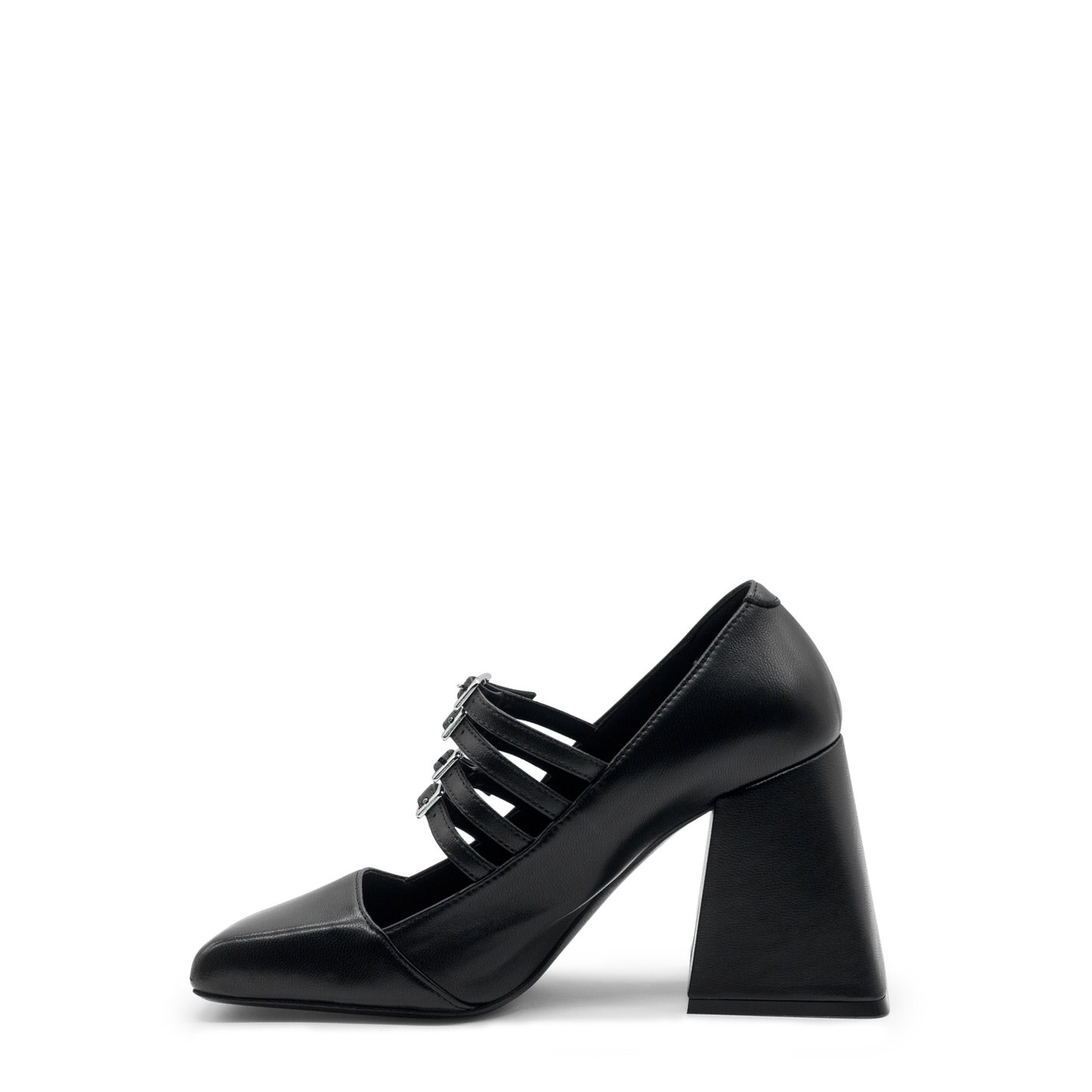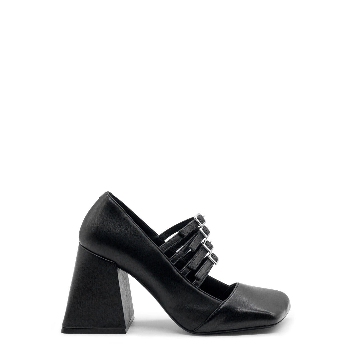 Ming black shiny Nappa leather pumps, with 4 adjustable straps with buckles. This model features a leather sole, square flared heel with leather cover and asymmetrical toe-cap. Made in Italy.