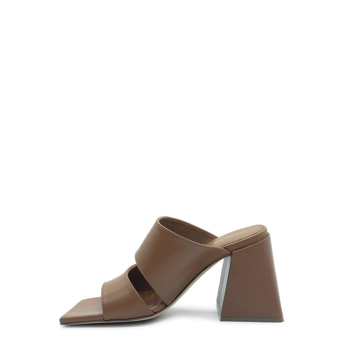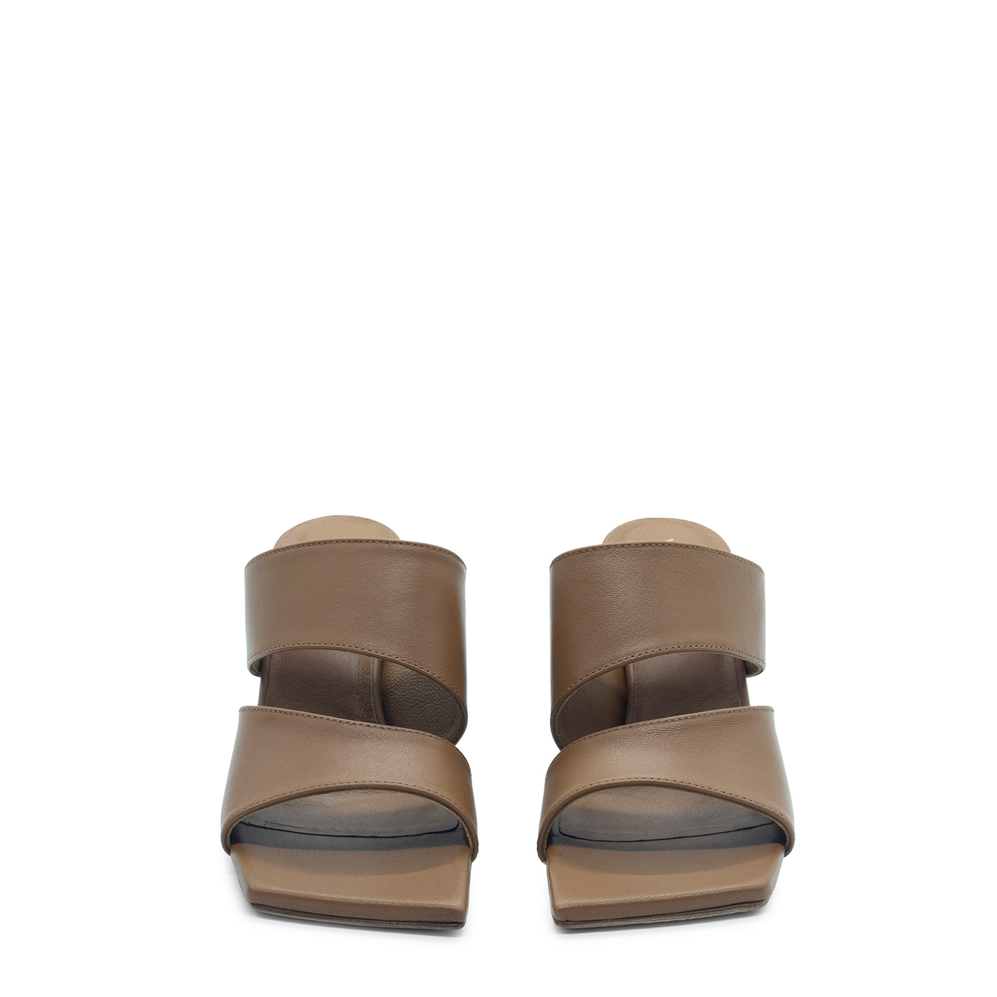 Ming open leather sandal , made of nappa leather, composed of irregular clashed bands that embrace the foot. Leather sole, squared bell-shaped heel wrapped in leather, asymmetrical toe. Comfort insole. Made in Italy.
