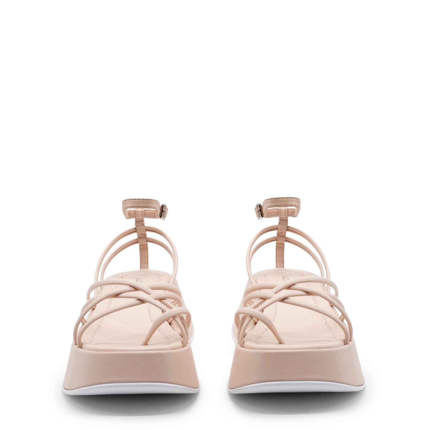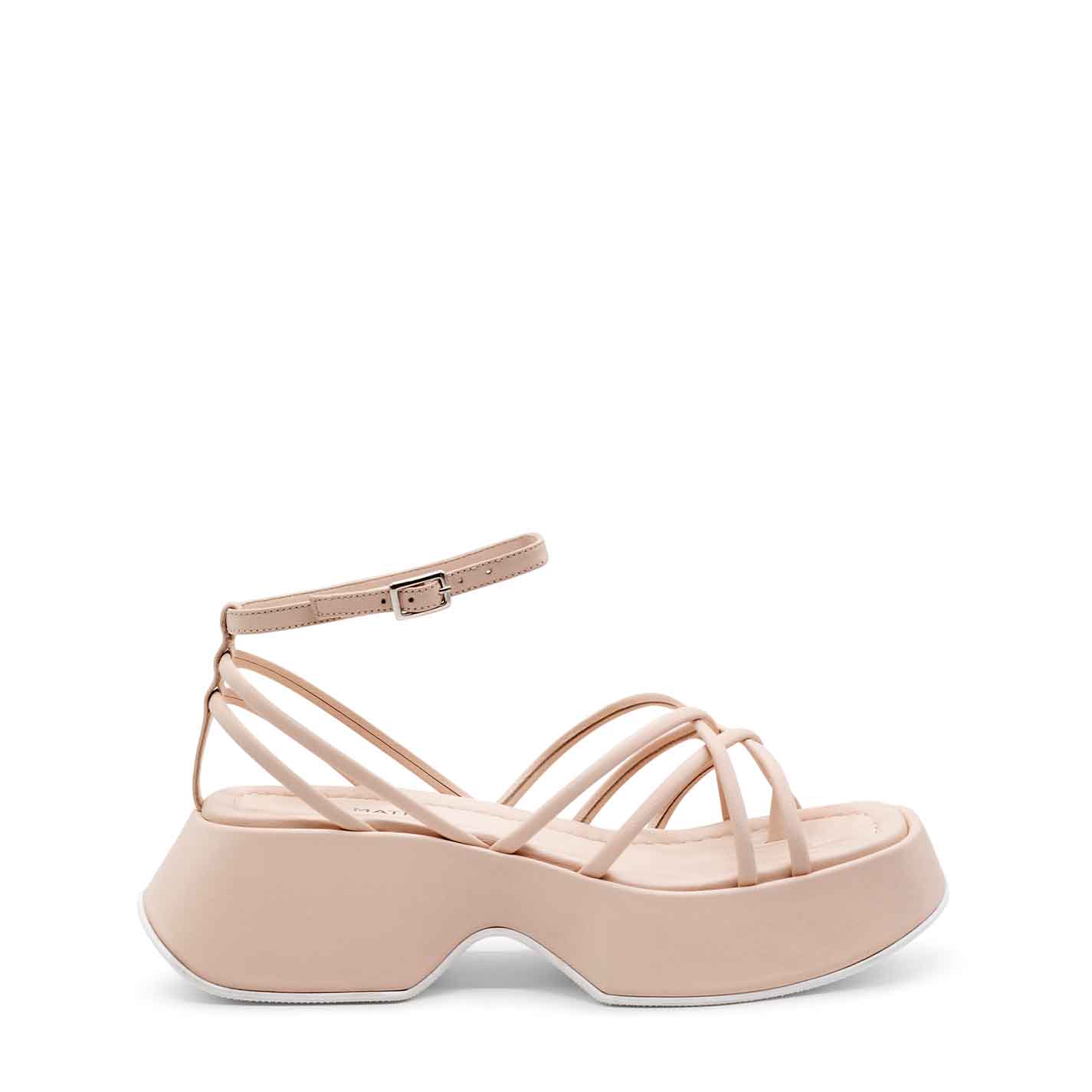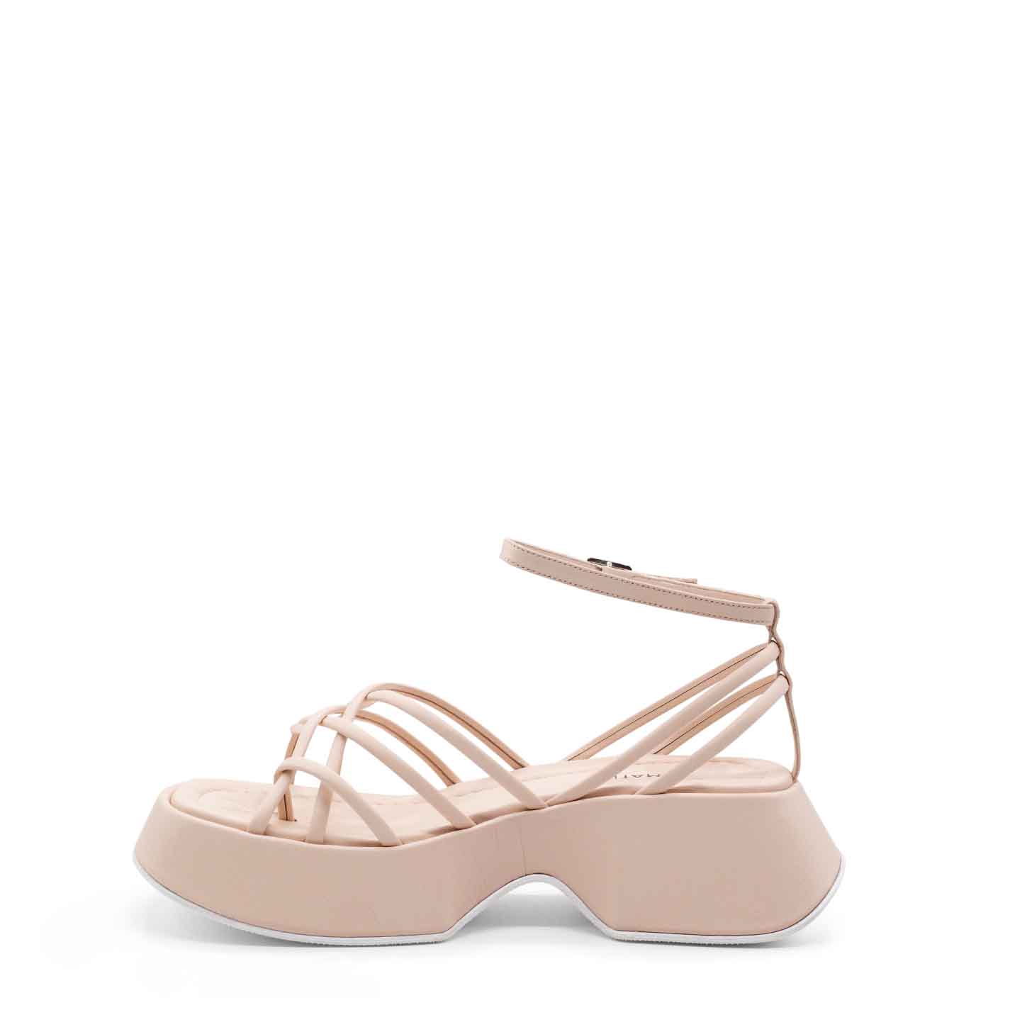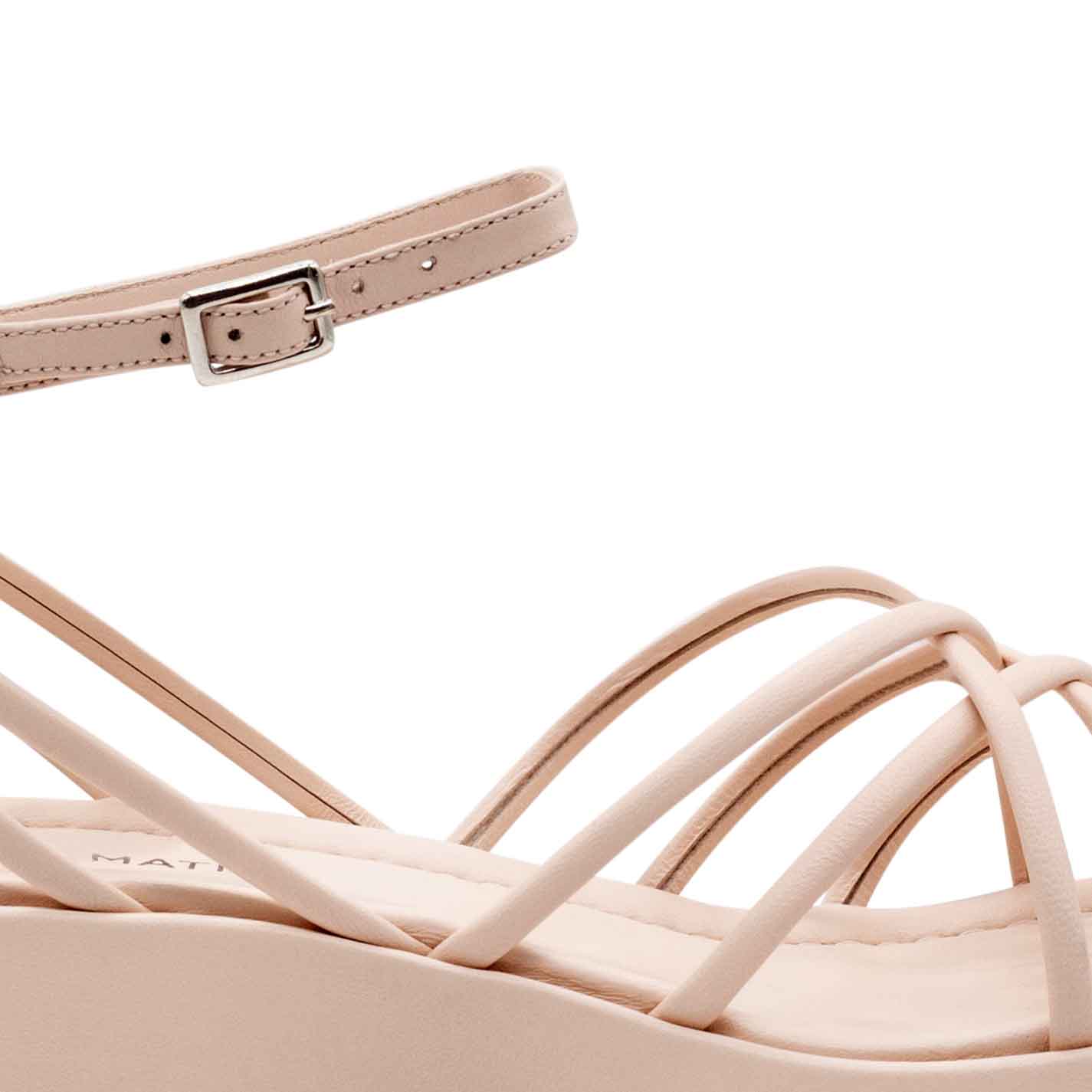 Mini Yoko sandals in light pink nappa leather, with intertwining strips that form a cage. "Flared" platform covered with the same leather used for the upper. Comfortable padded insole. Rubber sole with non-slip texture. Made in Italy.