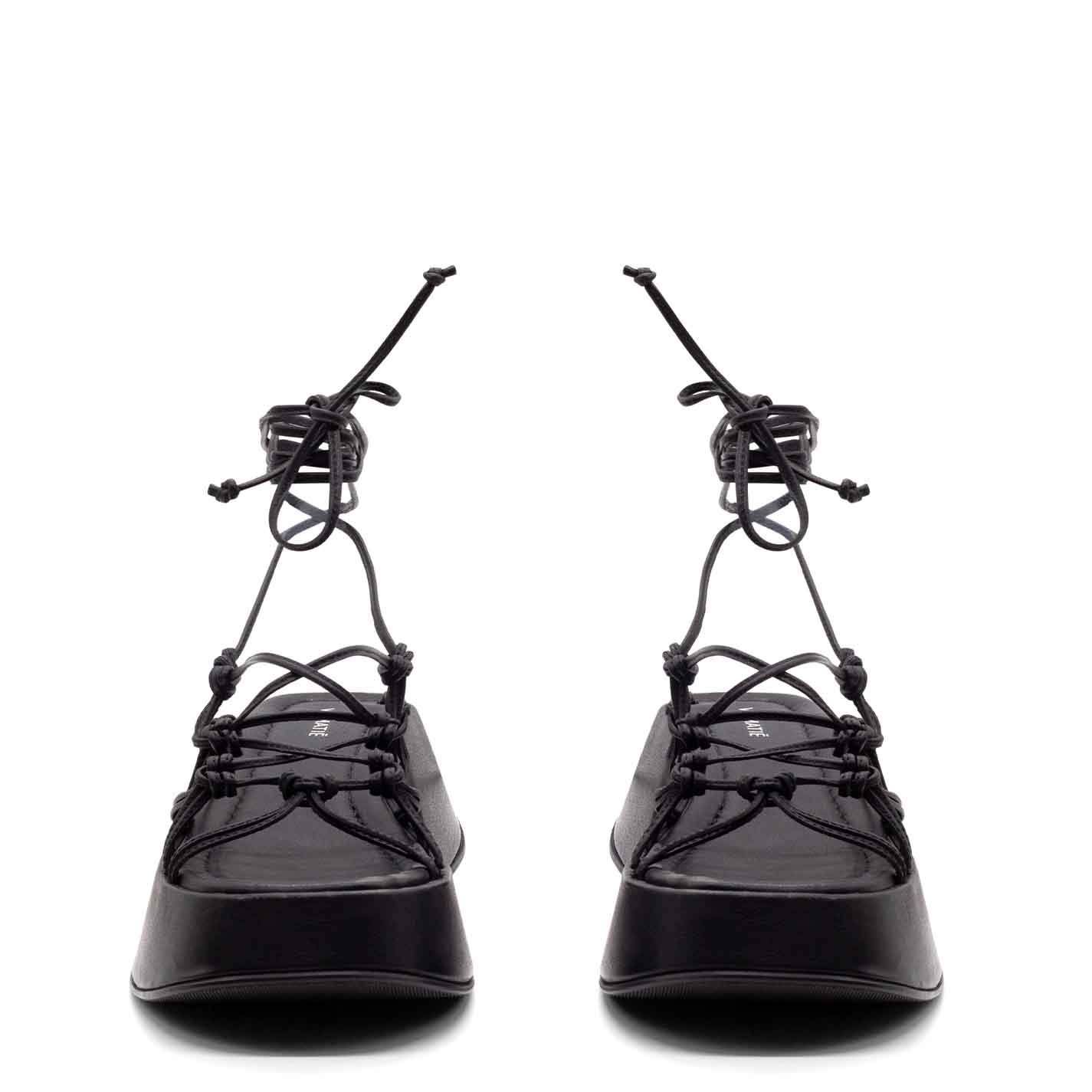 Mini Yoko criss-cross sandals in soft black nappa calfskin, with knotted leather lacing fastened at the ankle. "Flared" platform covered with the same leather used for the upper. Comfortable padded insole. Rubber sole with non-slip texture. Made in Italy.