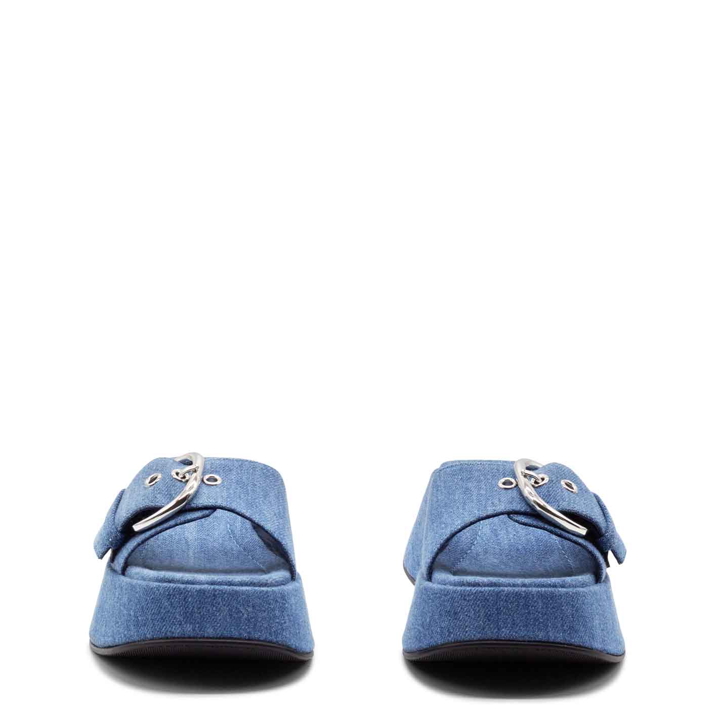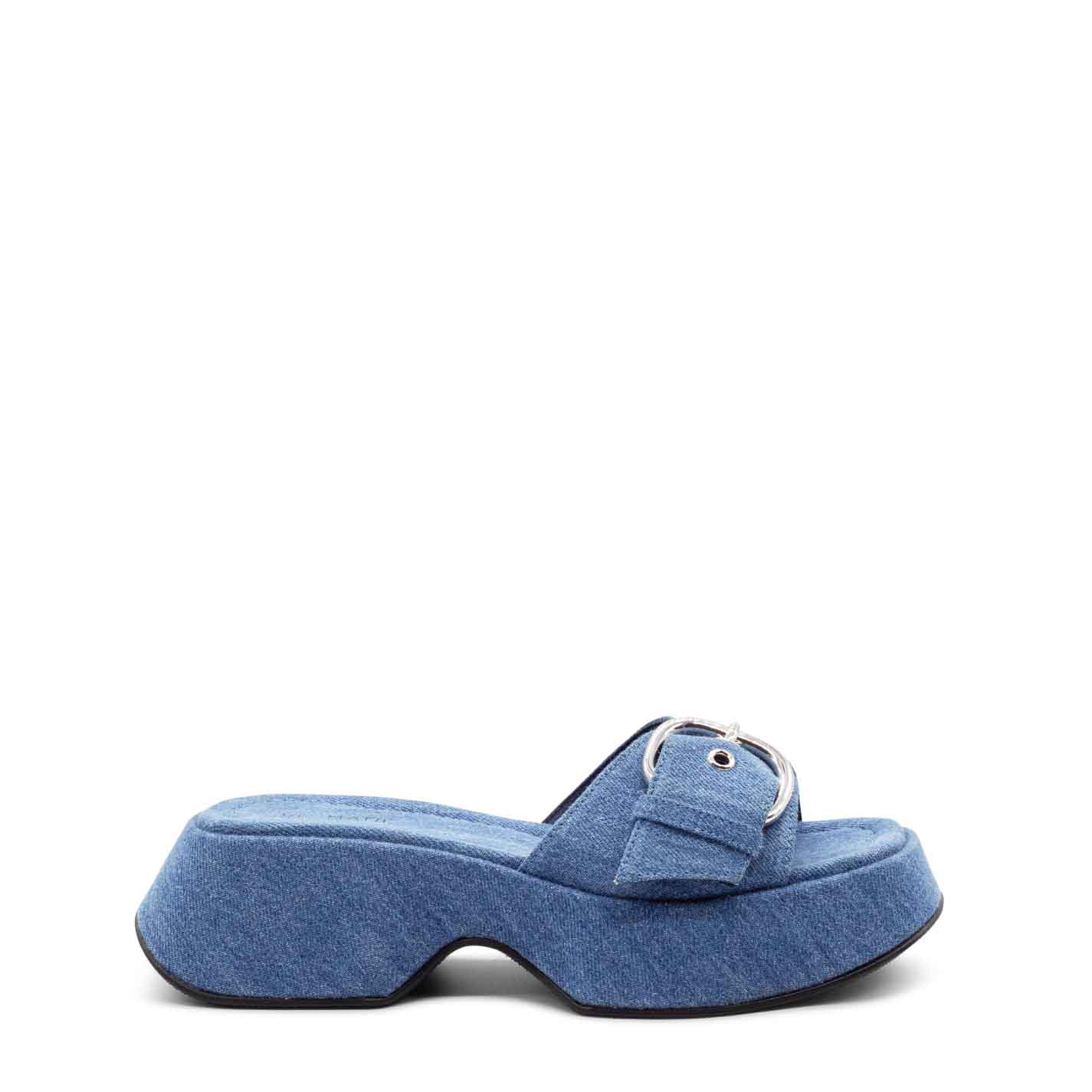 Mini Yoko slipper in light blue washed denim with buckle and eyelet-adjustable strap. "Flared" platform covered with the same leather used for the upper. Comfortable padded insole. Rubber sole with non-slip texture. Made in Italy.