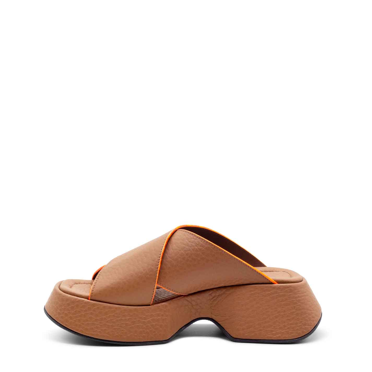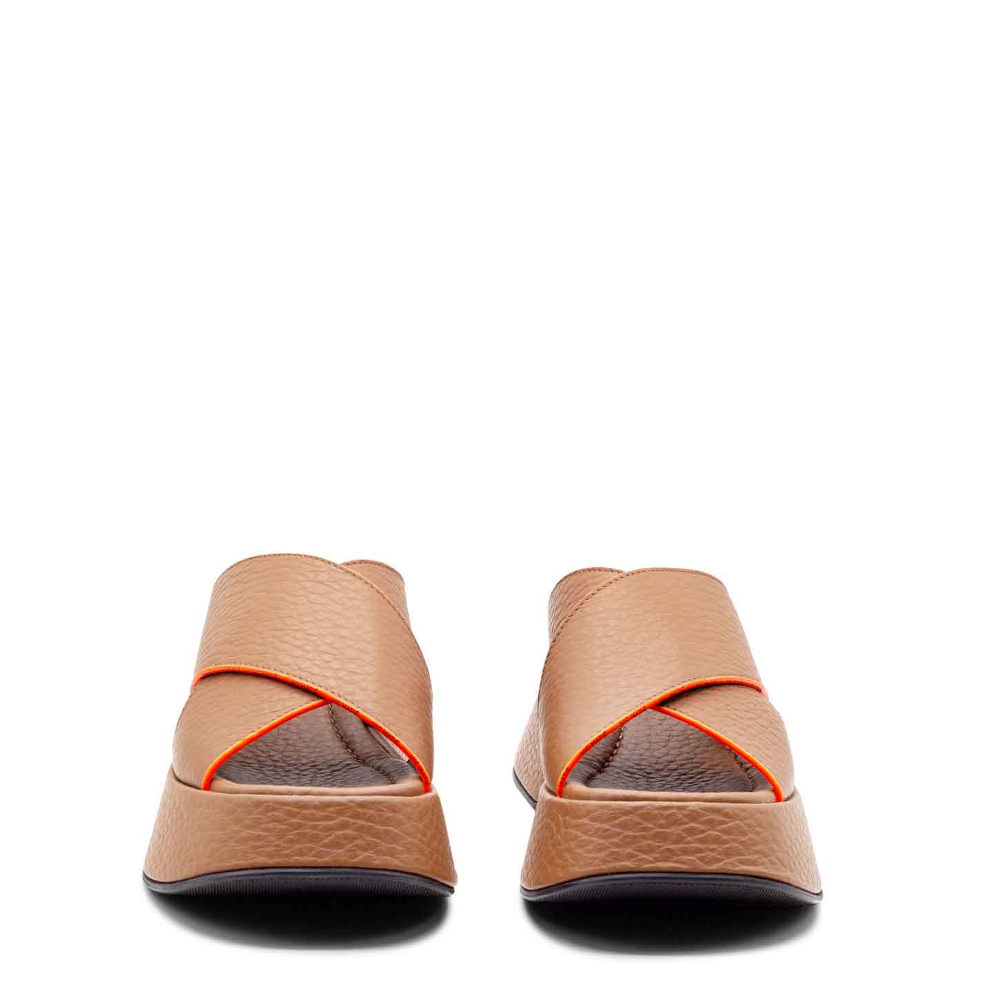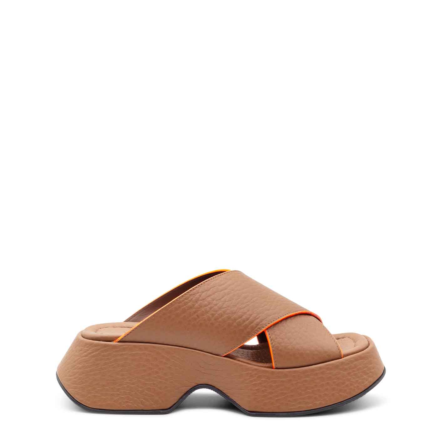 Mini Yoko tobaco-brown branded slip-ons in coarse-grained calfskin, with smooth contrasting-colour edging, top band embellished with small logos and "flared" platform covered with the same leather used for the upper. Comfortable padded insole. Rubber sole with non-slip texture. Made in Italy.