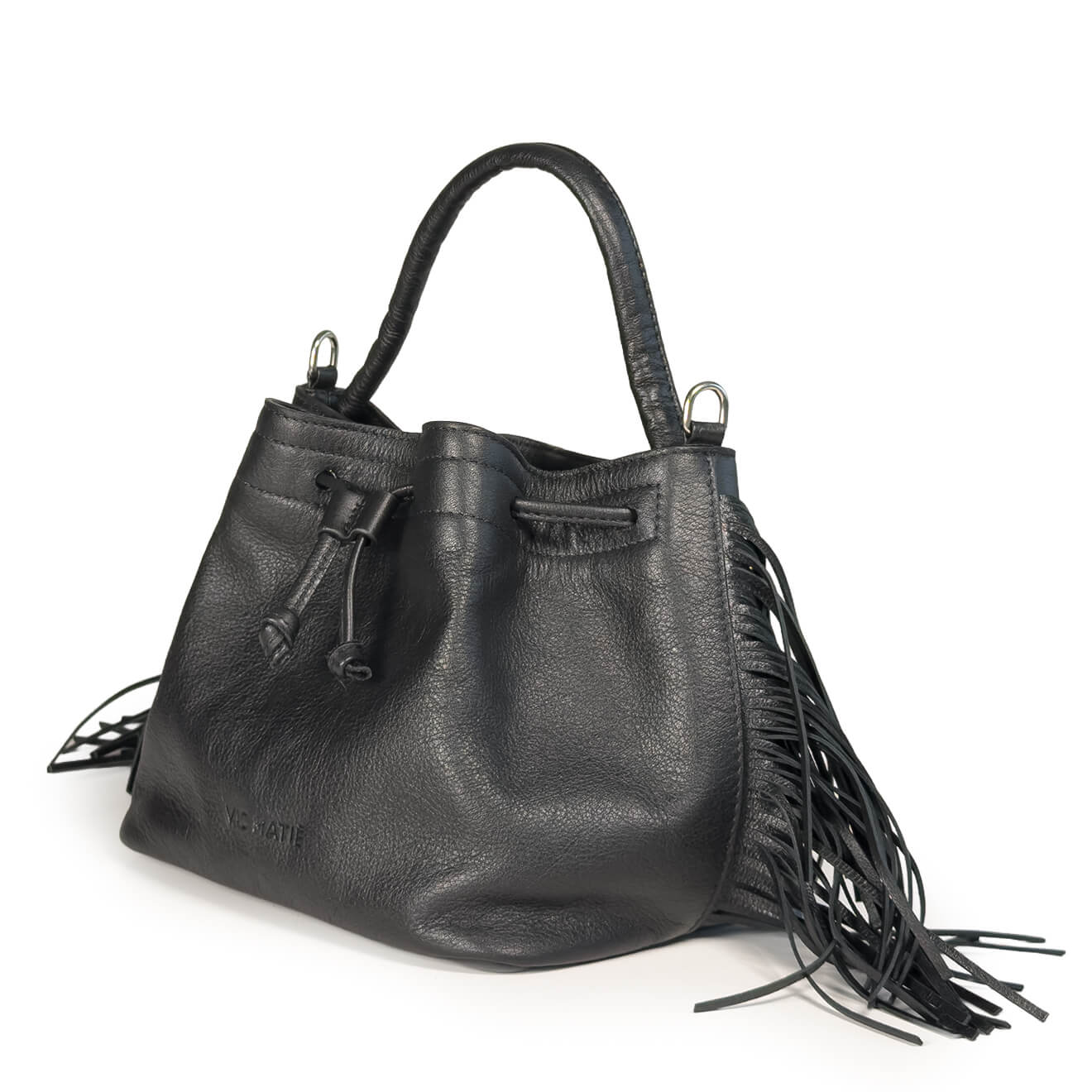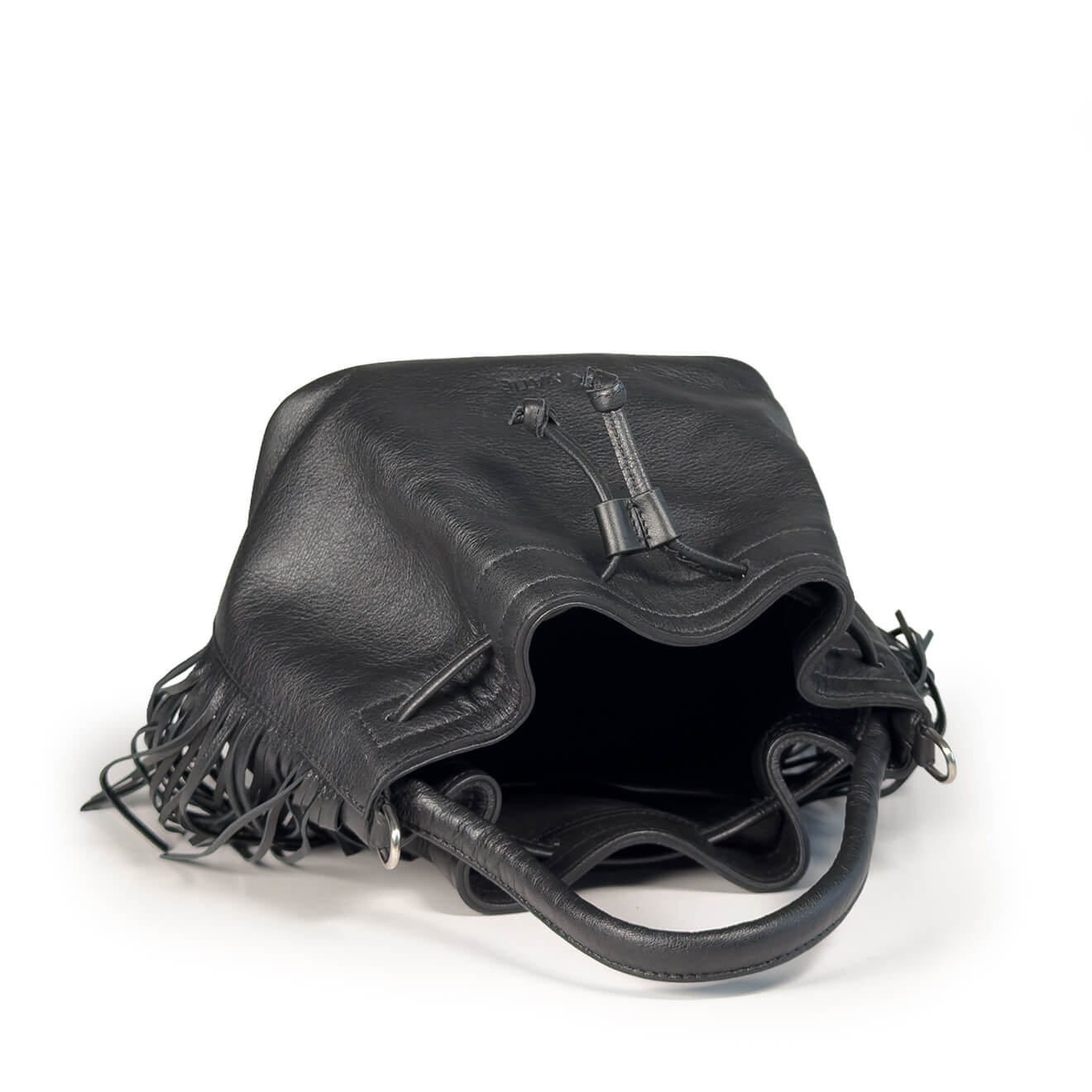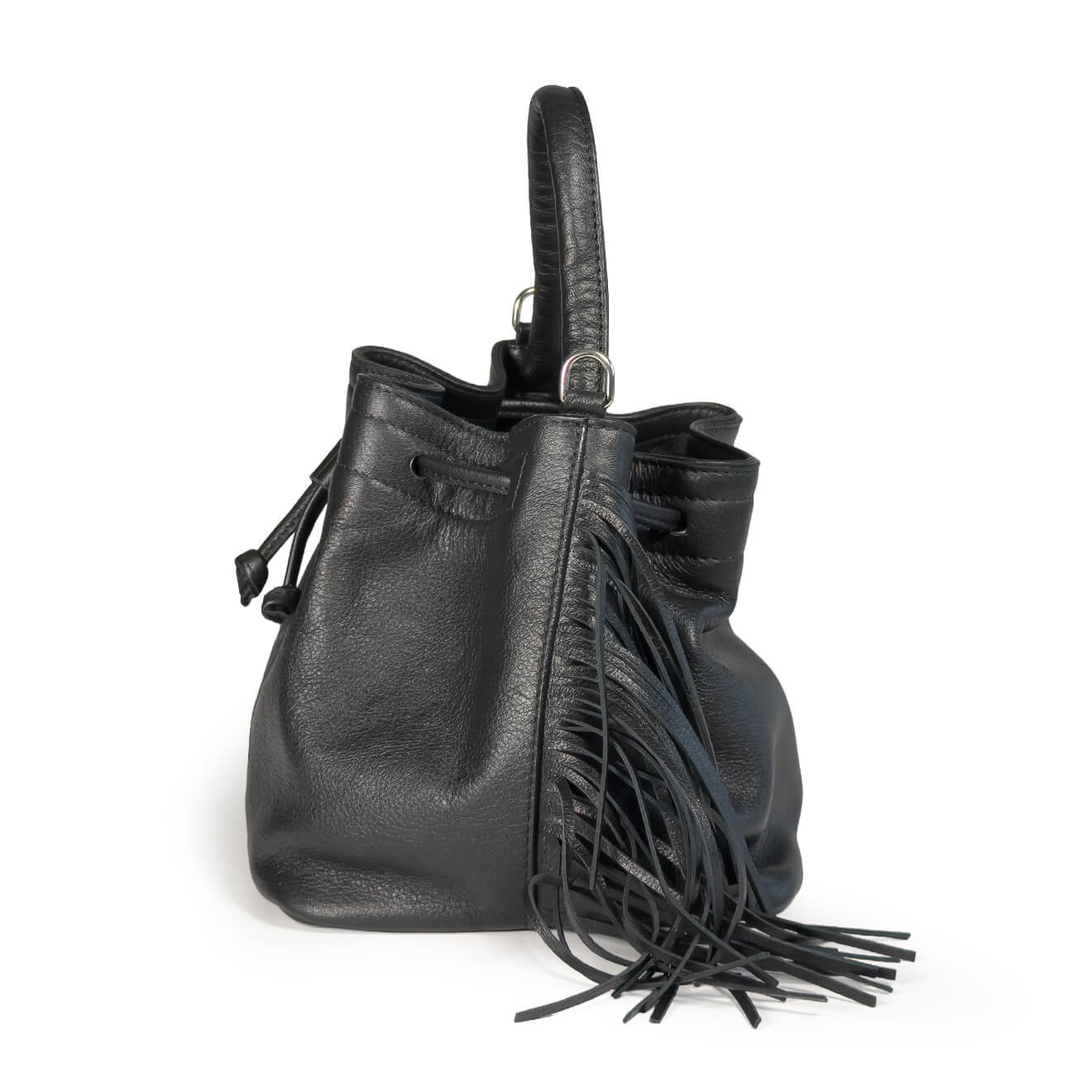 Soft black leather bucket bag, made of soft leather, this boho-chic bag is enhanced by side fringes that add movement and personality. The drawstring closure, the single handle for hand carry and the removable shoulder strap make the model practical and versatile. Small, lightweight and functional, it is ideal for those seeking an informal style without giving up practicality.
