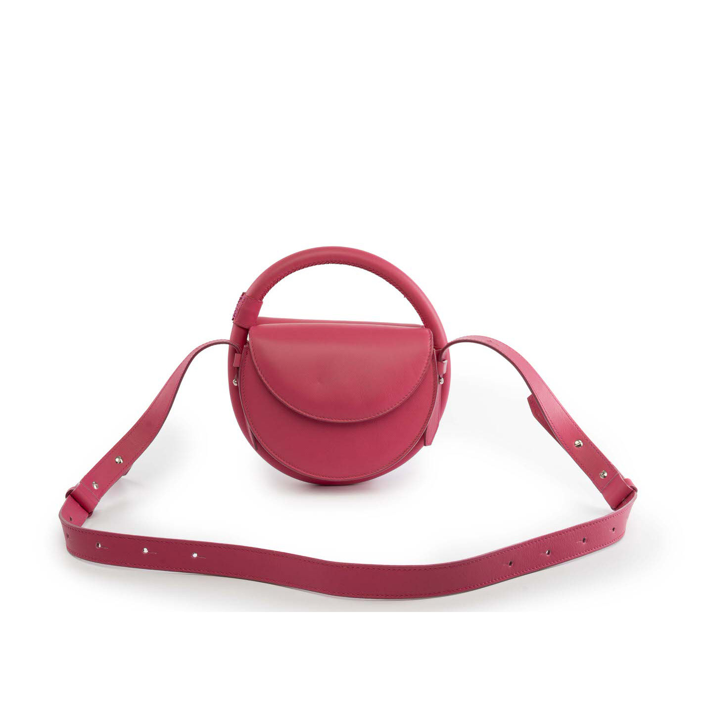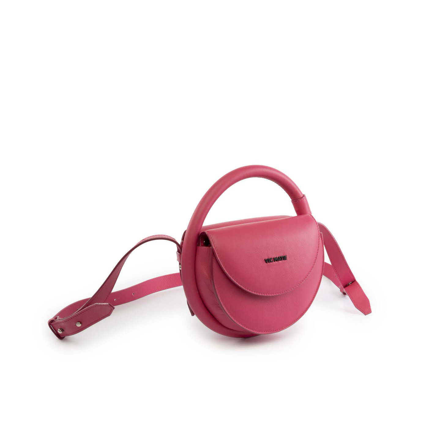 Hibiscus two-style shoulder bag in nappa calfskin, with half-moon shape and leather-covered ring handle. Double flap with inner compartment. Removable and adjustable shoulder strap. Embellished with metal logo on the front.