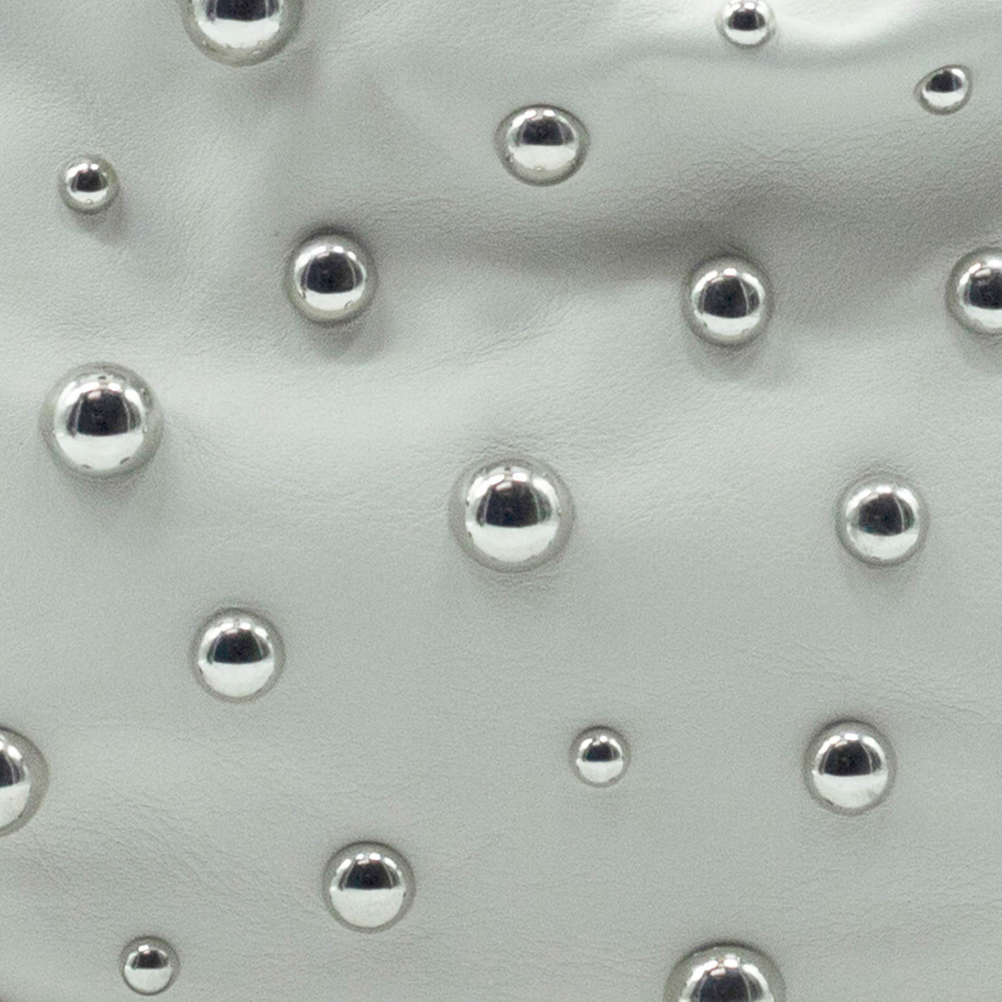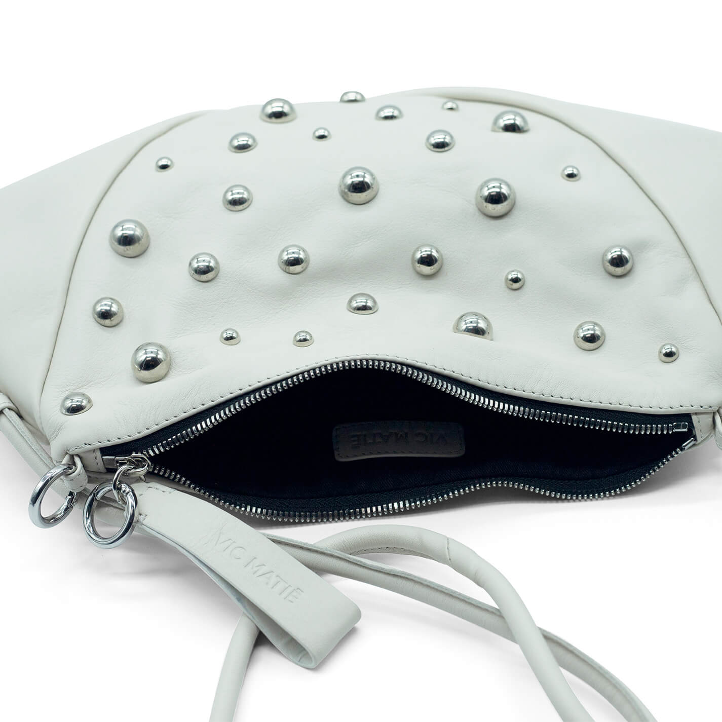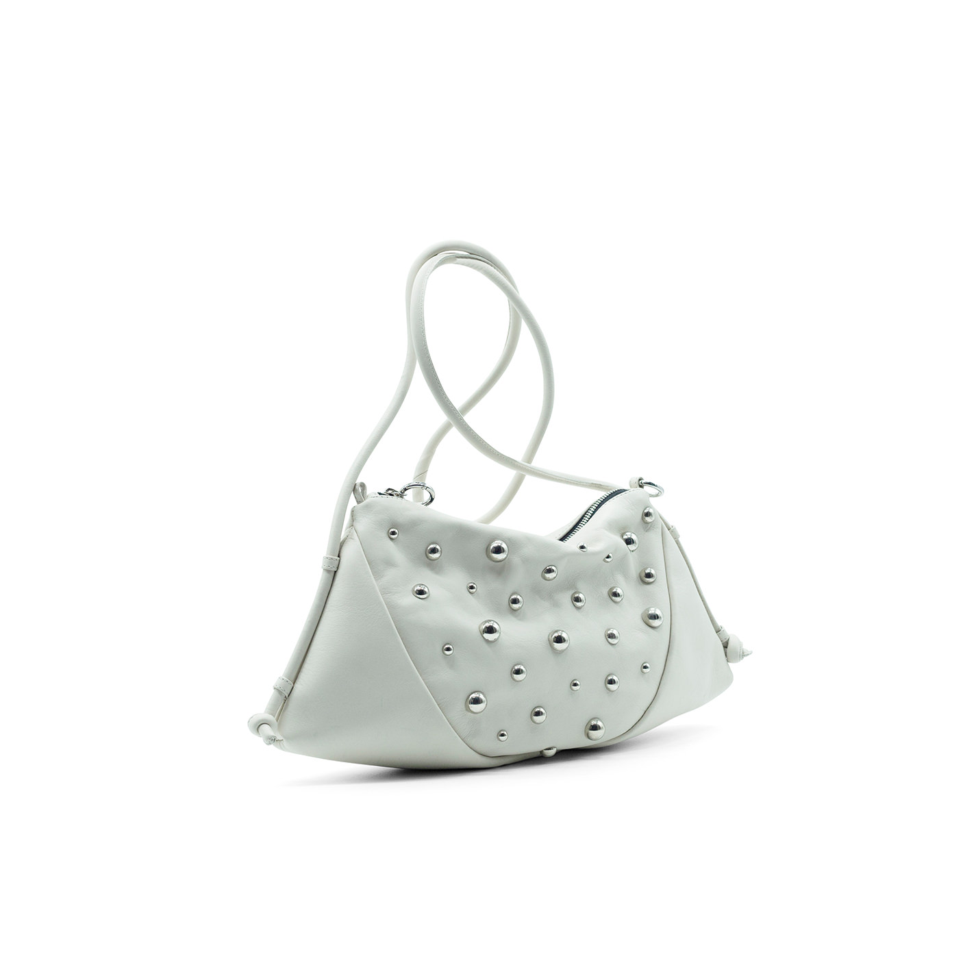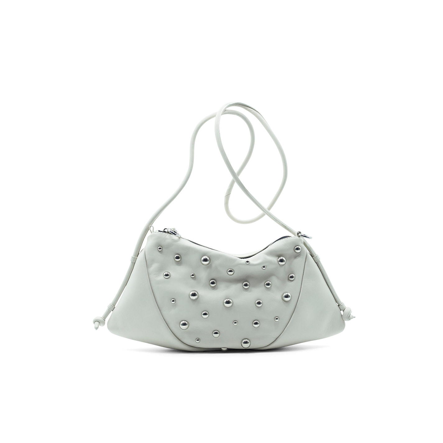 Cream shoulder bag with studsin soft calfskin with fixed knotted shoulder strap and silver-coloured spherical studs. Closure with metal zip and ring snap hooks that can be attached to themselves.