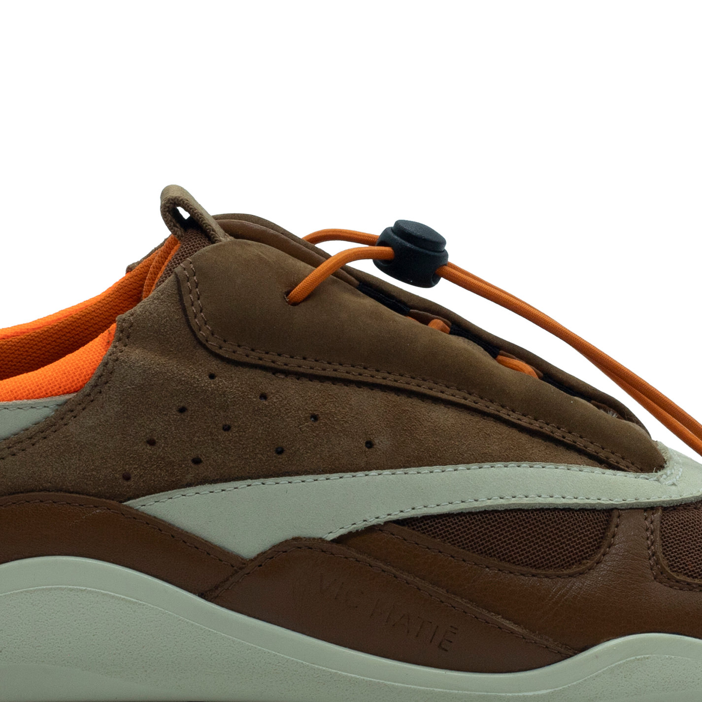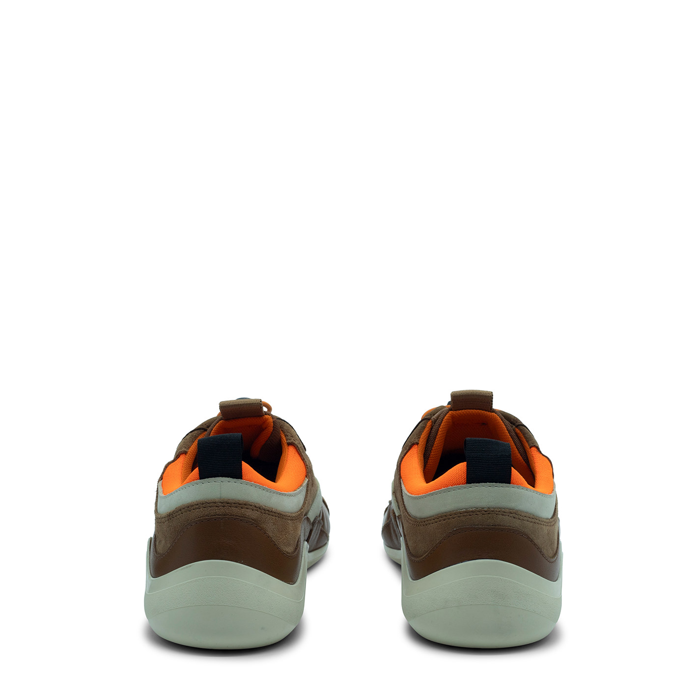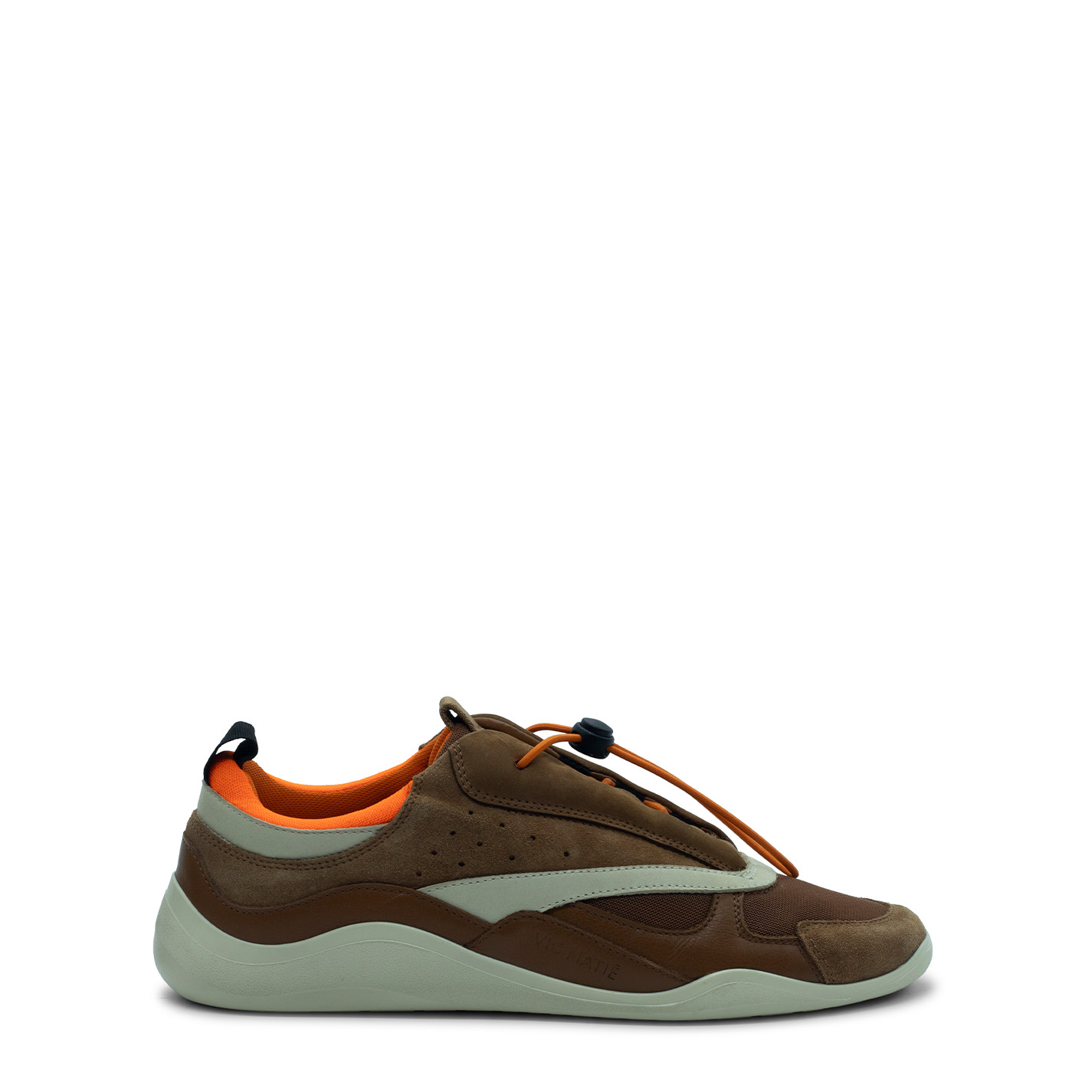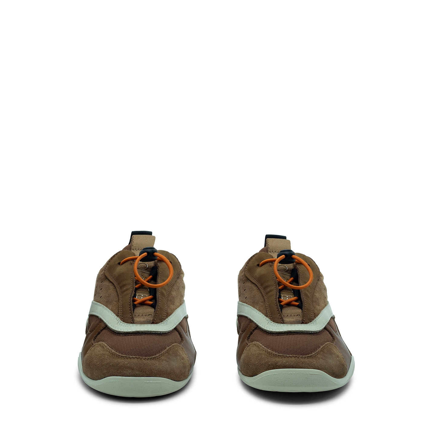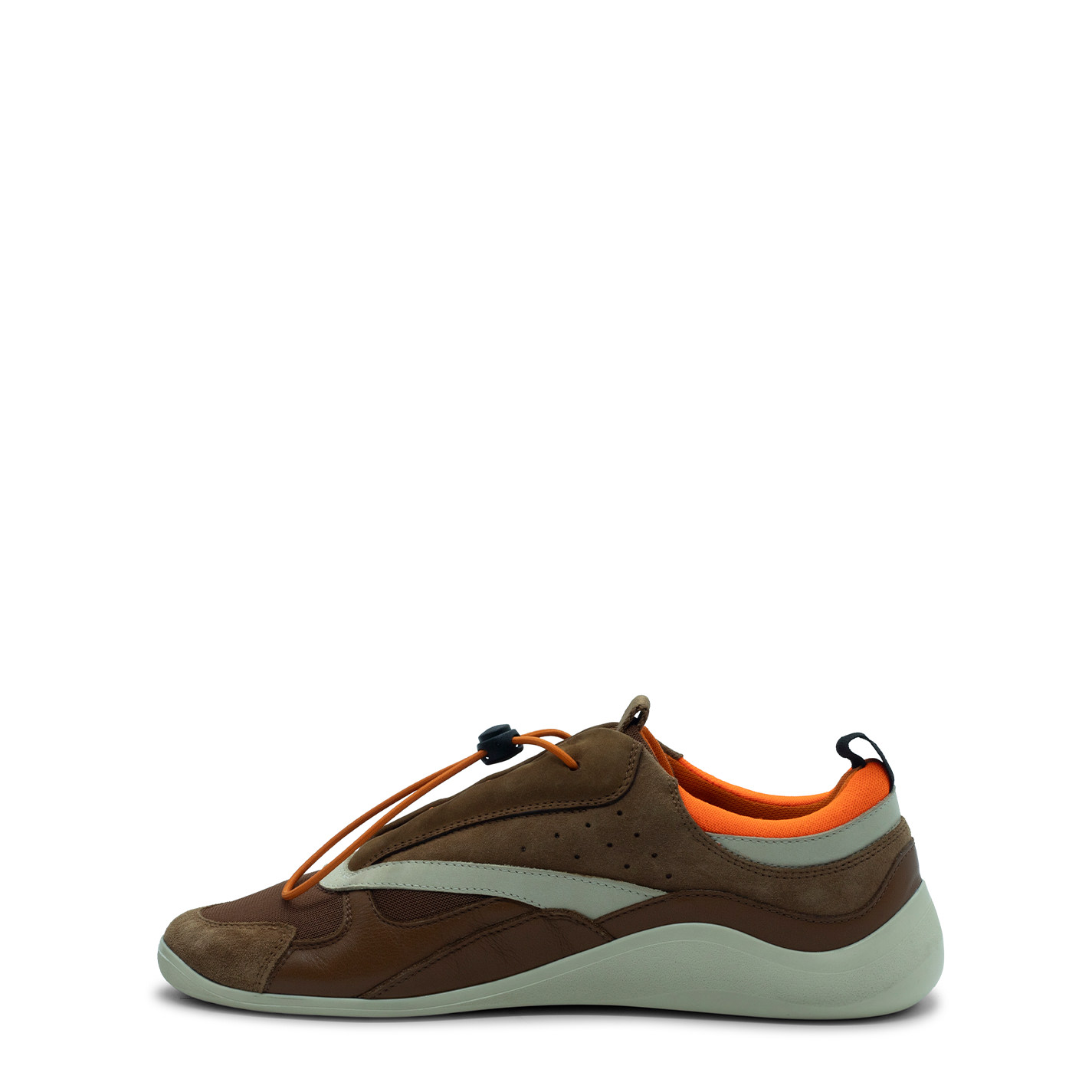 Ondina sneakers leather/ecru/orangein split, calfskin and mesh with laminated inserts. Concealed lacing with elastic string locked by drawstring pull. Side cuffs perforated to ensure breathability;