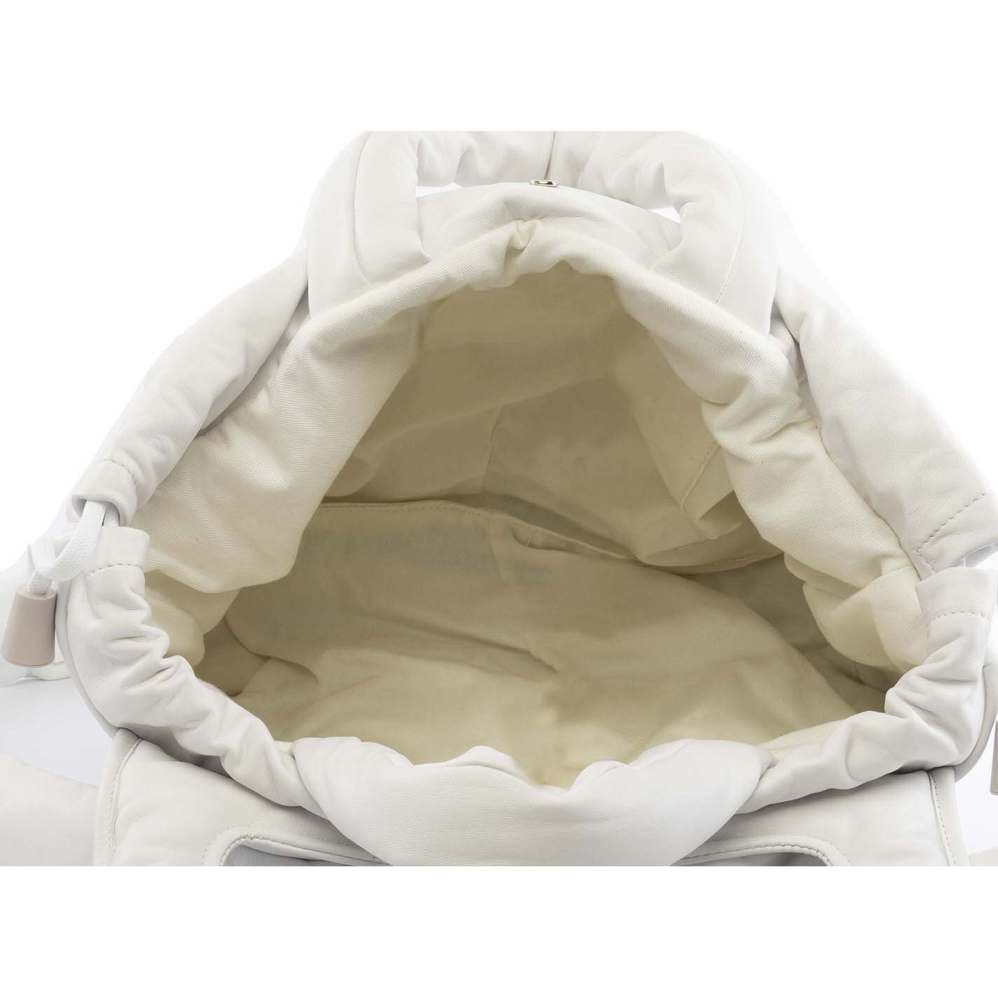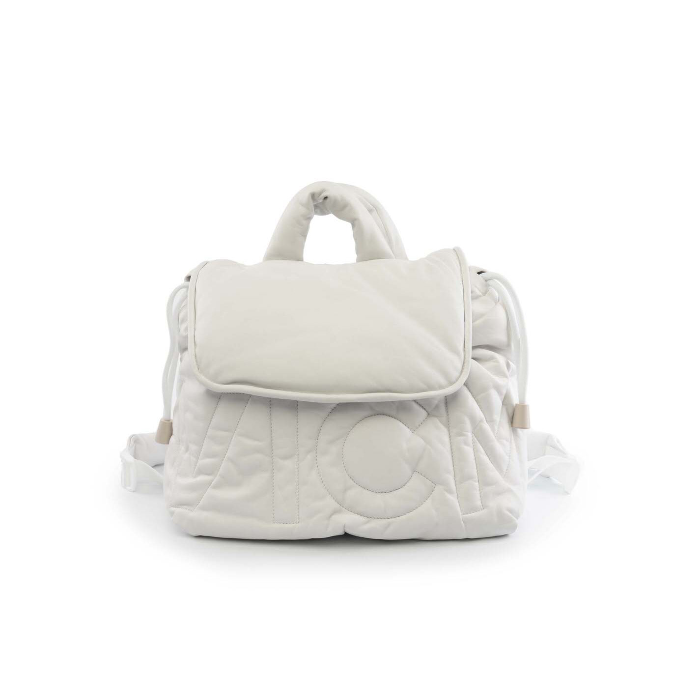 White backpack in padded nappa leather. Inner press-stud and drawstring fastening, flap with hole to thread handles through, and leather shoulder straps. Large logo embroidery all over the body of the bag.