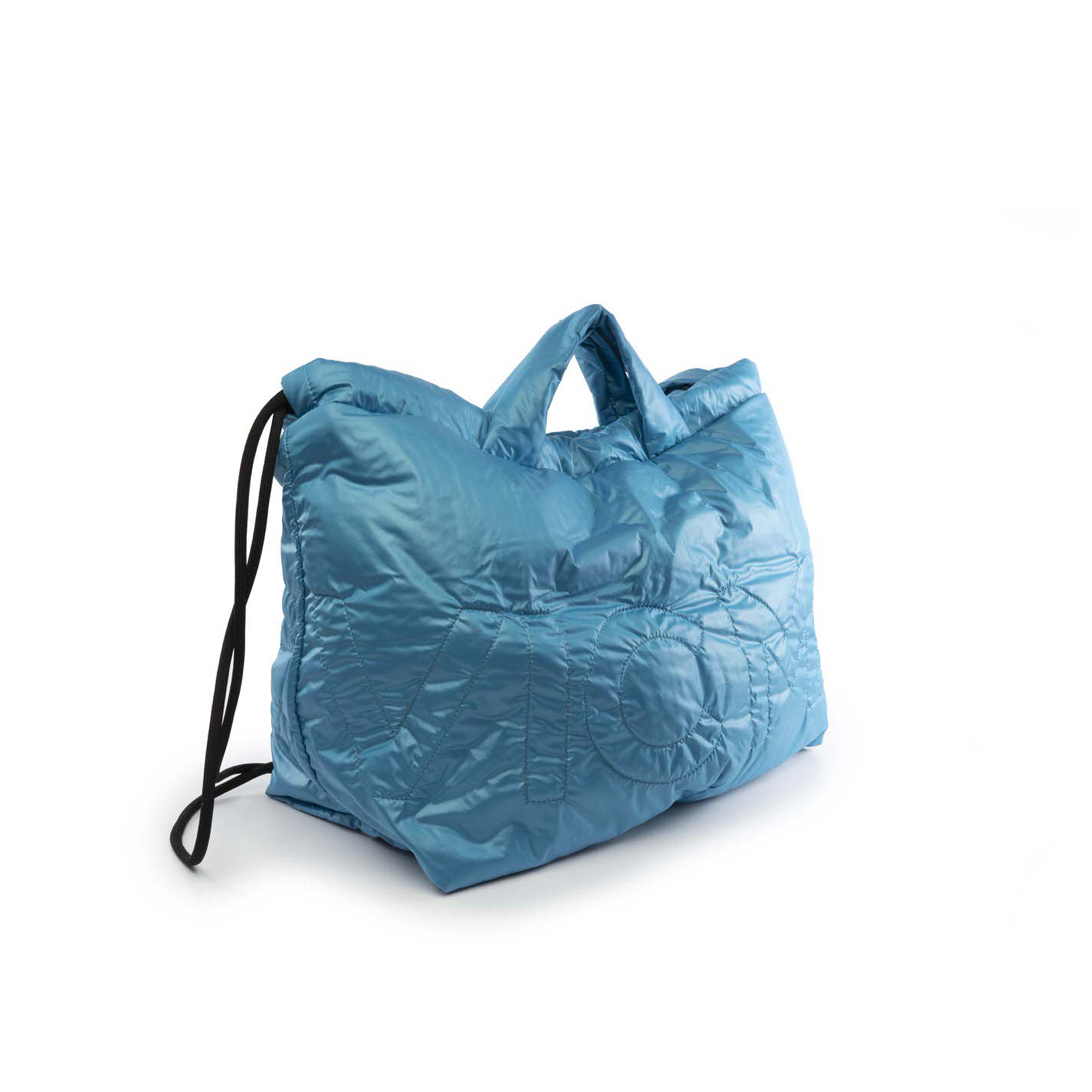 Branded turquoise nylon bag/backpack with tone-on-tone Vic Matié embroidery. Can be worn as a backpack thanks to the shoulder straps, and can be folded away into the useful travel pouch inside.