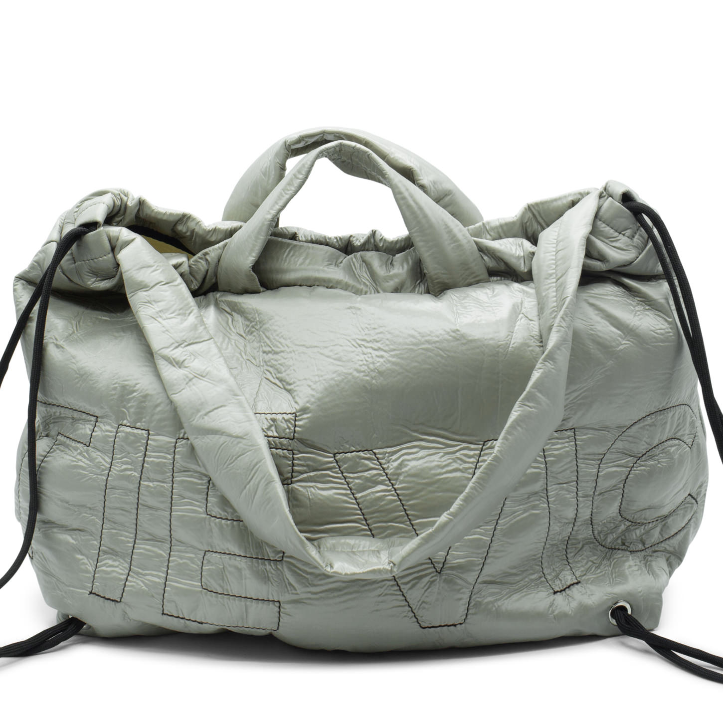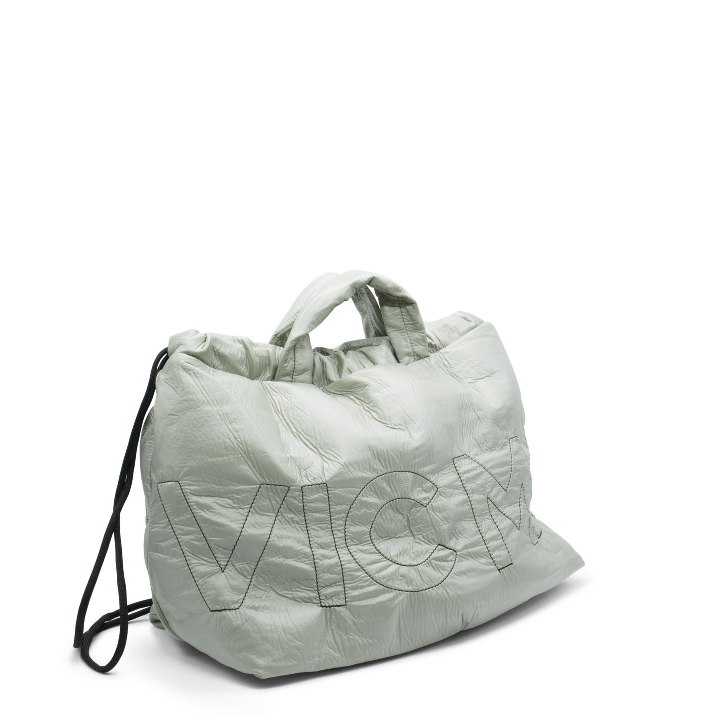 Dove grey branded nylon backpack bag, with tone-on-tone Vic Matié embroidery. It can be transformed into a backpack with the shoulder straps supplied, hidden in an internal pocket, to create the perfect travel bag.