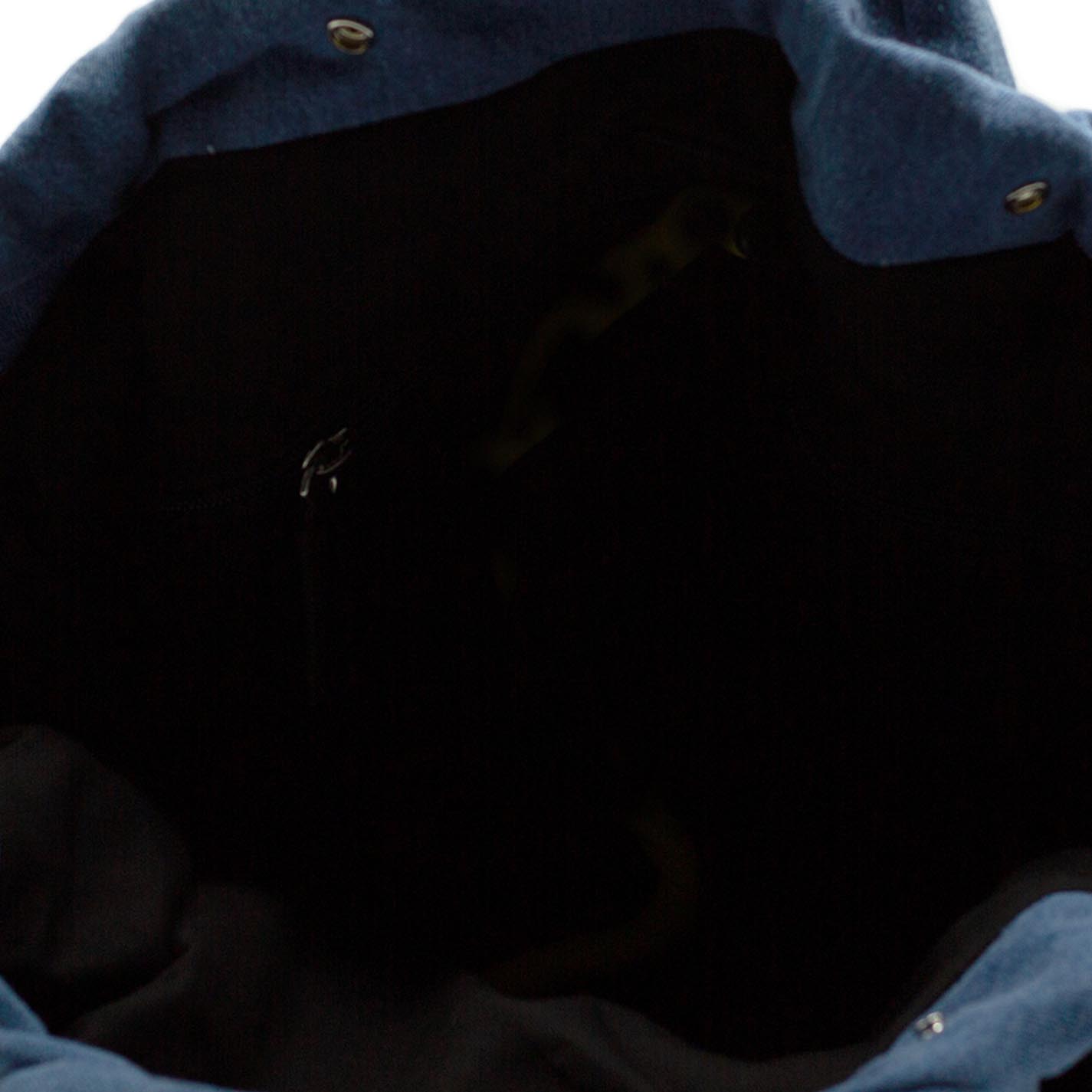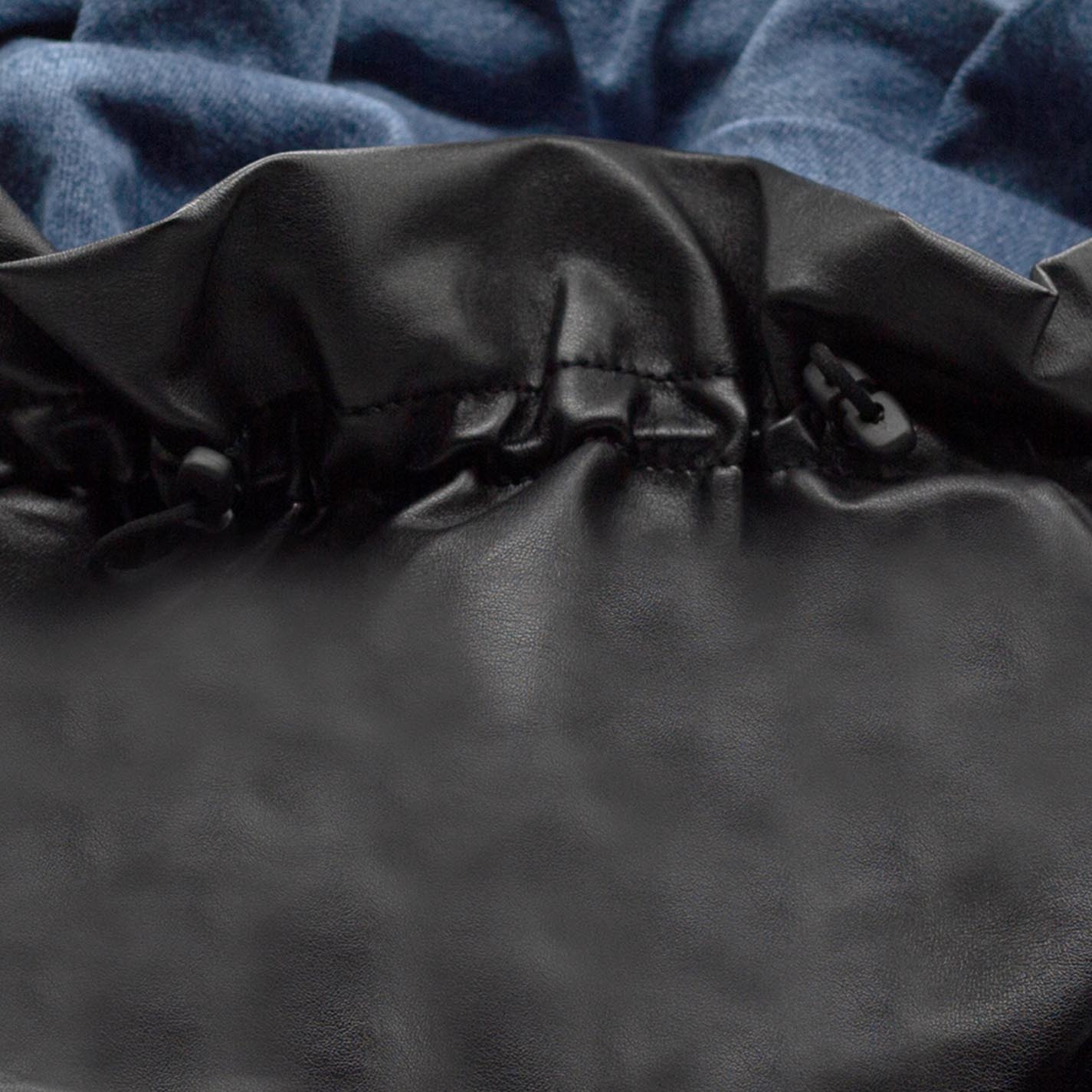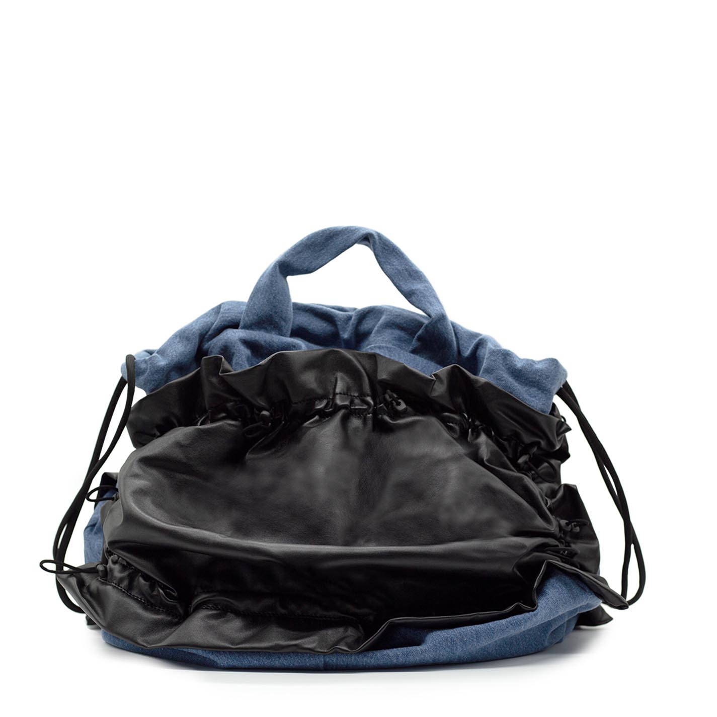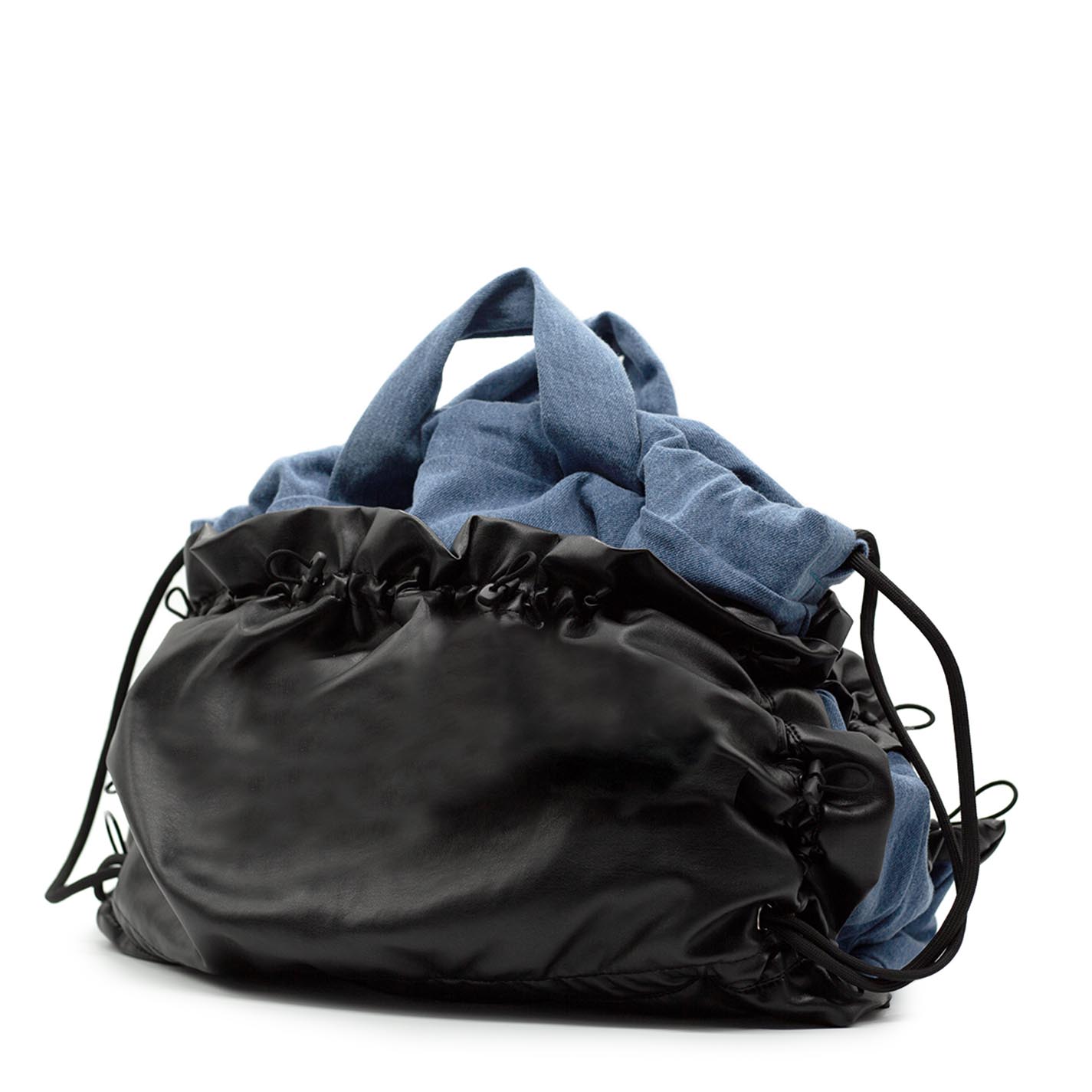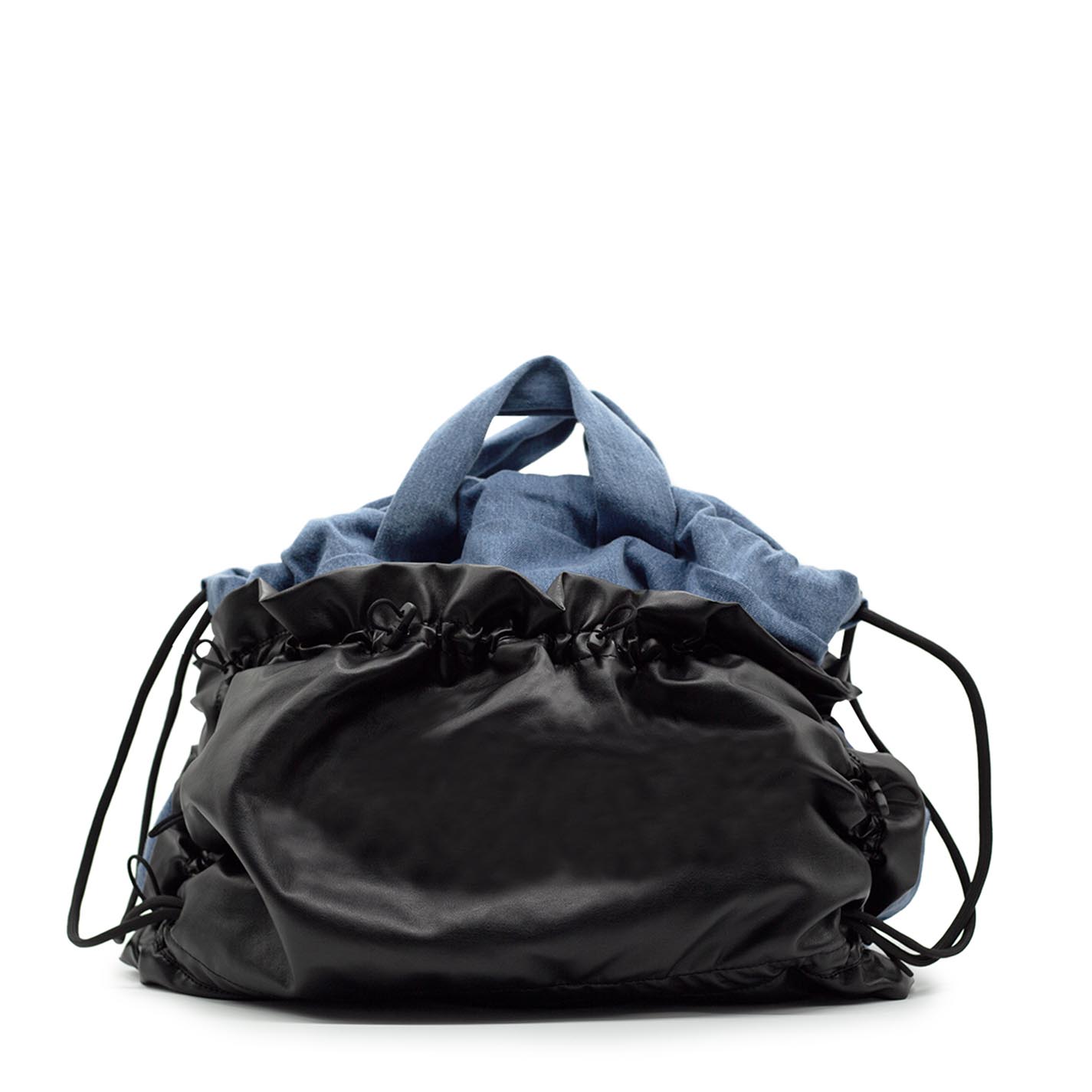 Light blue/black shopper bag in denim and synthetic nappa leather, with gathering created by multiple drawstrings and concealed press-stud fastening. Branded shoulder strap and string loops that allow you to wear it as a backpack.