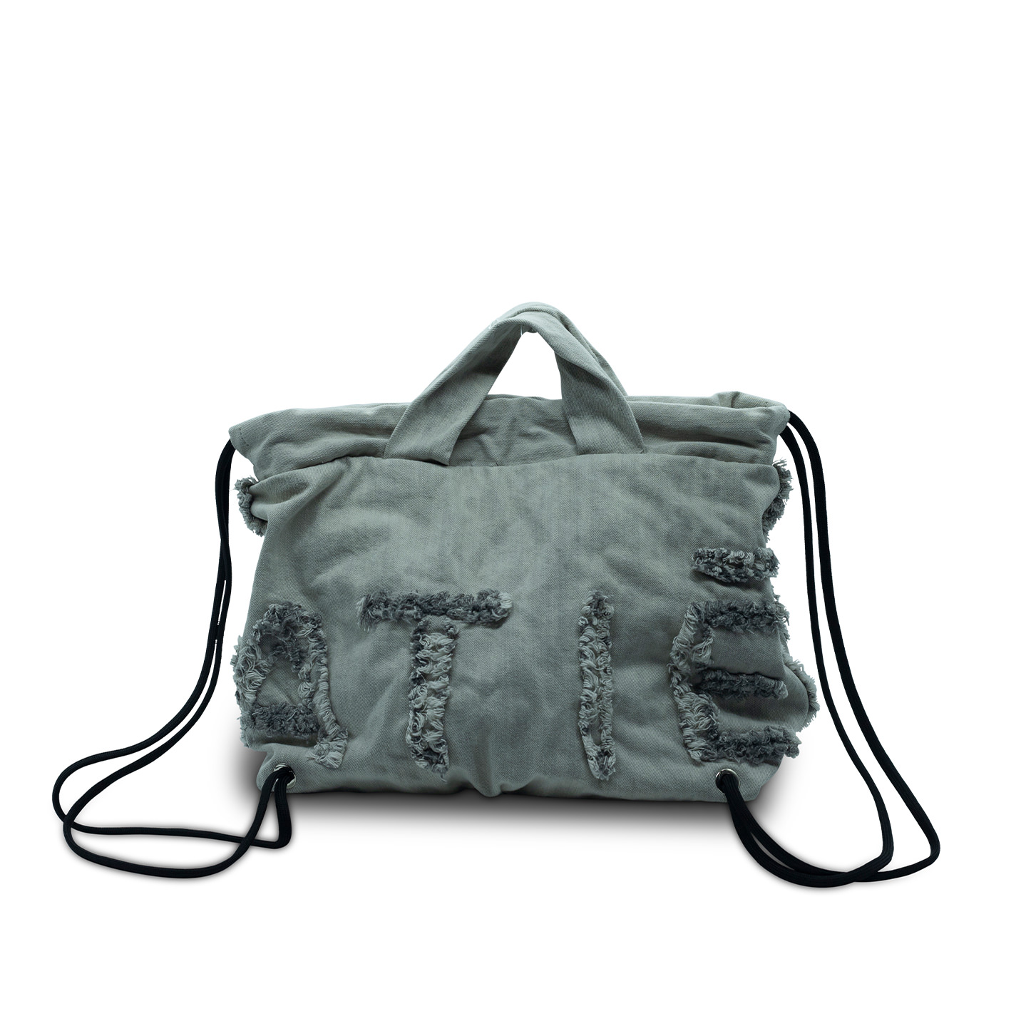 Small sand logo bag, made of stone wash denim with applied fringed logo. Denim handles and shoulder strap, the snap closure and drawstring cords act as shoulder straps so you can wear it as a backpack.
