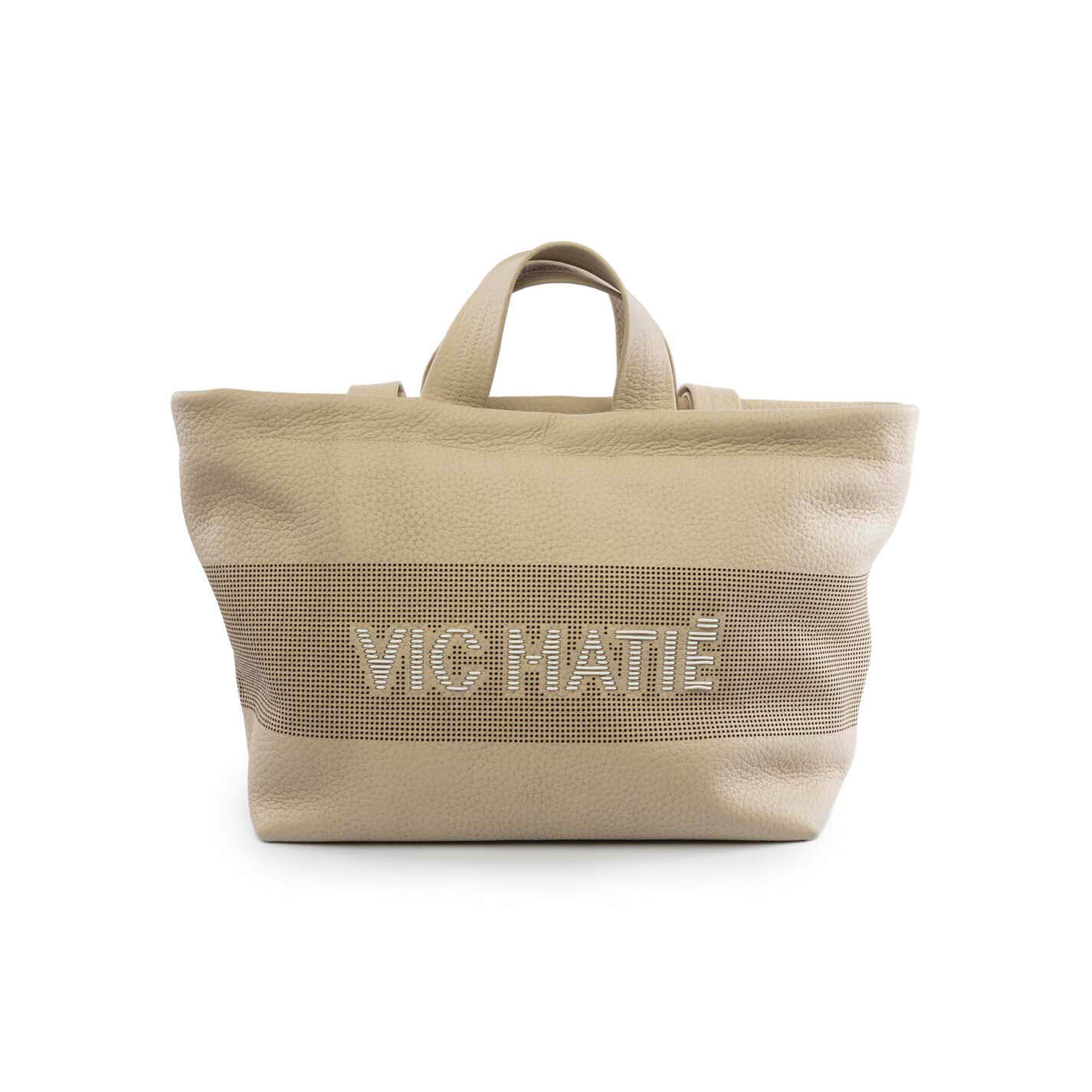 Large sand pink shopper bag in coarse-grained calfskin with perforations and threaded logo on the front. Metal zip fastening. Two handles of different length.