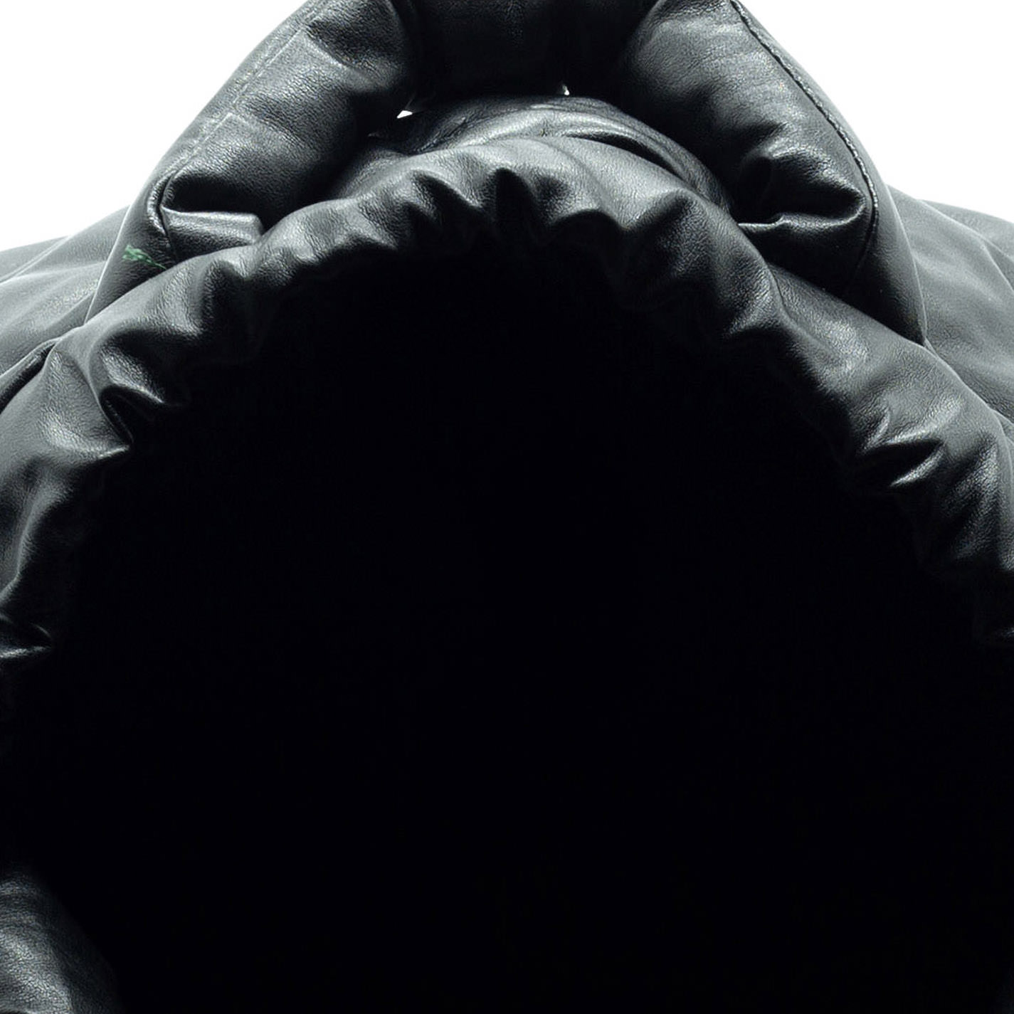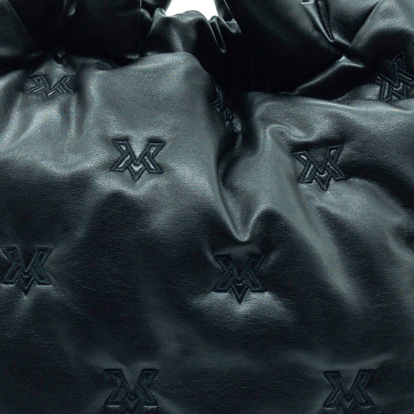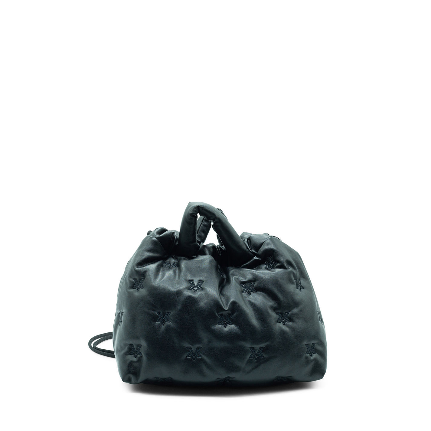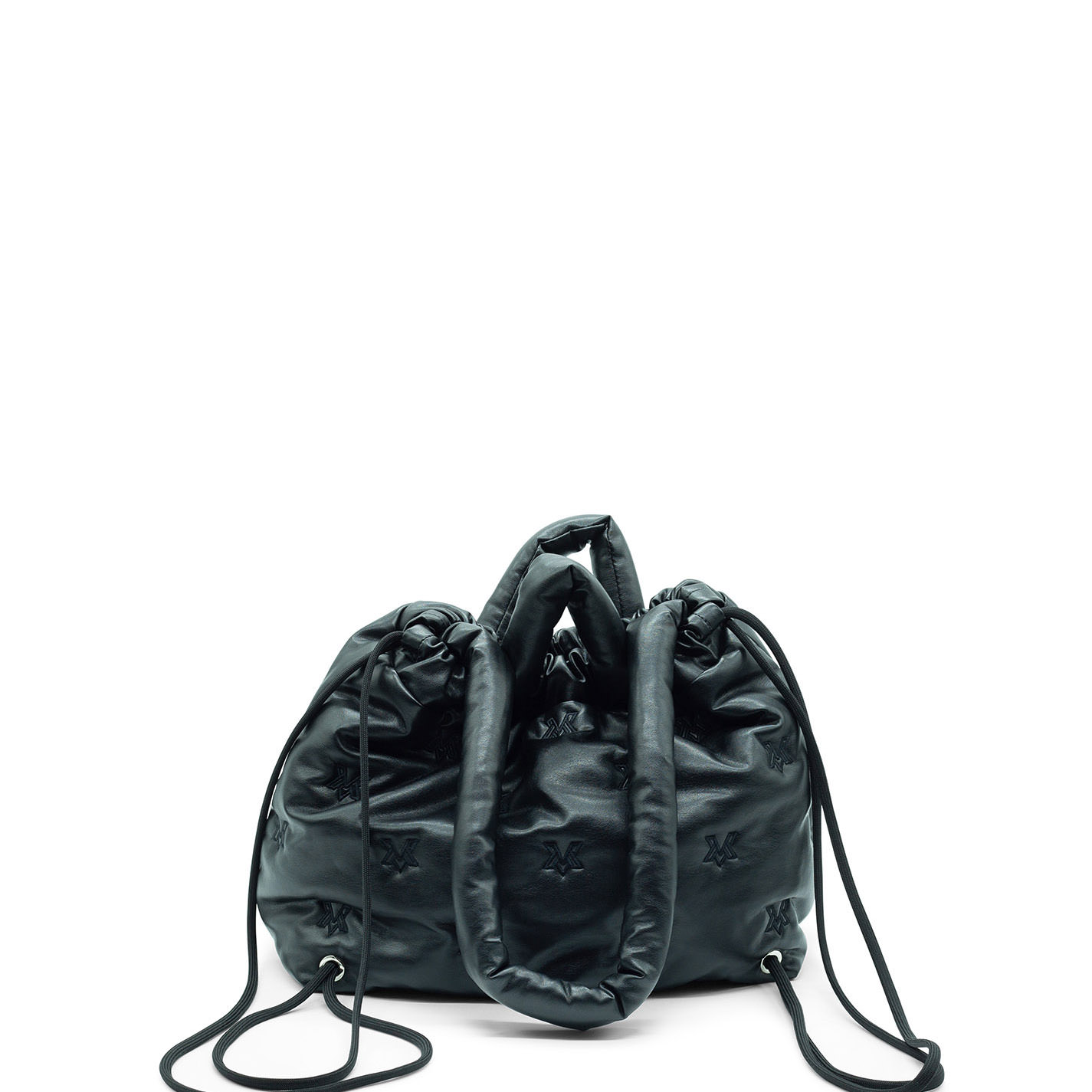 Black backpack bag, crafted from padded faux leather, with embroidered monogram. It features drawstring fastening and handles, rope shoulder strap and loops to wear it in different styles.
