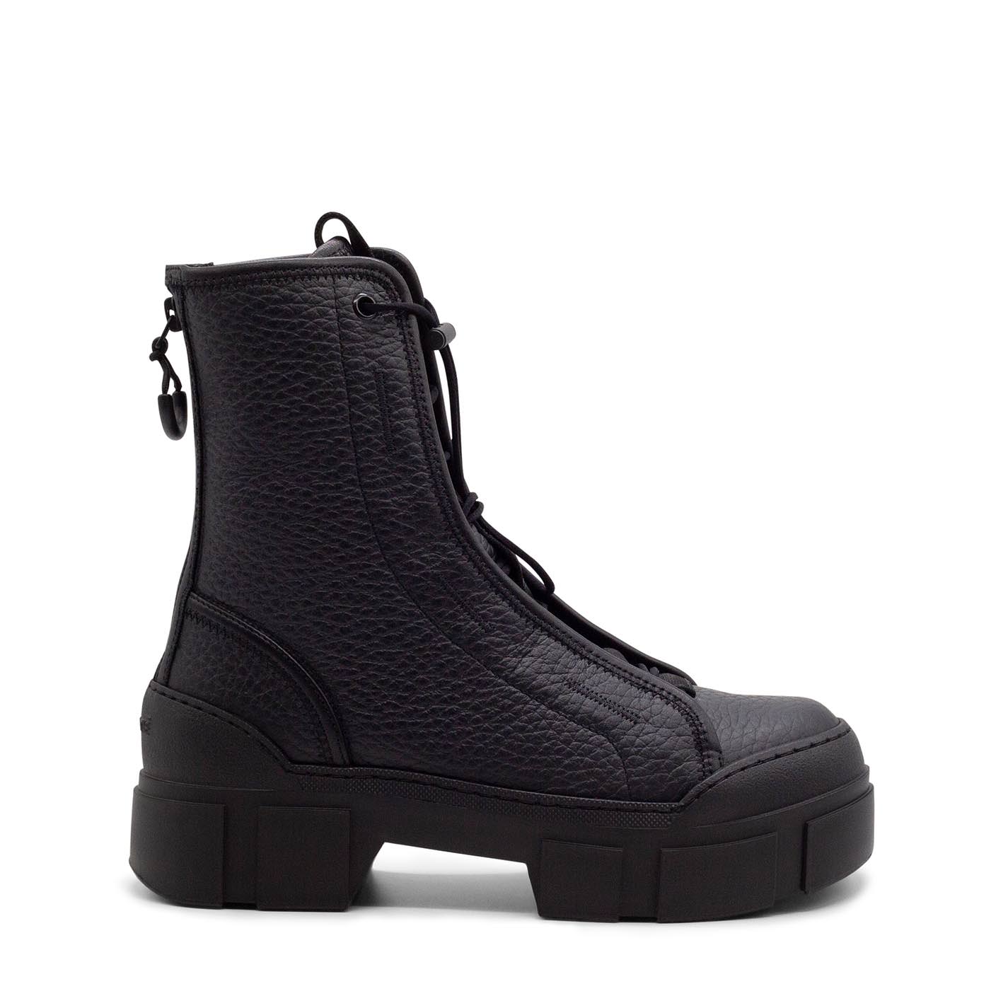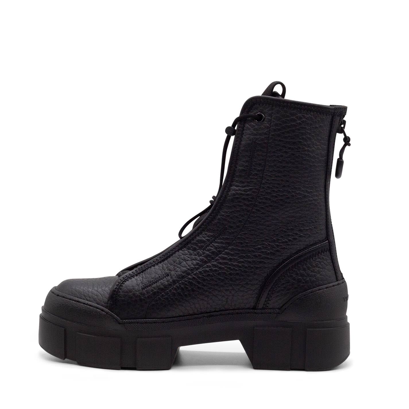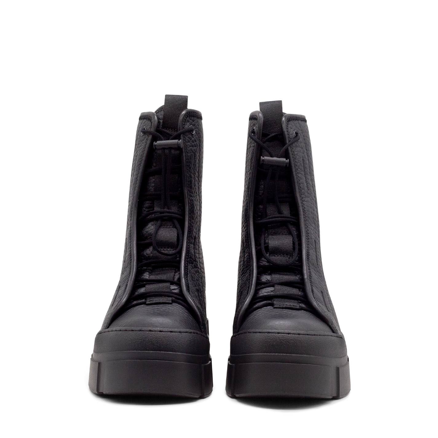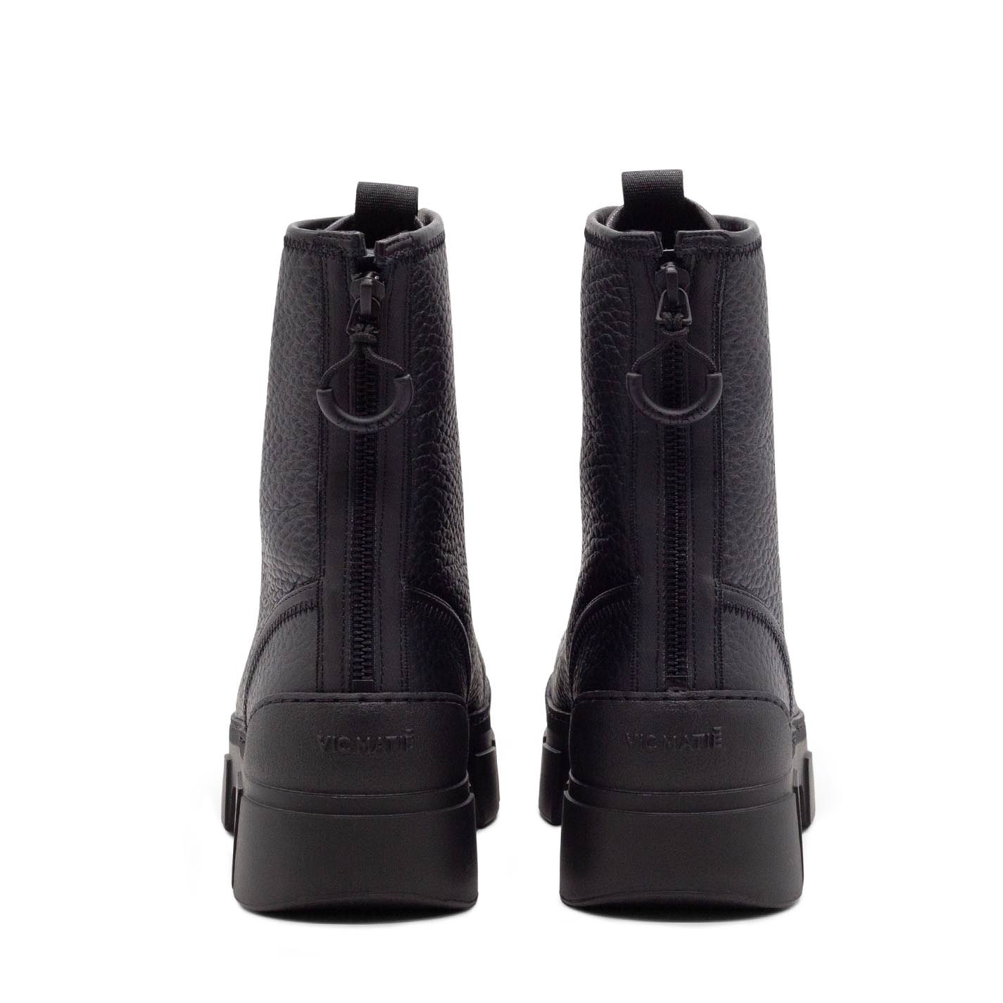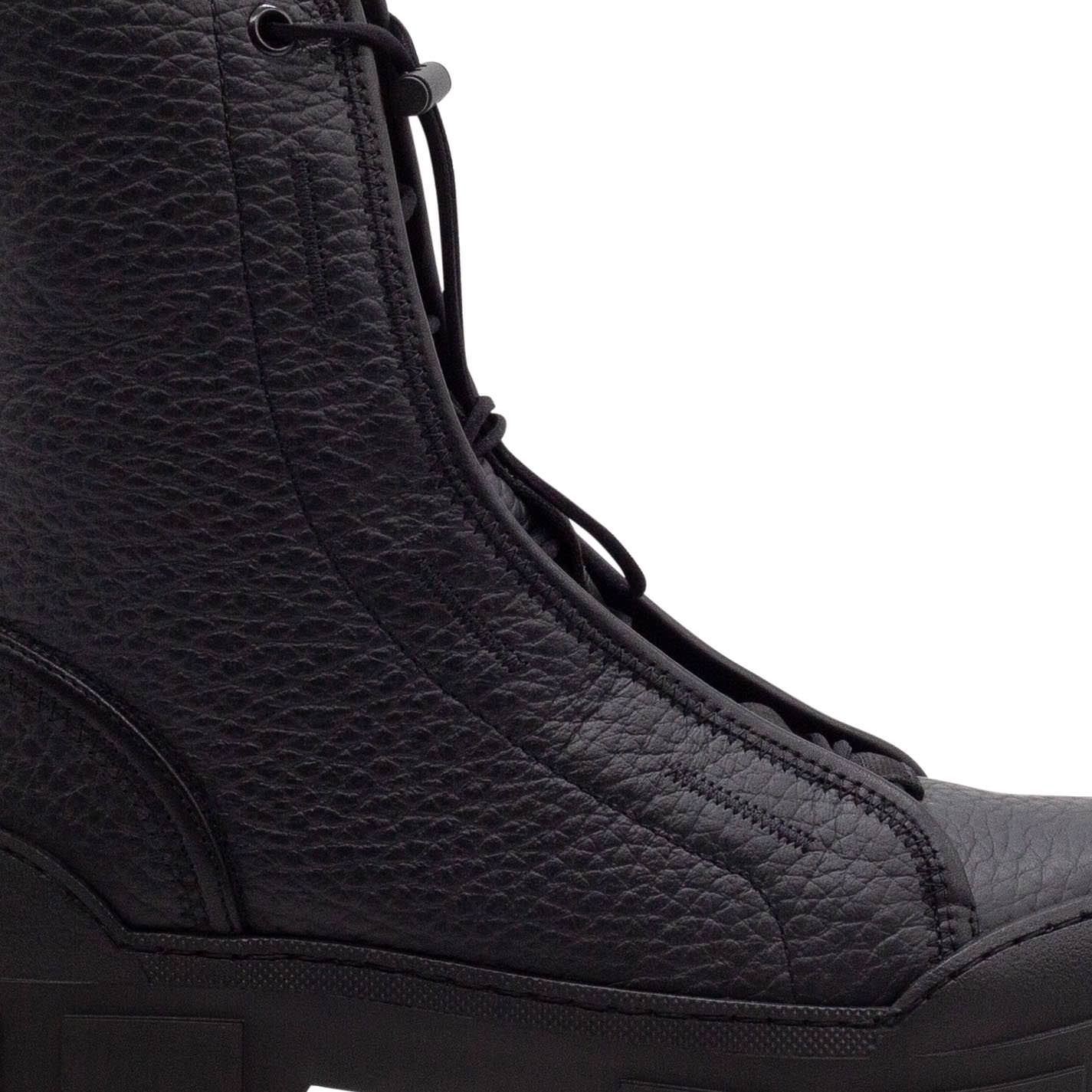Roccia combat boots in black coarse-grained calfskin, with black zig-zag detailing and edging, adjustable elastic drawstring with pull, and tone-on-tone grosgrain on the tongue. Easy to put on thanks to the rear zip and logo-branded rubber pull tab. TPU shell sole with superimposed strips and soft, calfskin-covered TAG insole. Made in Italy.