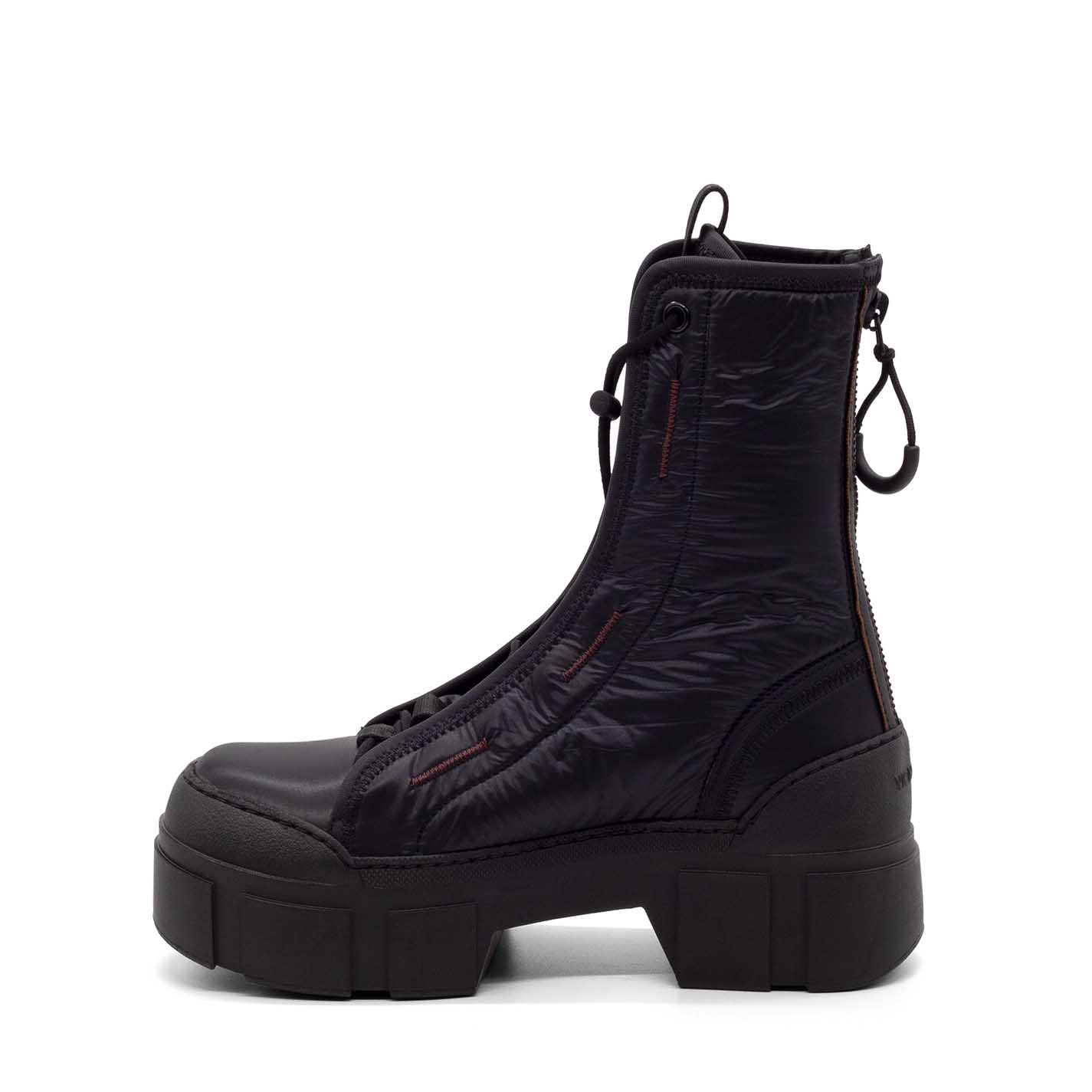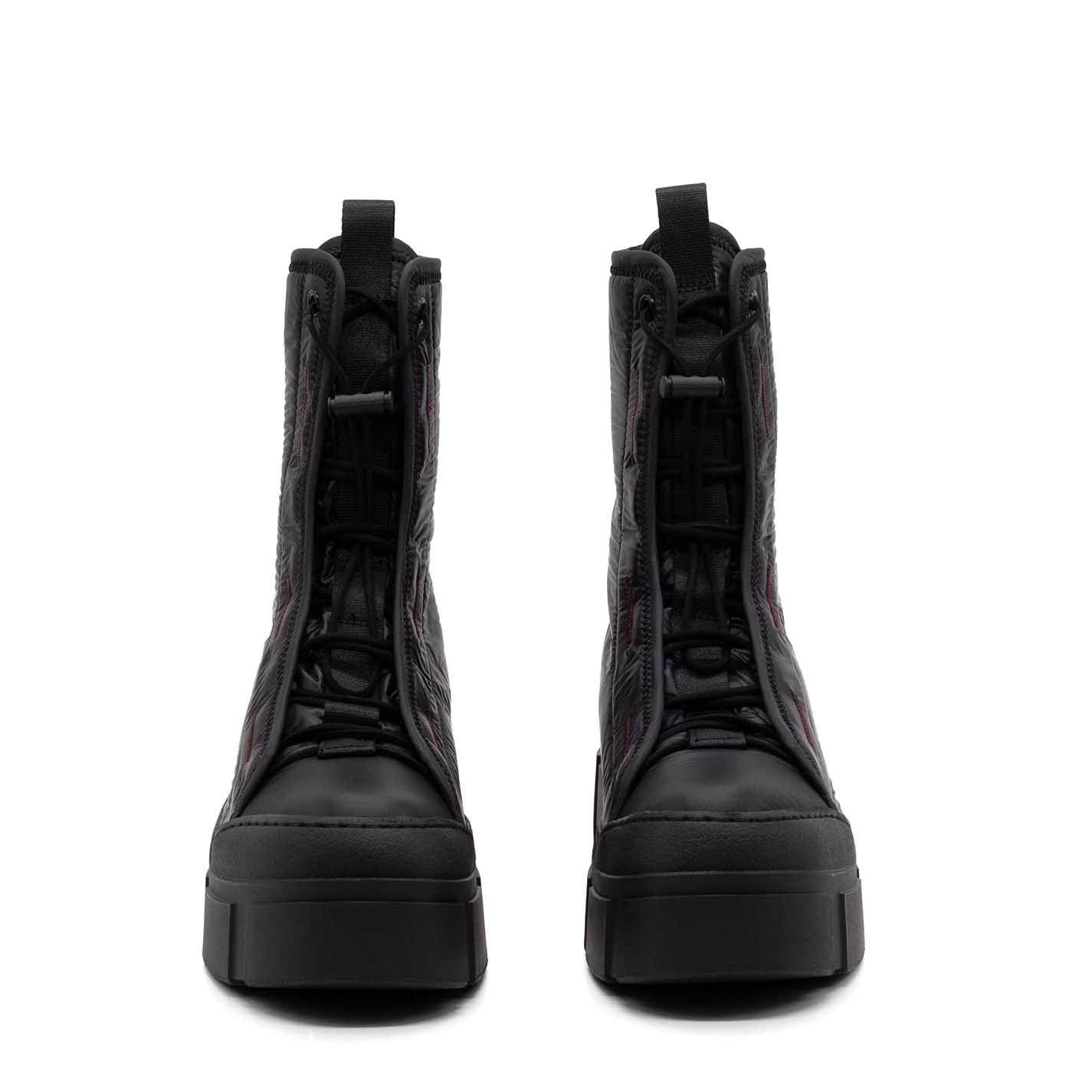 Roccia black/purple combat boots in glossy nylon, with padding, purple zig-zag detailing and edging, adjustable elastic drawstring with pull, and tone-on-tone grosgrain on the tongue. Easy to put on thanks to the rear zip and logo-branded rubber pull tab. TPU shell sole with superimposed strips and soft, calfskin-covered TAG insole. Made in Italy.