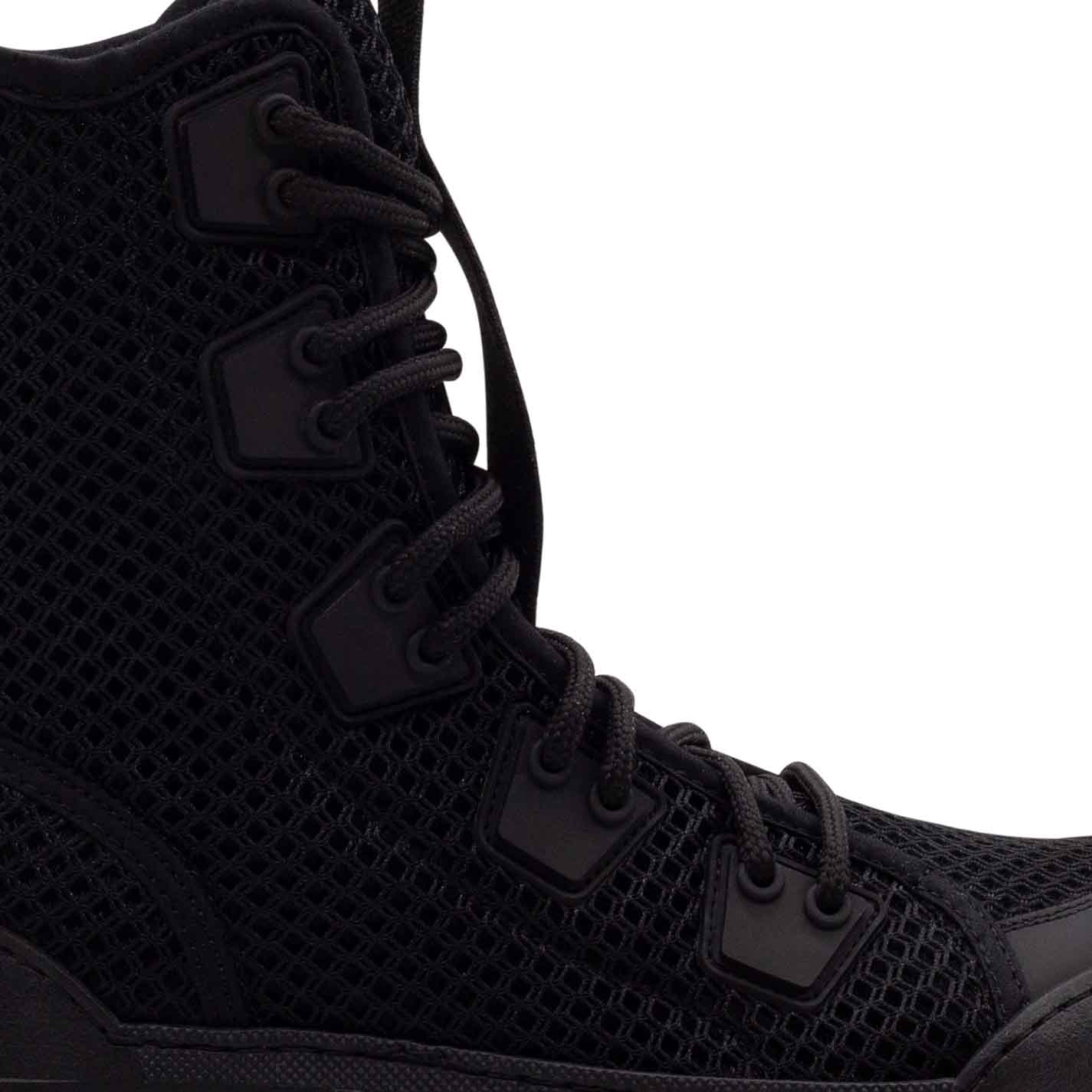 Roccia black trekking mesh combat boots made from unlined honeycomb-stitched fabric, with rubber lace loops, rear zip to help put them on and branded pull tab. TPU shell sole with superimposed strips and soft, calfskin-covered TAG insole. Made in Italy.