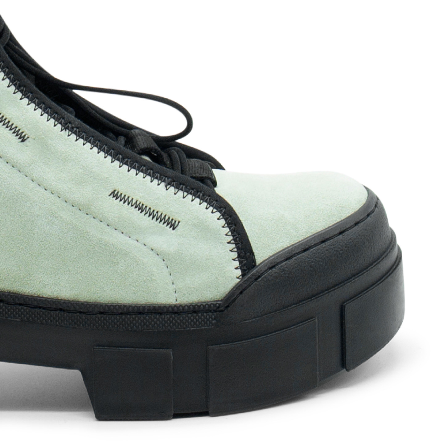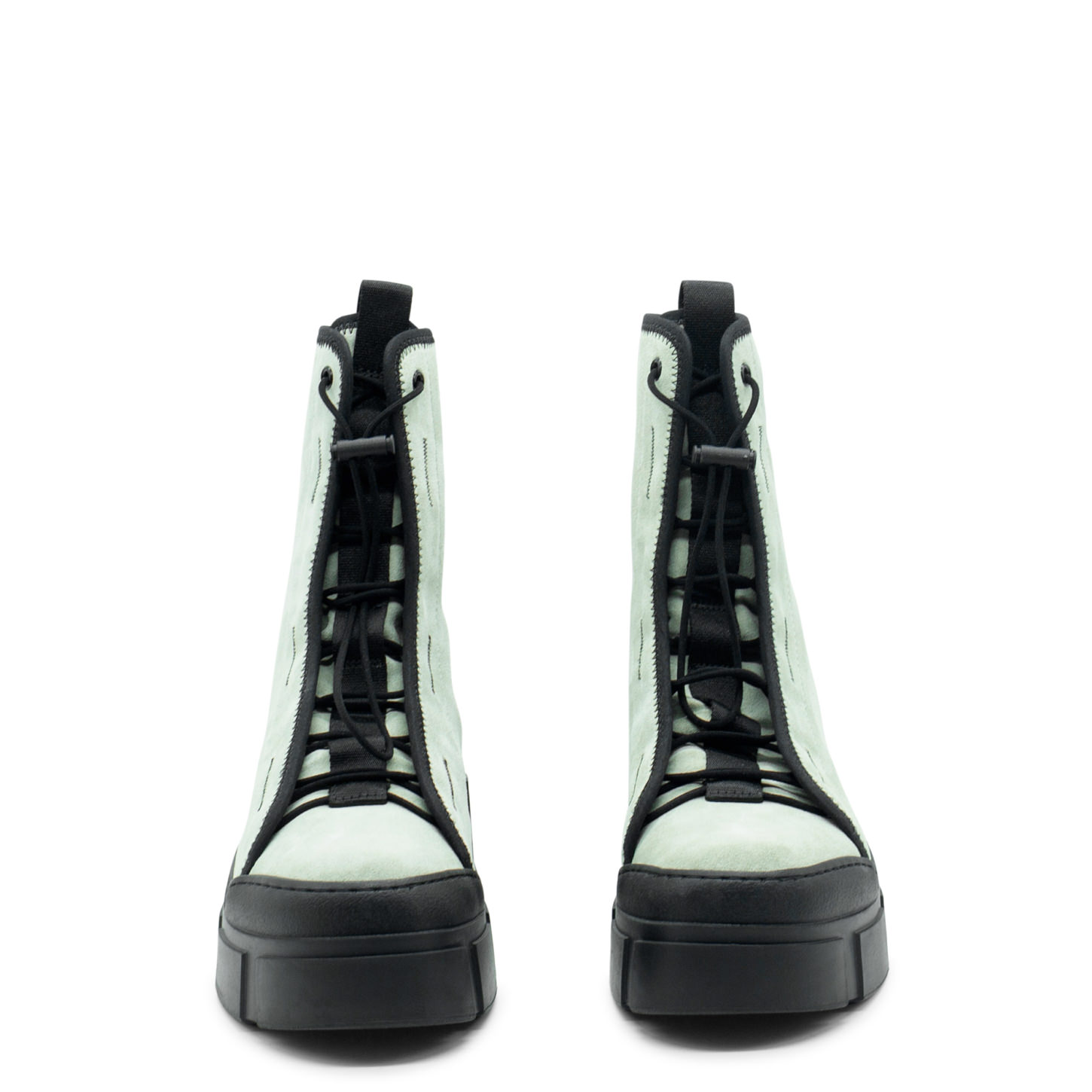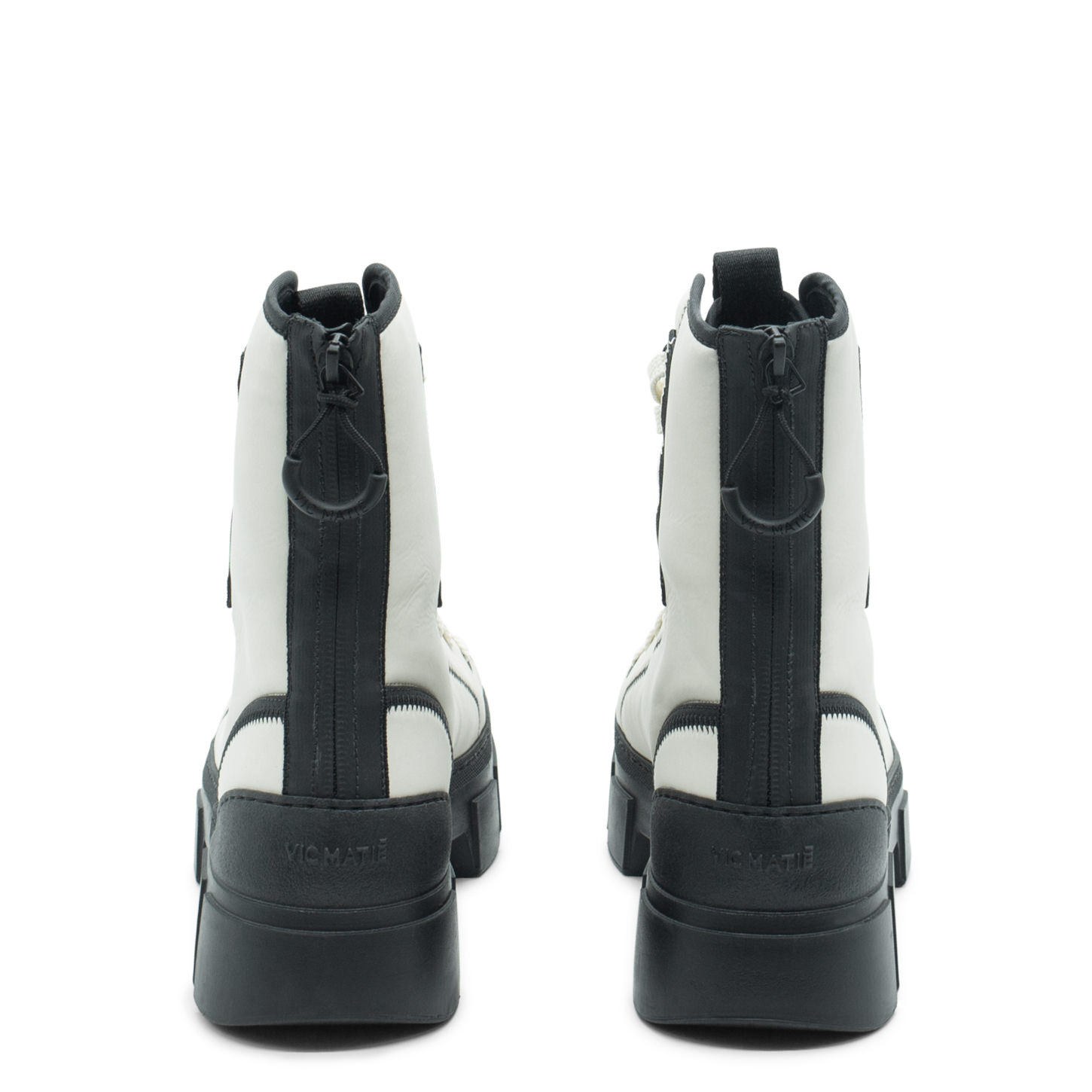 Roccia vintage-effect bone split calfskin combat boots, with black binding and zigzag details. They feature adjustable elastic shoe laces with drawstring puller, same-colour grosgrain on the tongue, and back zip for easier fit with branded rubber puller. This model is fitted with TPU shell sole with raised details and soft TAG footbed covered in calfskin. Made in Italy.