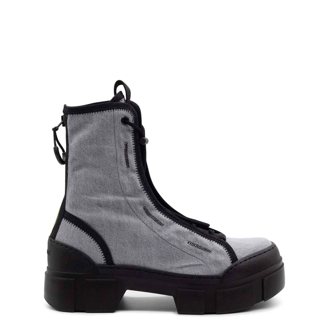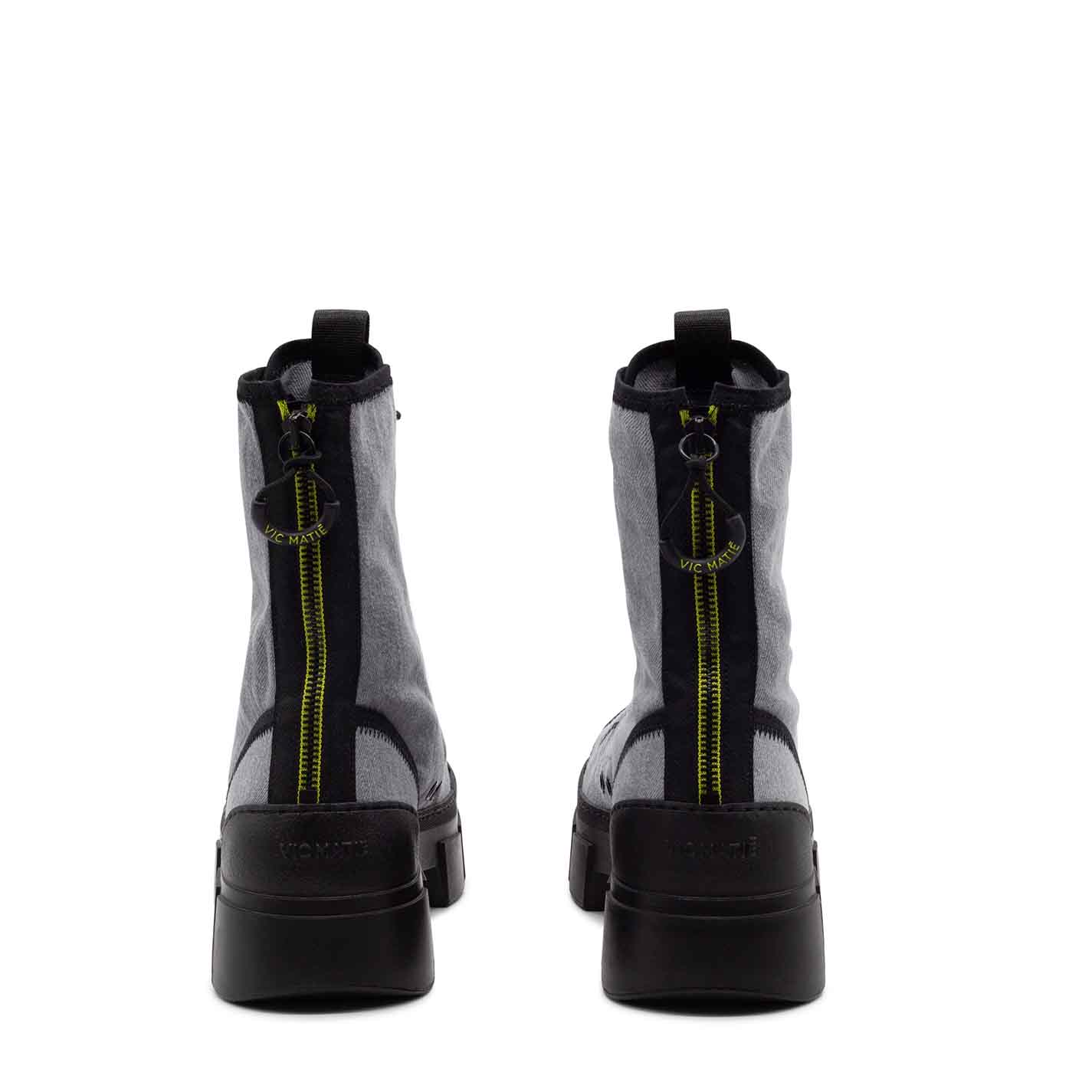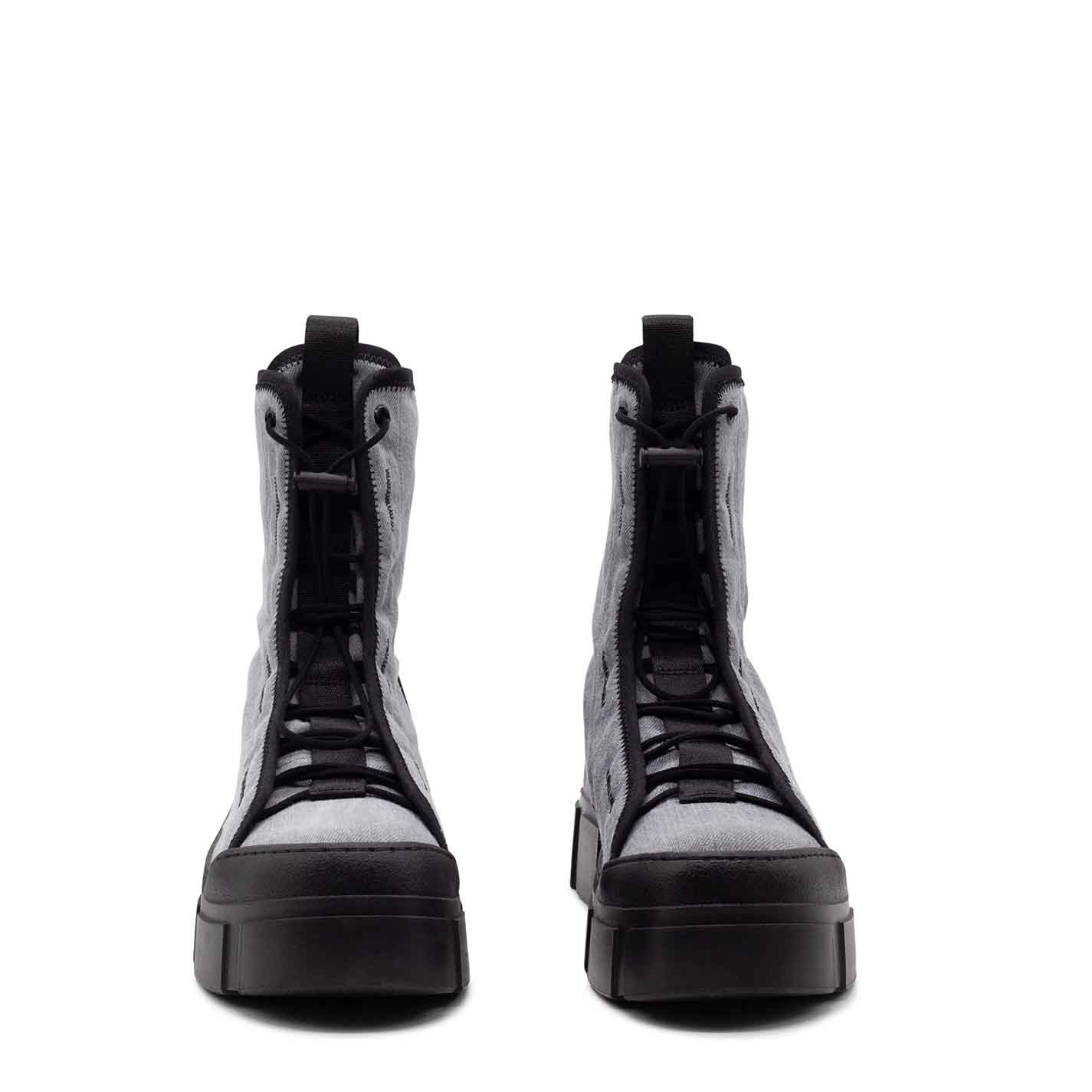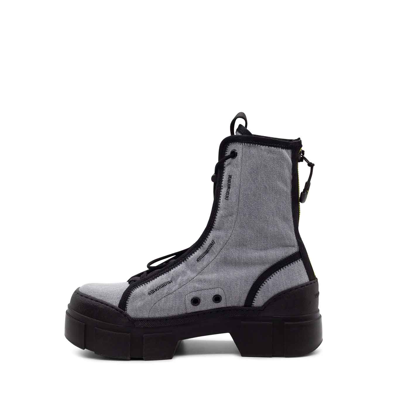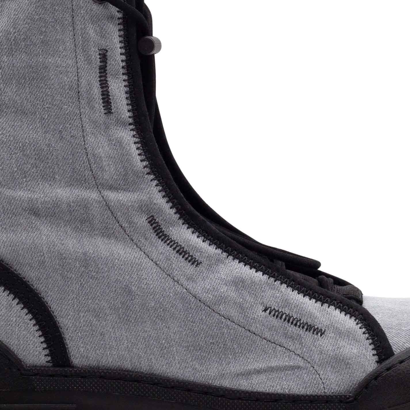 Roccia combat boots in washed grey denim with fabric edging, black zigzag detailing, toggle-adjustable lacing, grosgrain detail, two-tone zip at the back to help put them on and branded rubber pull tab. TPU shell sole with superimposed strips and soft, calfskin-covered TAG insole. Made in Italy.