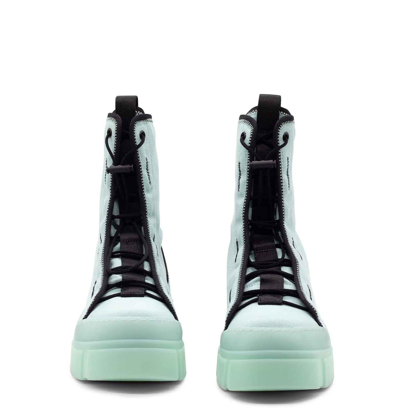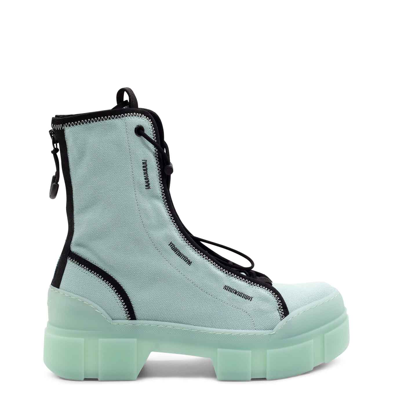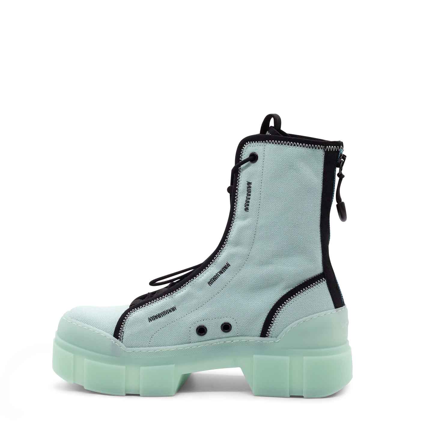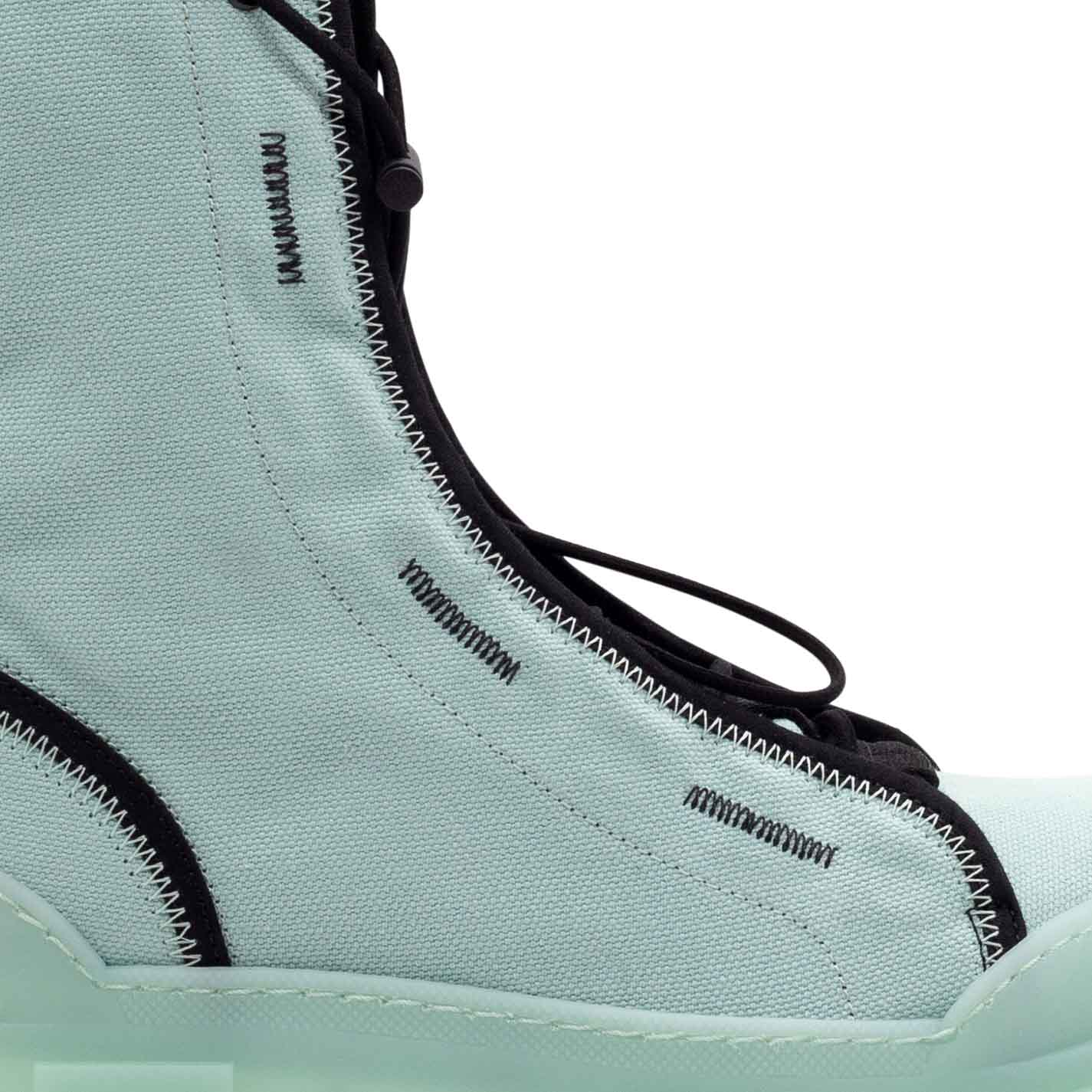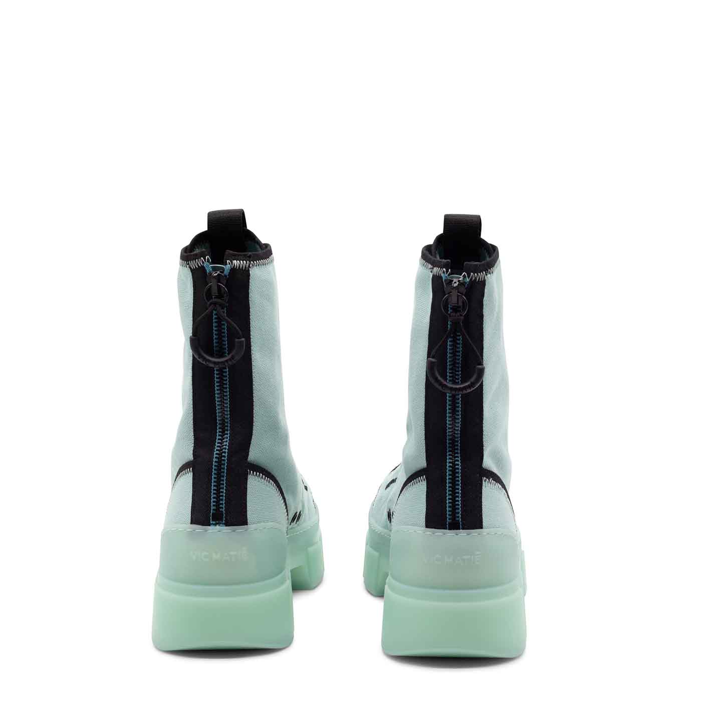 Roccia unlined aquamarine cotton combat boots with fabric edging, black zigzag detailing, toggle-adjustable lacing, grosgrain detail, two-tone zip at the back to help put them on and branded rubber pull tab. Translucent TPU shell sole with superimposed strips and soft, calfskin-covered TAG insole. Made in Italy.