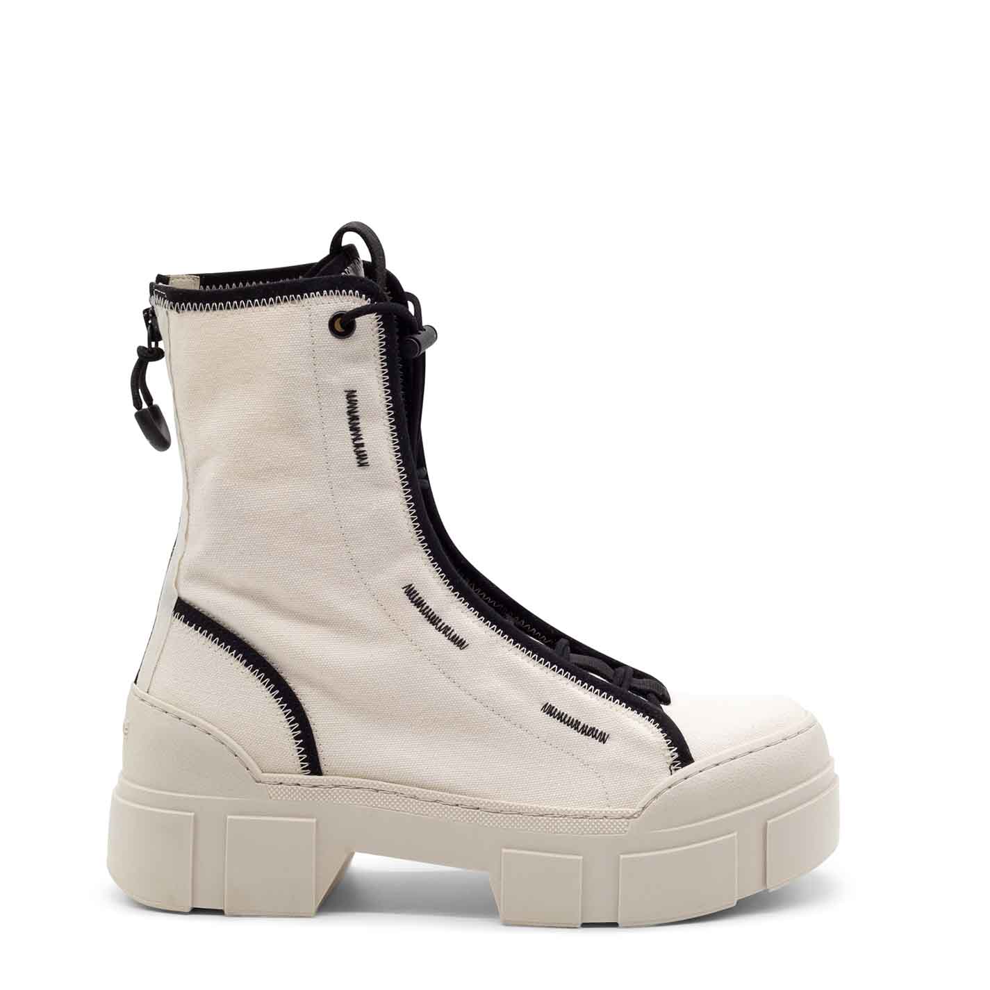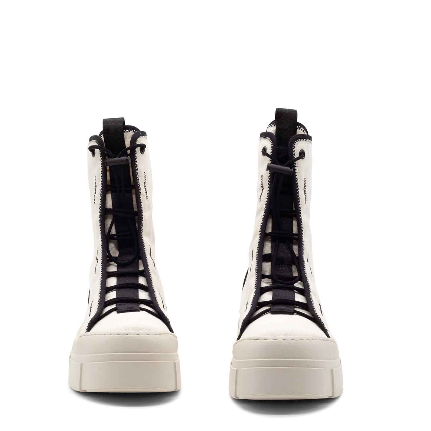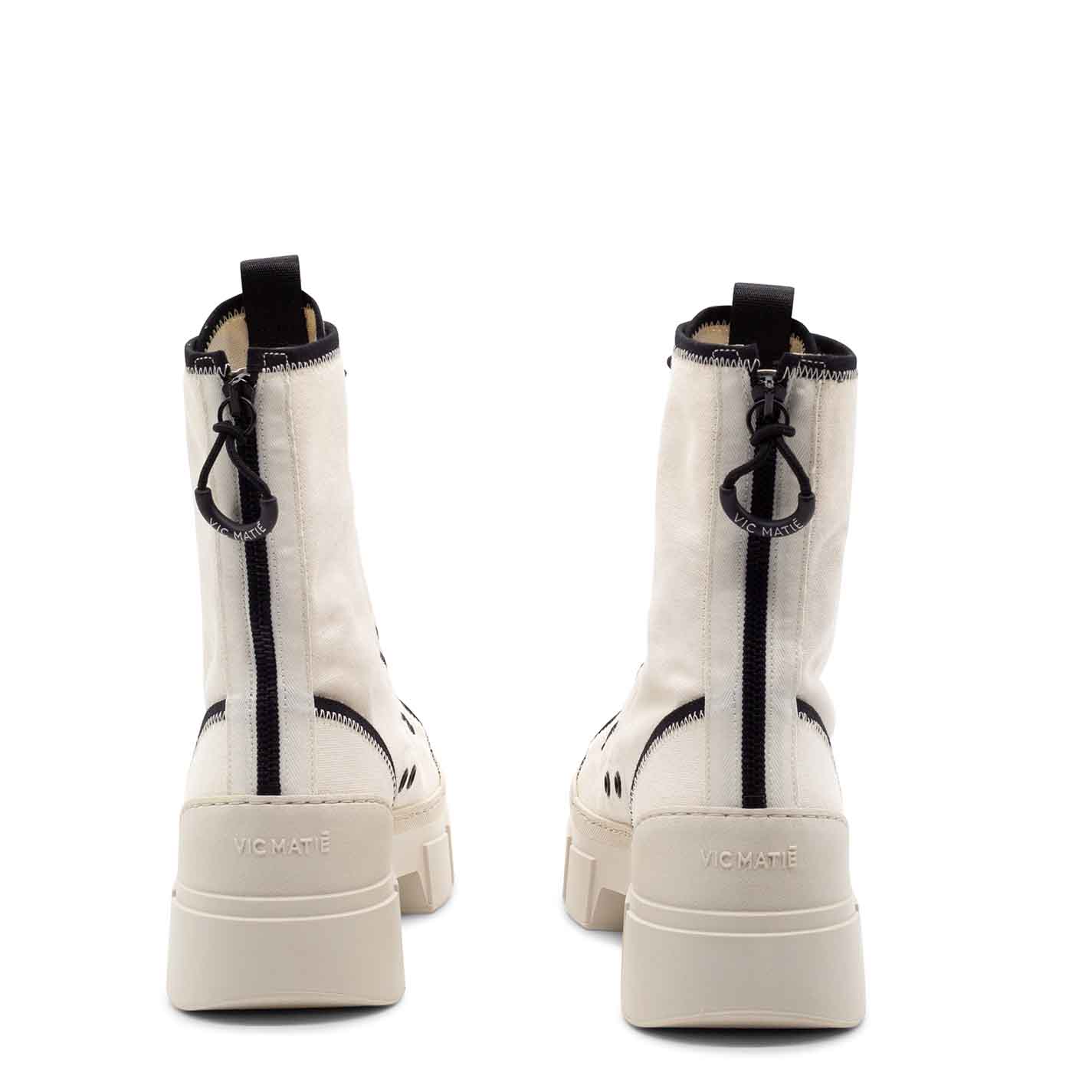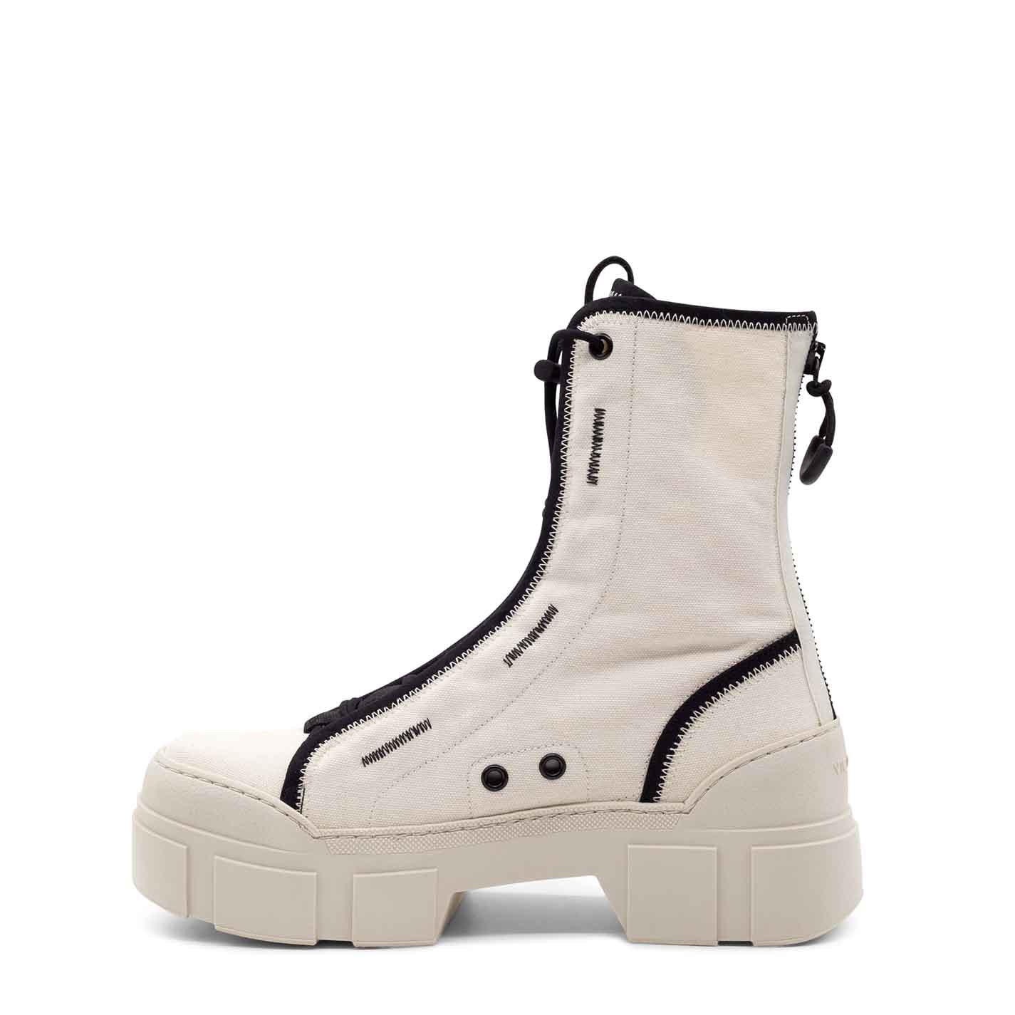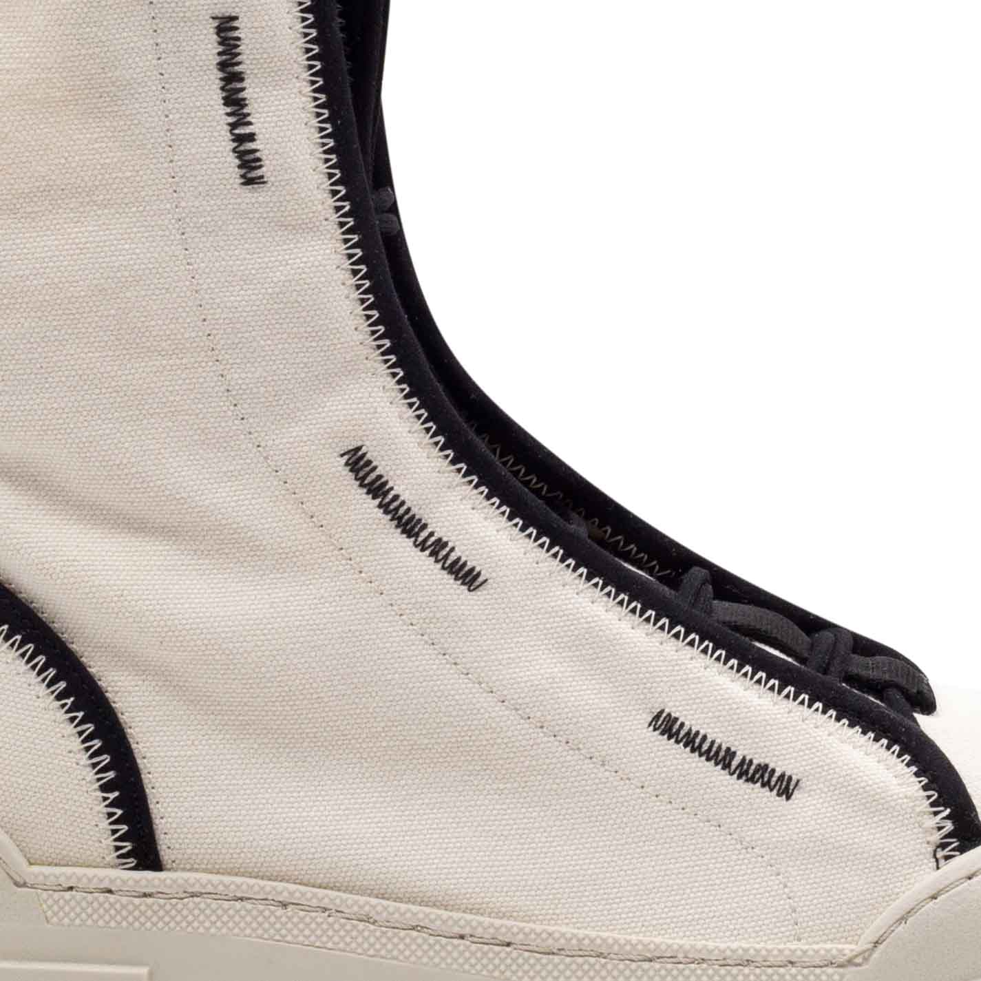 Roccia unlined cream cotton combat boots with fabric edging, black zigzag detailing, toggle-adjustable lacing, grosgrain detail, two-tone zip at the back to help put them on and branded rubber pull tab. TPU shell sole with superimposed strips and soft, calfskin-covered TAG insole. Made in Italy.