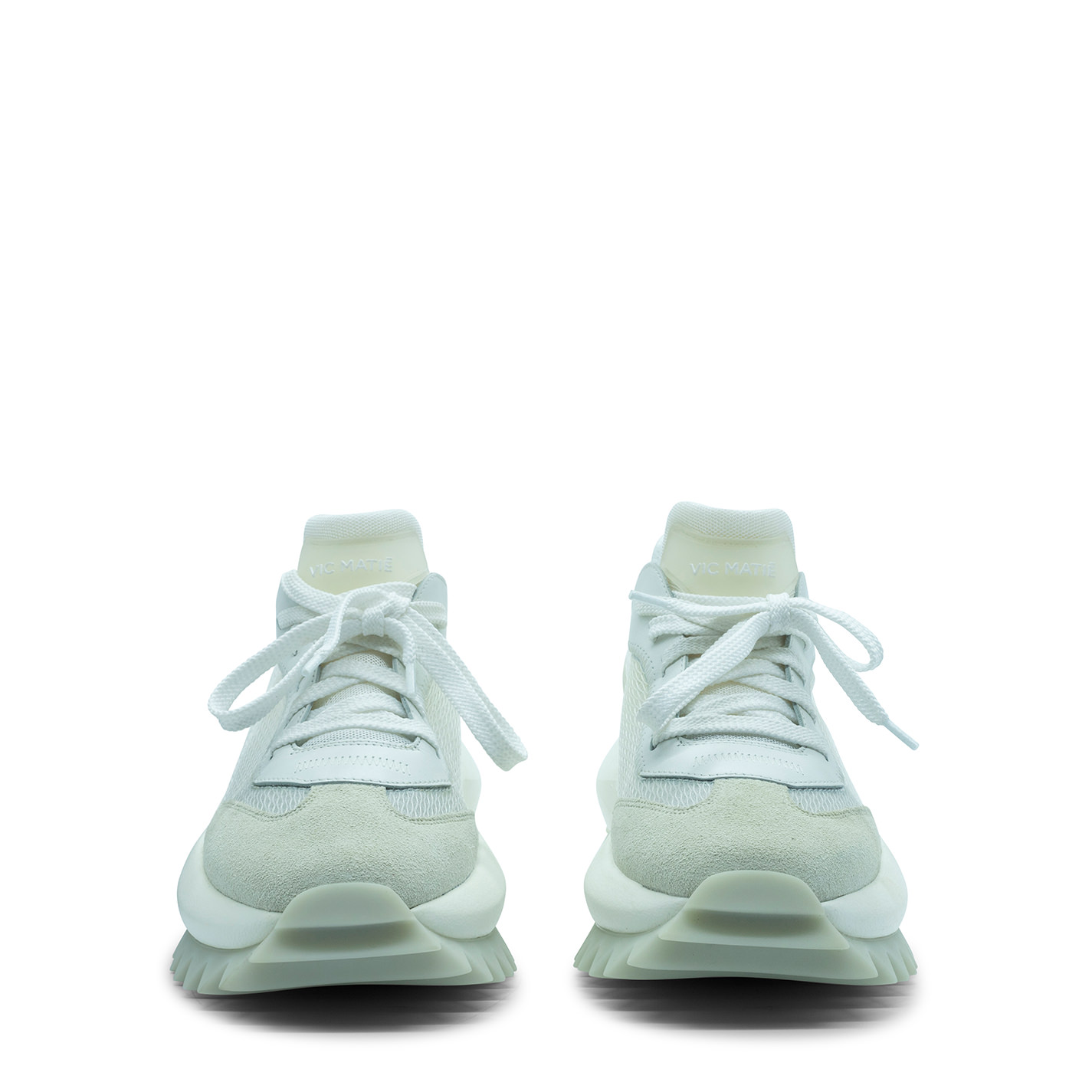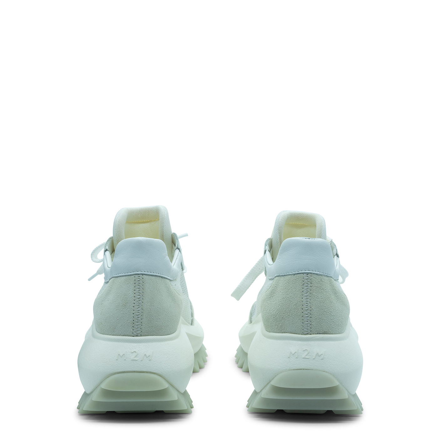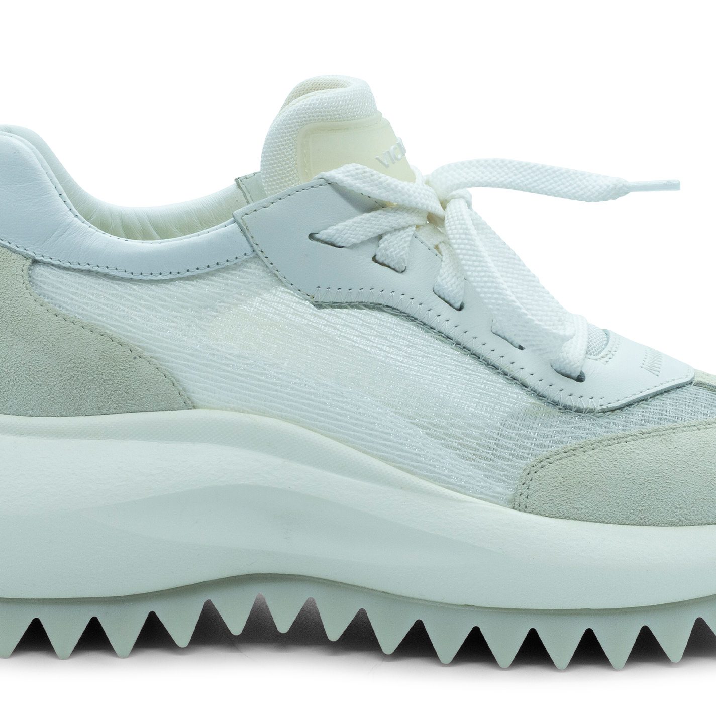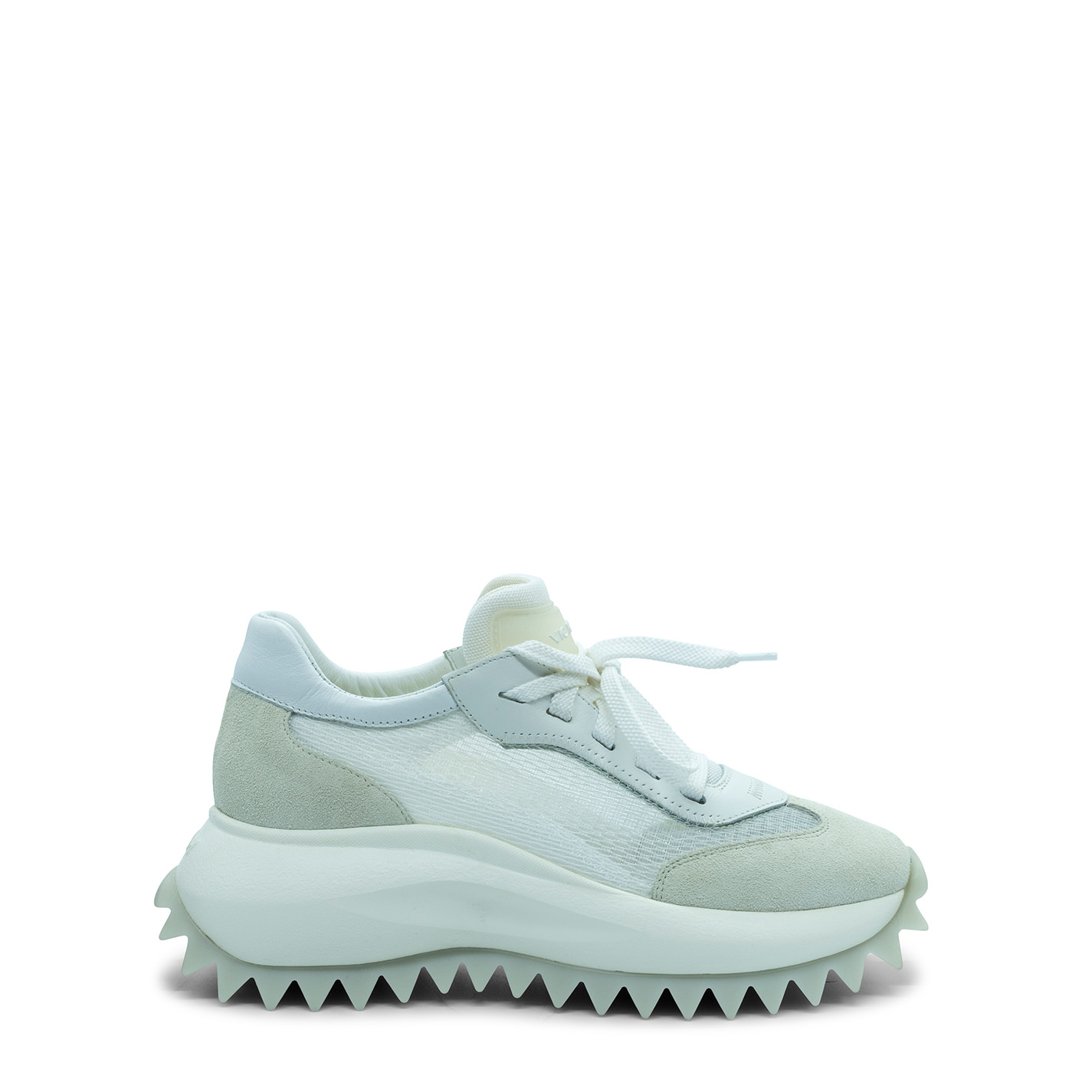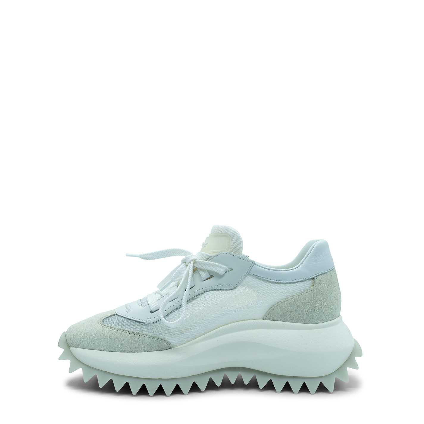 Running laced white made of split calfskin, leather and transparent mesh, adorned with contrasting zigzag stitching. Extralight xl monobloc sole, logoed with rubber coating and tread with maxi spikes, anatomical footbed covered in pure cotton. Made in Italy.