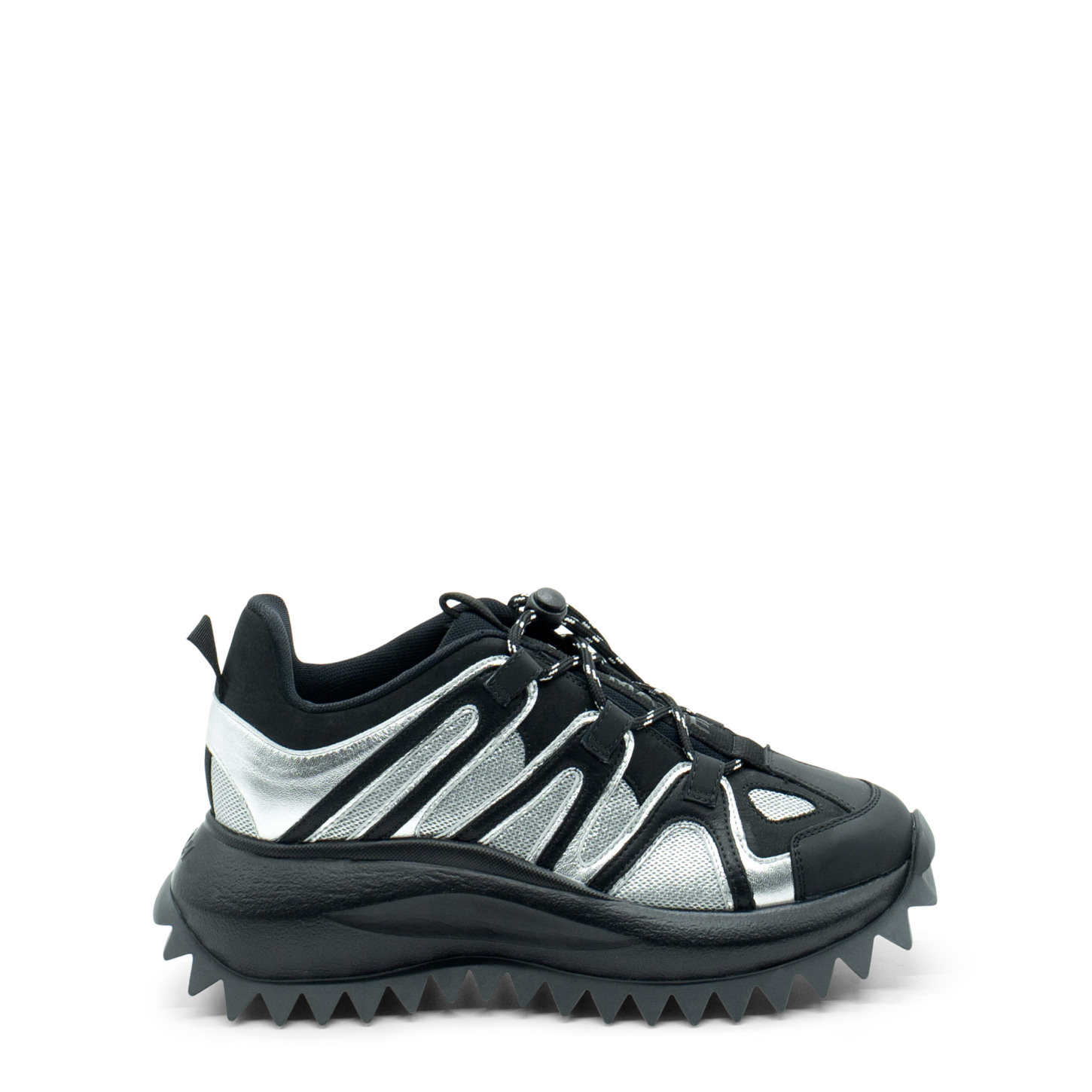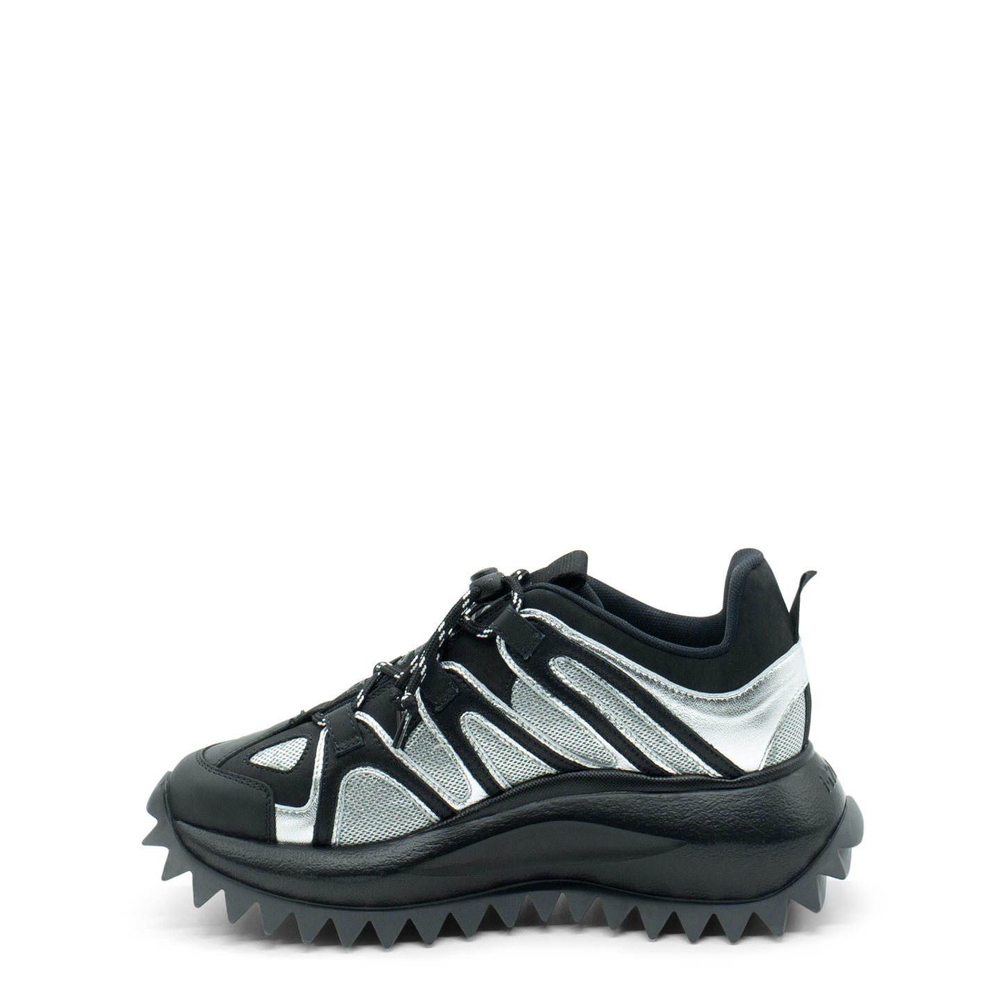 Running Trek black/silver sneakers, crafted from split leather, rubber-effect calfskin and performance fabric. Adjustable shoe laces with drawstring puller. This model is fitted with extra-light XL one-piece rubberised and branded sole, outsole with maxi spikes, and anatomic footbed covered in pure cotton. Made in Italy.