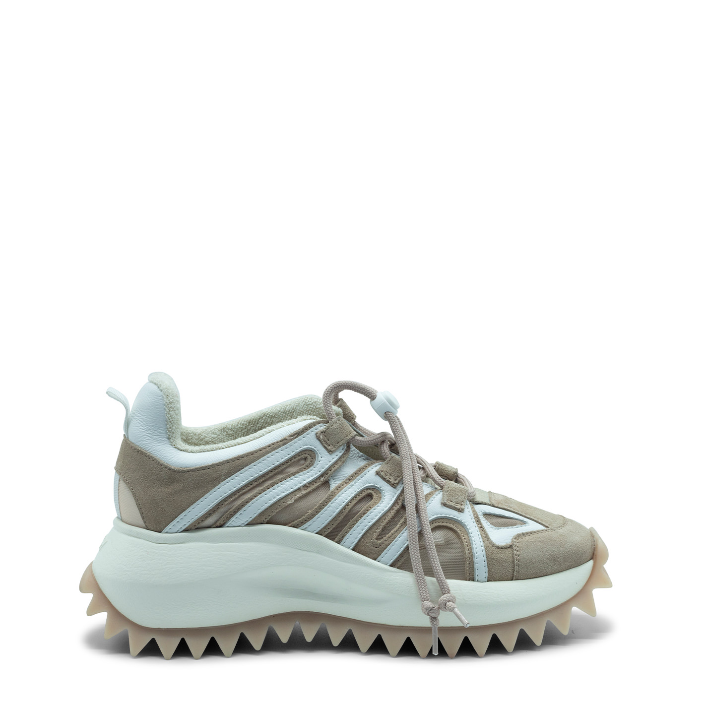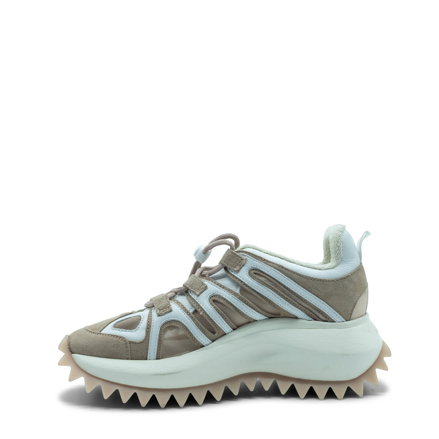 Running trek powder/white, made of split, calfskin and semi-unlined net. Adjustable stinga with drawstring puller. Extralight xl monobloc sole, logoed with rubber coating and tread with maxi spikes, anatomical footbed covered in pure cotton. Made in Italy.