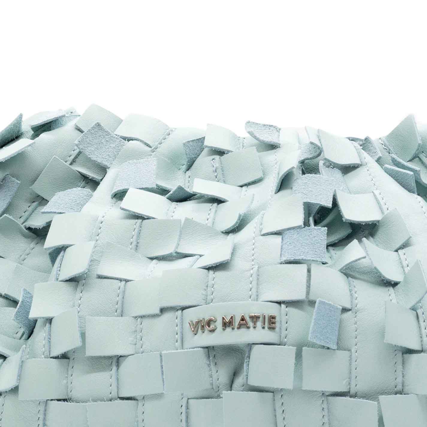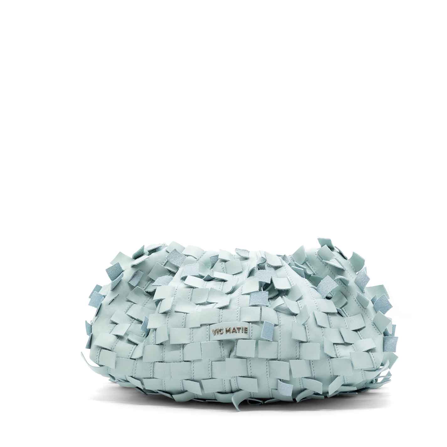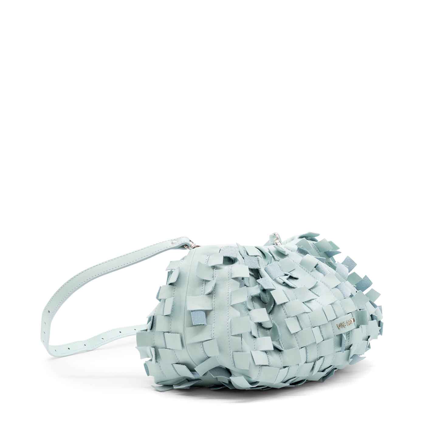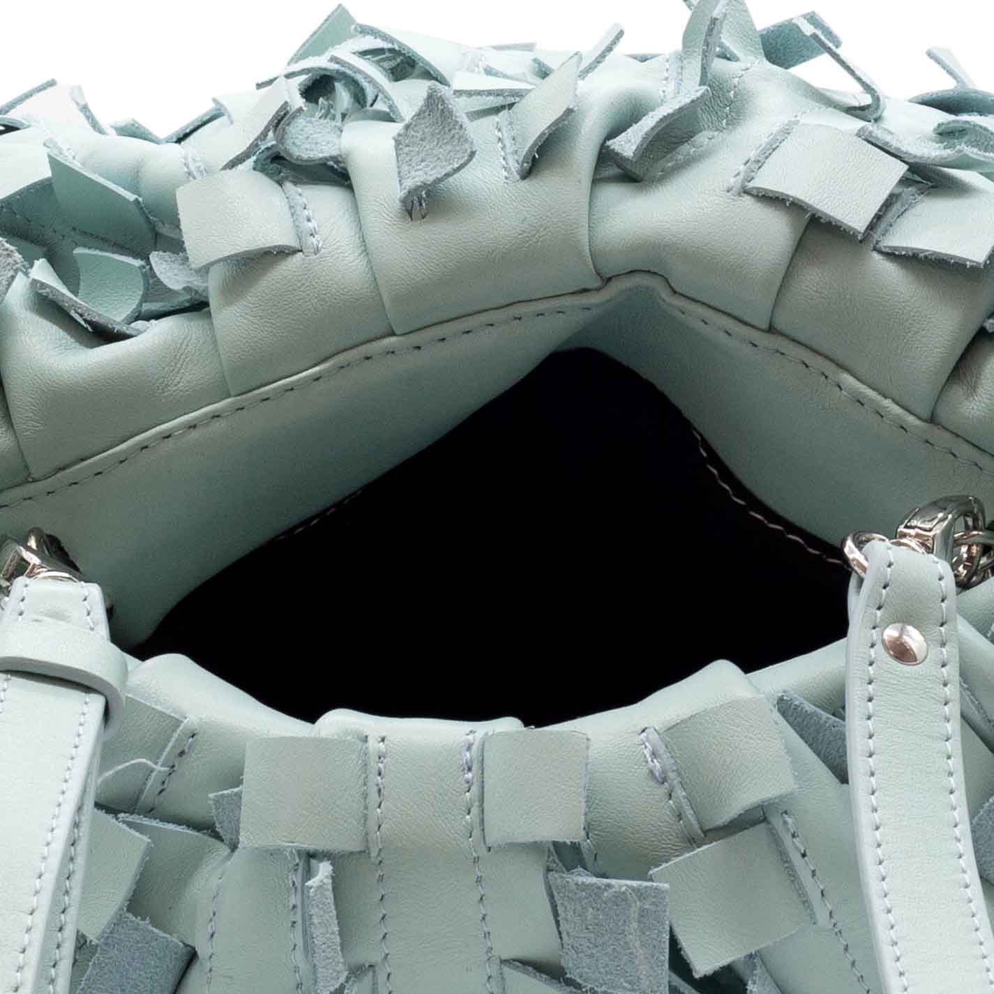 Aquamarine crossbody bag in soft nappa calfskin, with woven cut strips that give it a fringe-like effect. Spring-loaded inner closure, leather shoulder strap and metal logo on the front.