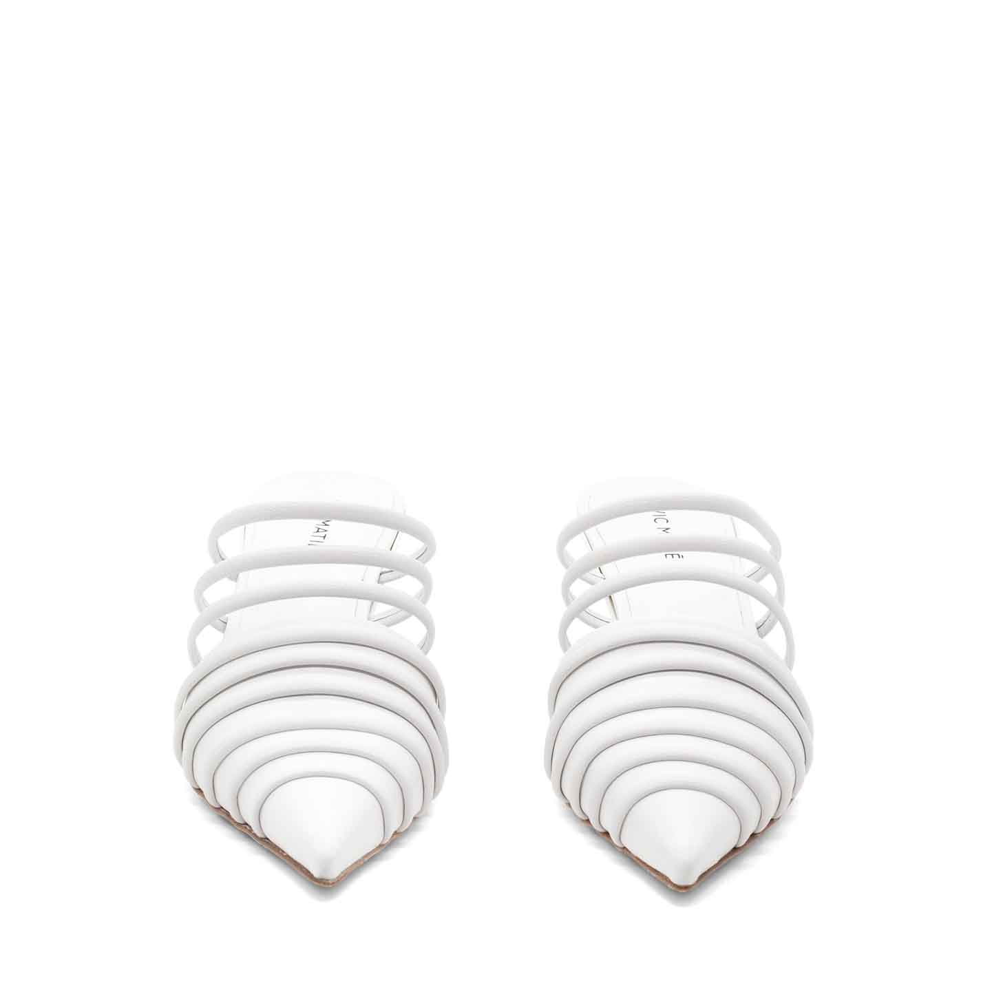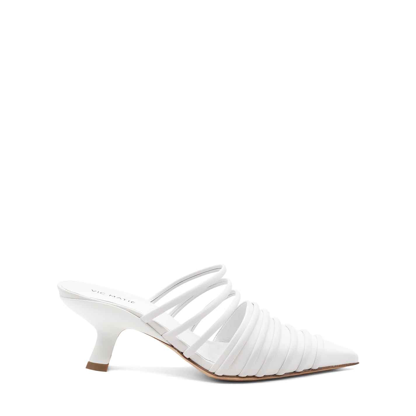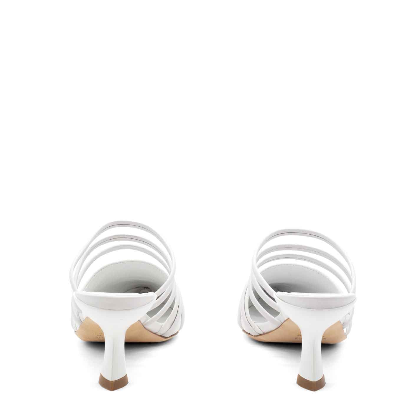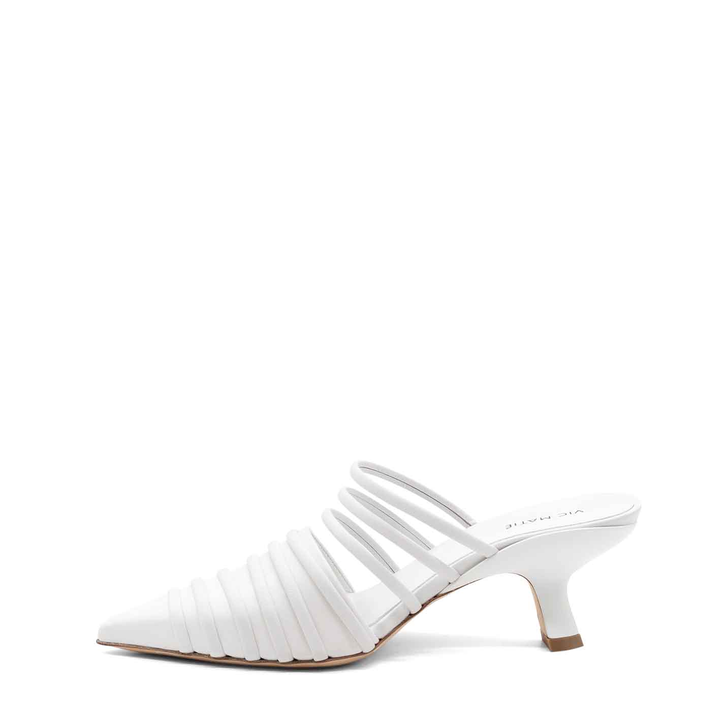 Slash slip-ons in soft white nappa, embellished with small curved strips from the toe to the instep. Very feminine pointed-toe shape and "slash" heel with matt finish. Leather sole. Made in Italy.