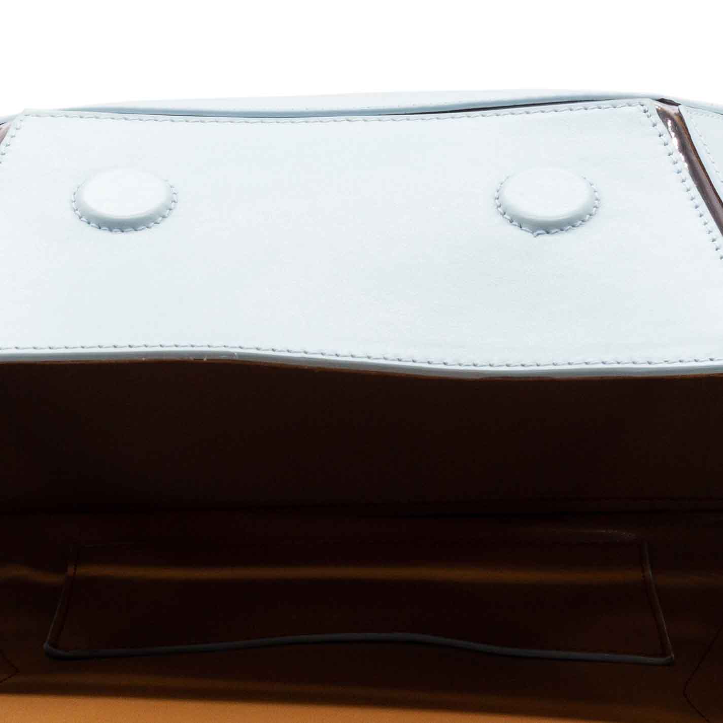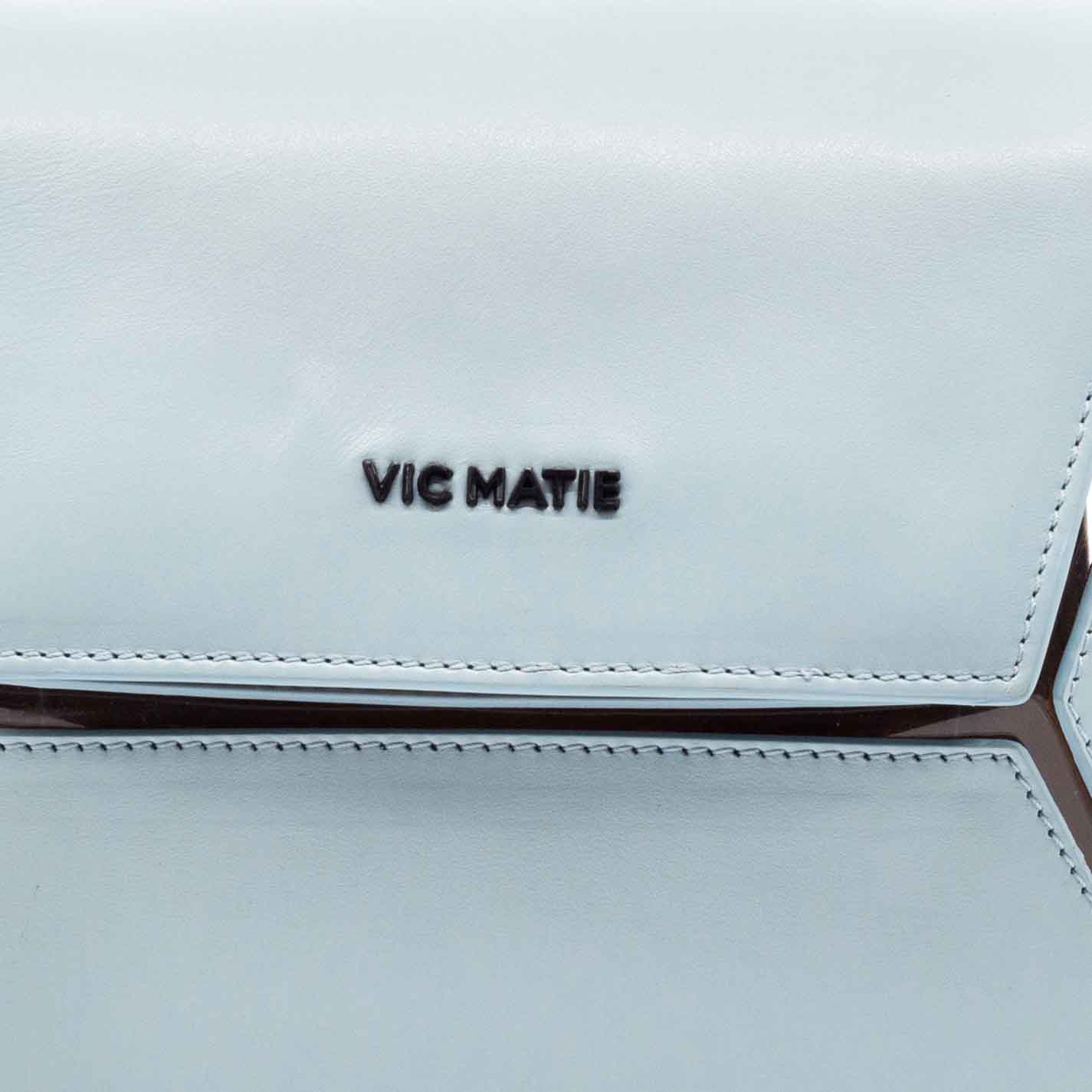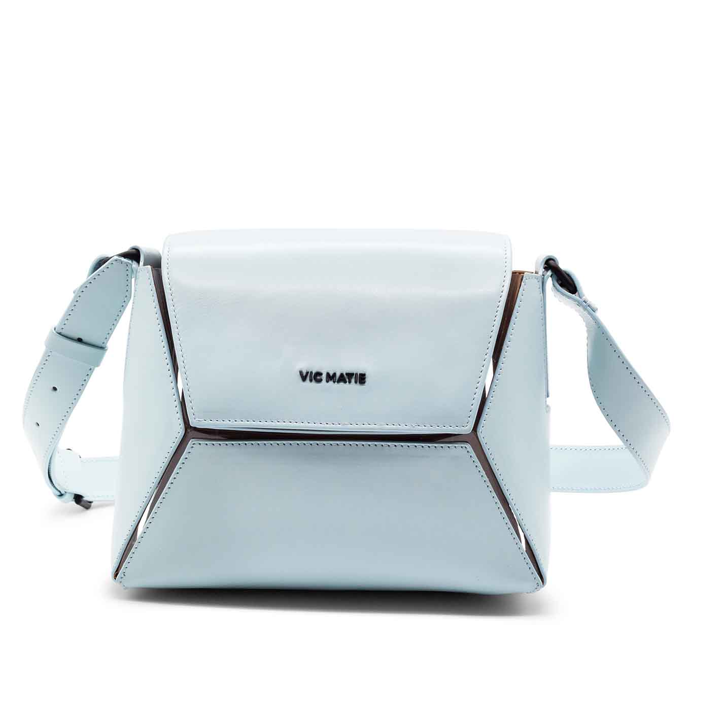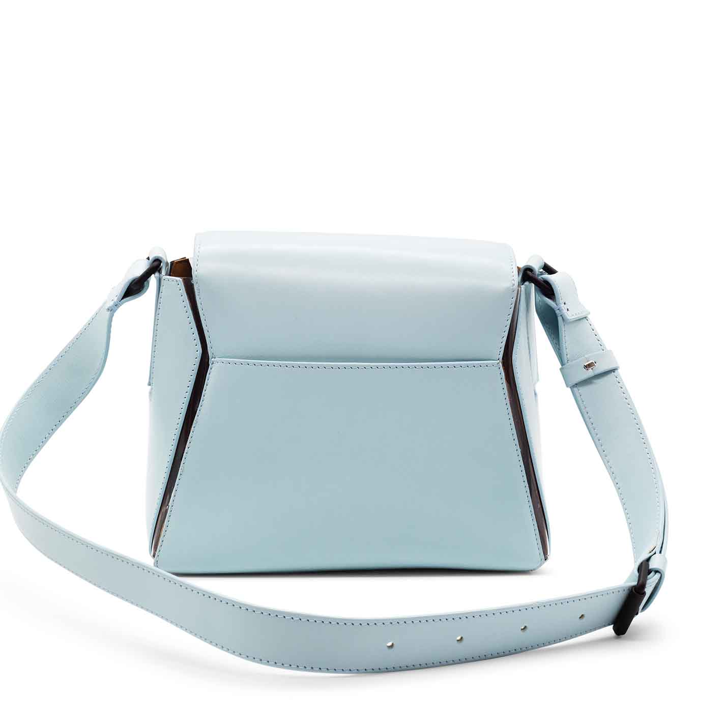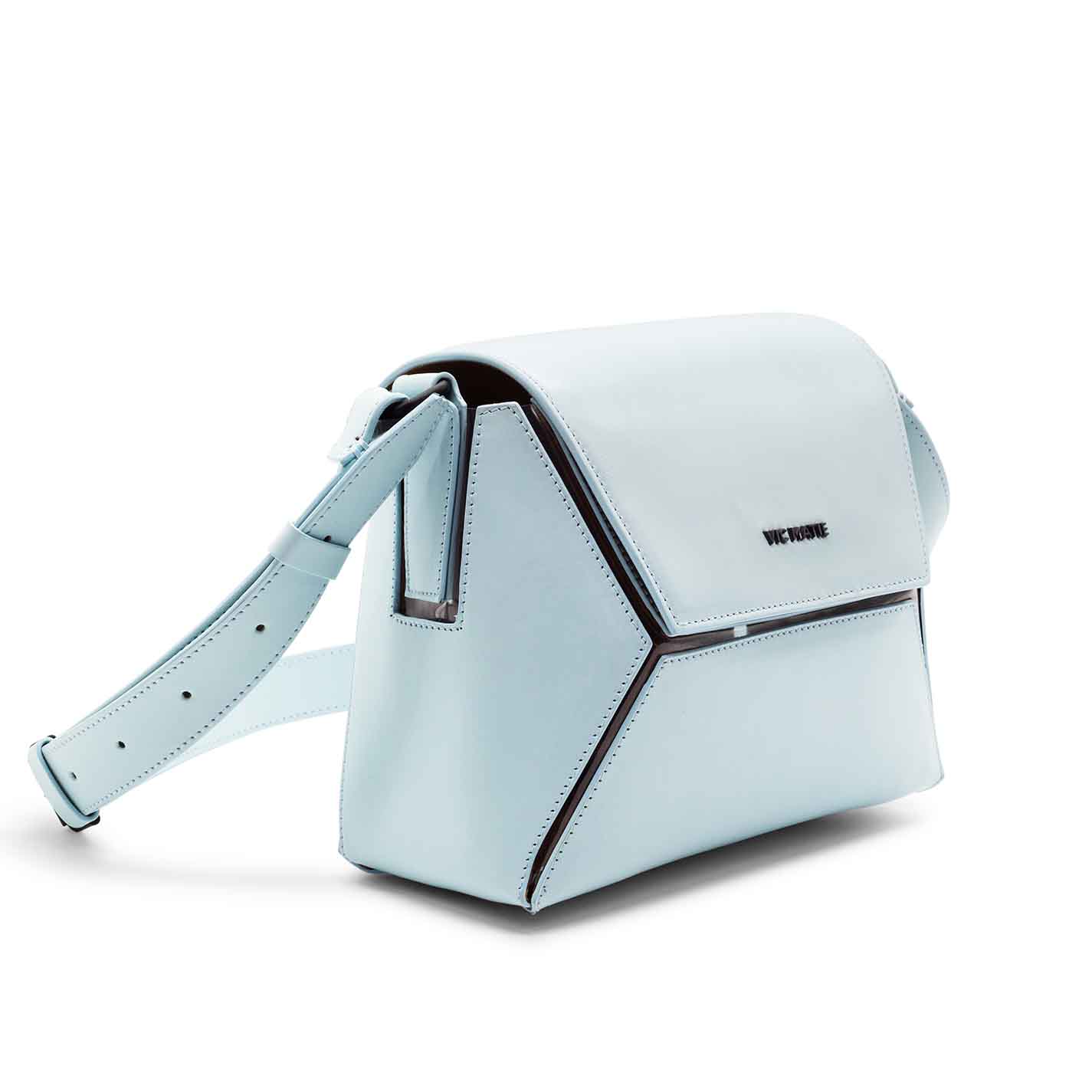 sky-blue/transparent 3D hexagon shoulder bag in smooth reinforced calfskin. The geometric parts are stitched onto contrasting leather. Magnetic fastening, adjustable shoulder strap and metal logo on the front. Made in Italy.