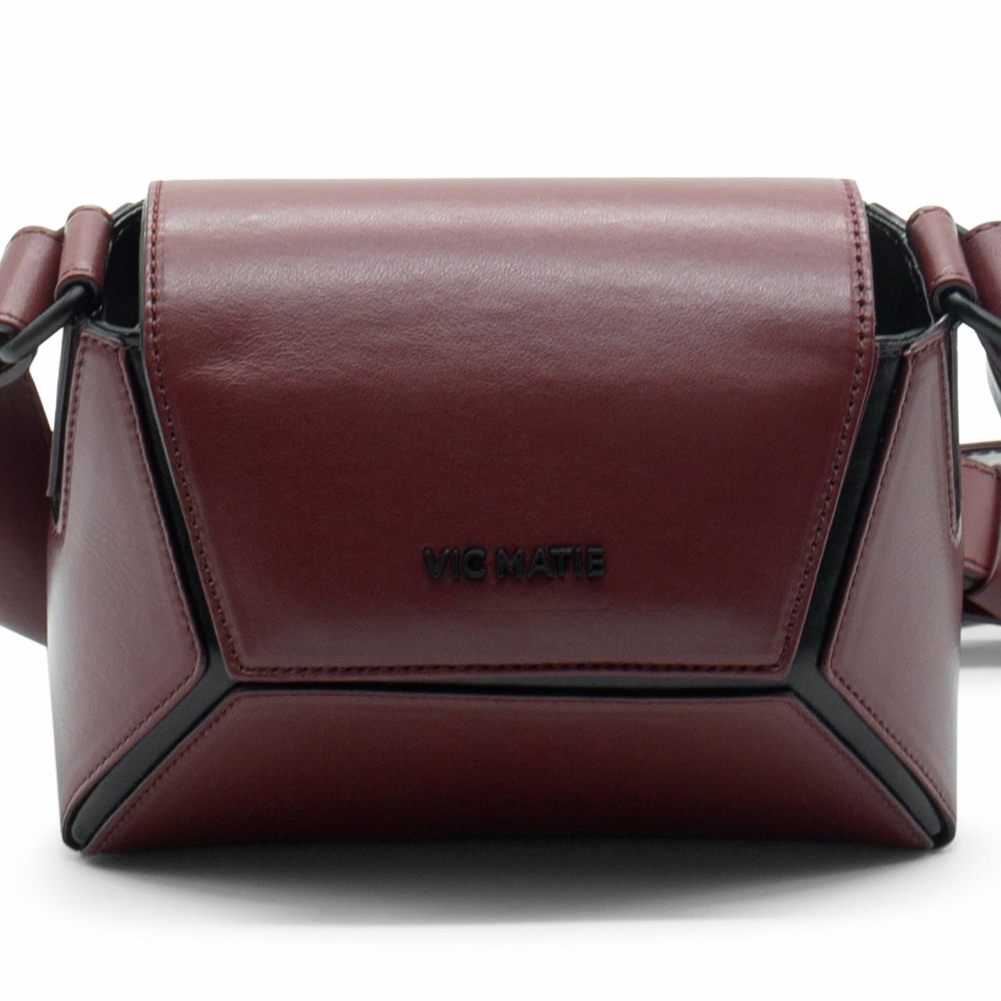 Dark red/black small shoulder bag with 3D hexagon pattern, crafted from smooth and backed calfskin, with sewn-on geometric parts on contrasting leather. It features magnet fasteners, adjustable shoulder strap, and front metal logo. Made in Italy.