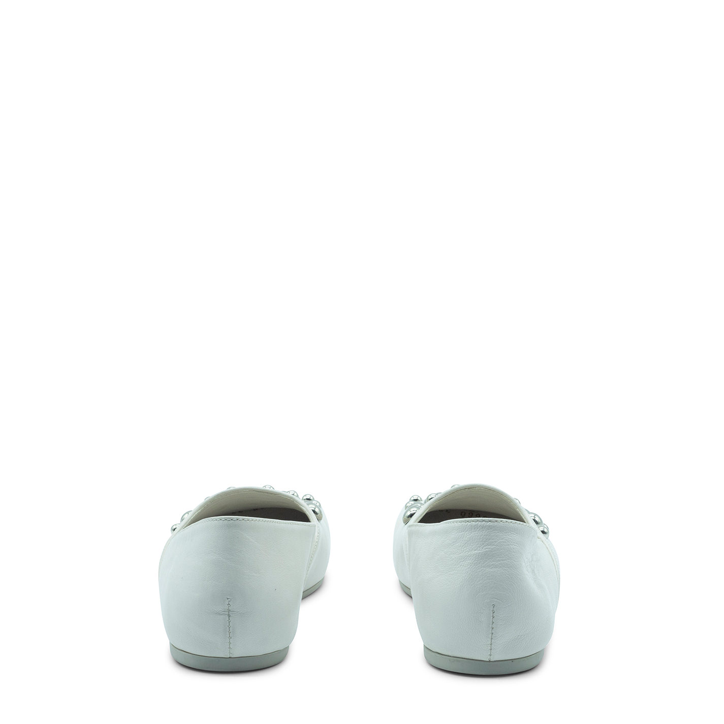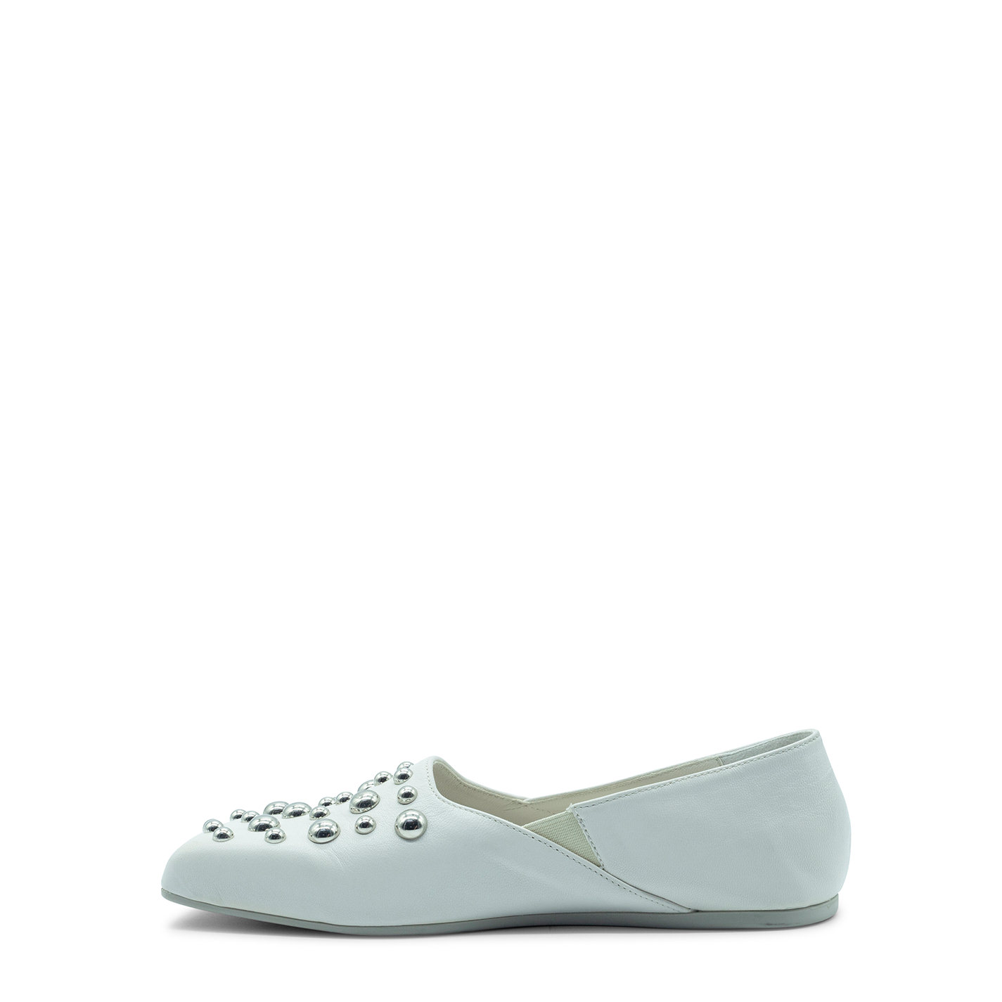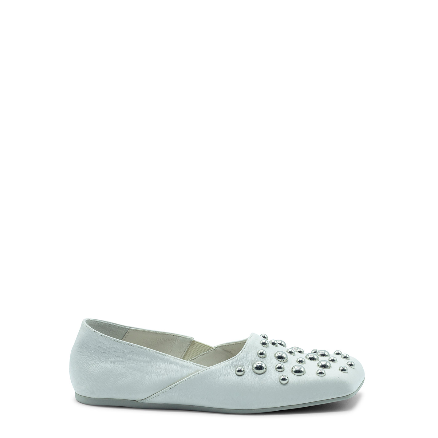 Square closed cream slipper, in soft nappa leather, with silver hemispherical studs on the tip. Slightly high-necked, with a small elastic inside that allows it to have a greater fit. Non-slip rubber sole with maxi logo with an oblique square toe;