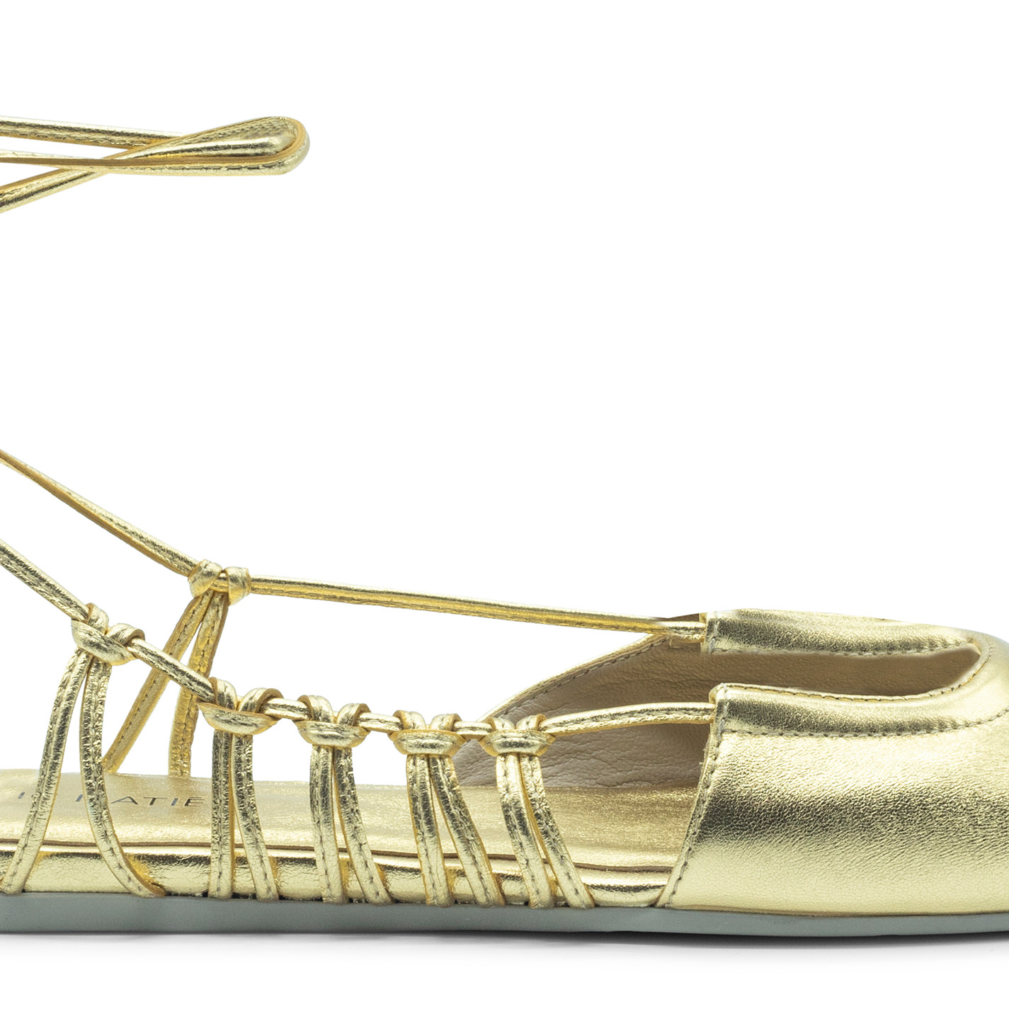 Square closed gold sabot, in laminated nappa leather with asymmetrical neckline and leather lace, which starts from the same and takes the knotted loops and then wraps them at the ankle at will. Non-slip rubber sole with maxi logo with an oblique square toe;