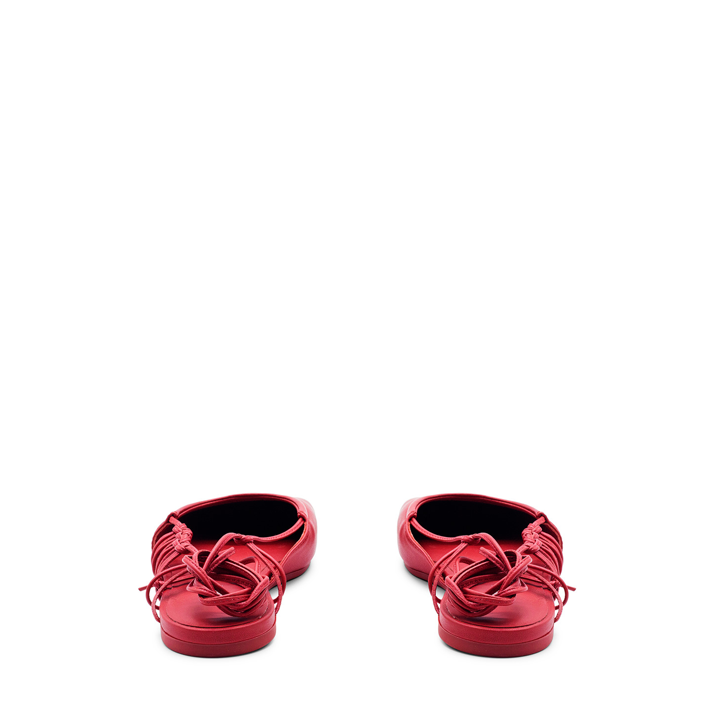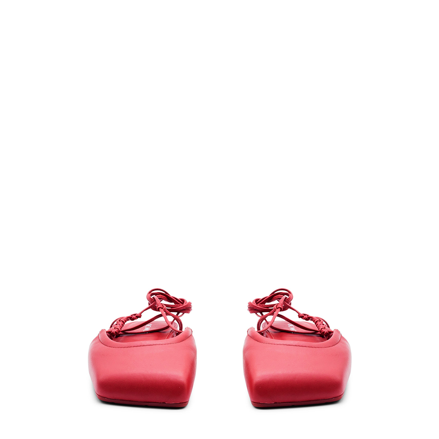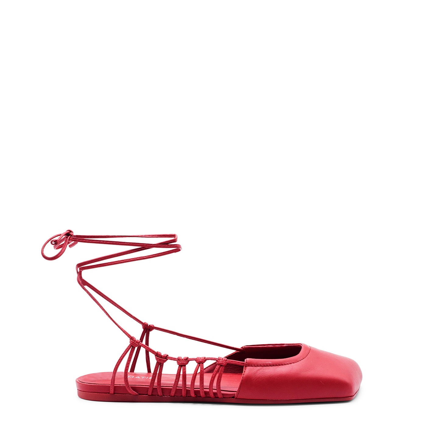 Square closed red sabot , in soft nappa leather with an asymmetrical neckline and leather lace, which starts from the same and takes the knotted loops and then wraps them around the ankle at will. Non-slip rubber sole with maxi logo with an oblique square toe;
