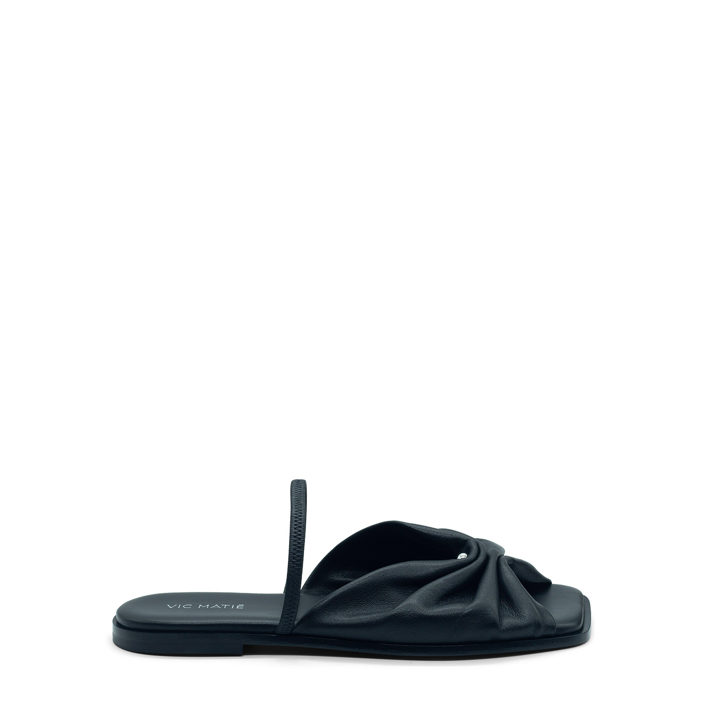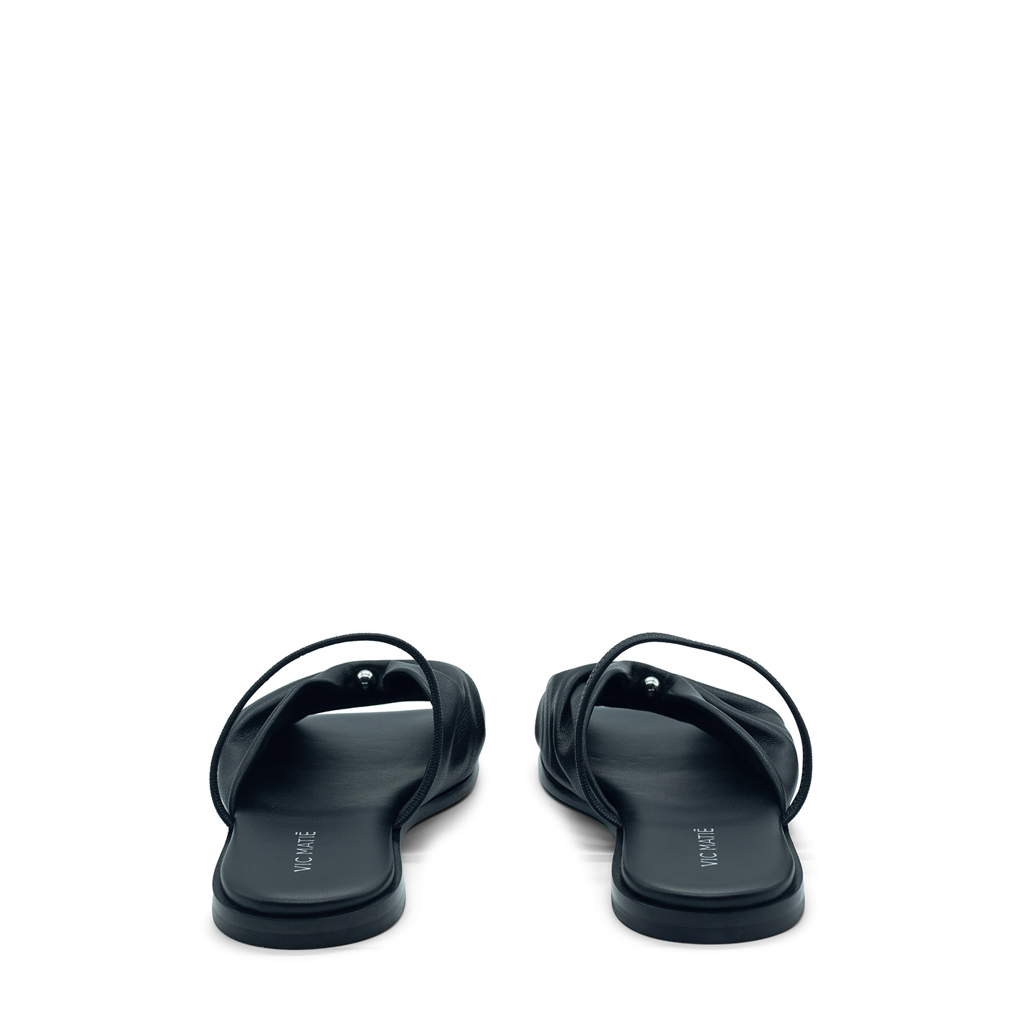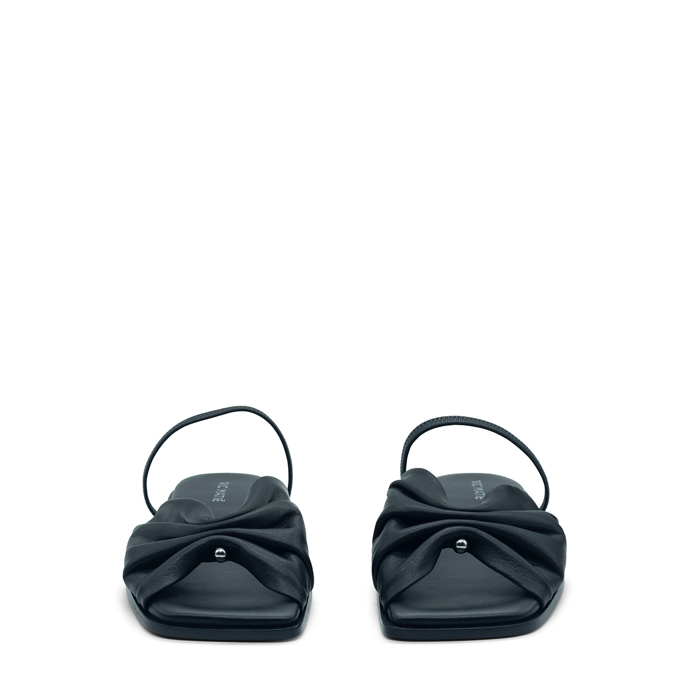 Square open black piercing sandalmade of soft nappa leather, with the metal accessory in the center that creates the curl, elastic covered in leather for greater portability. Leather sole with non-slip rubber heel. Lightly padded insole covered in leather. Made in Italy.