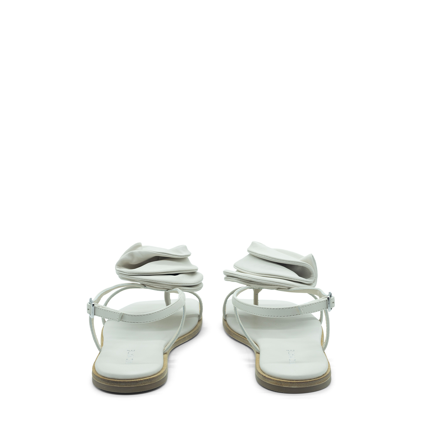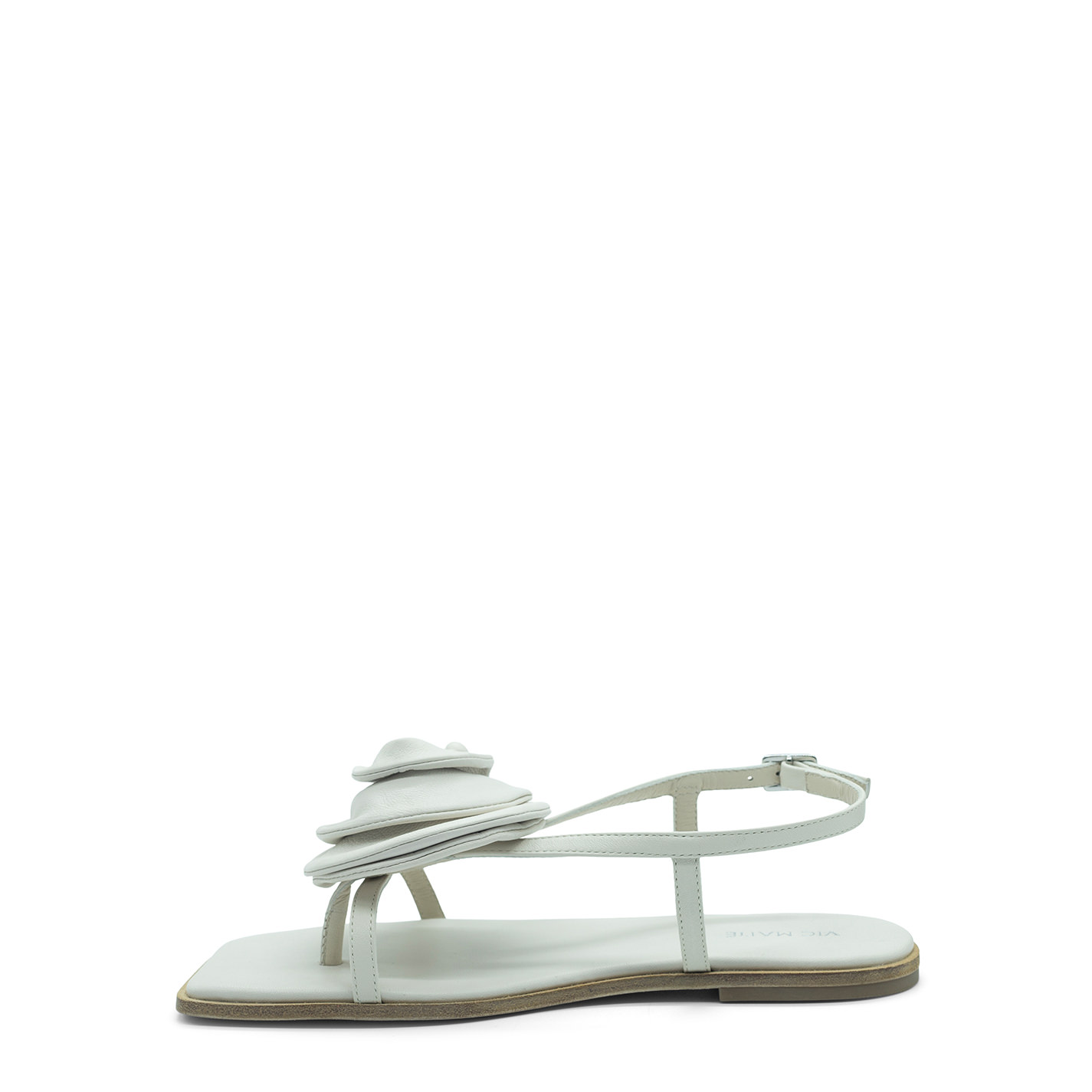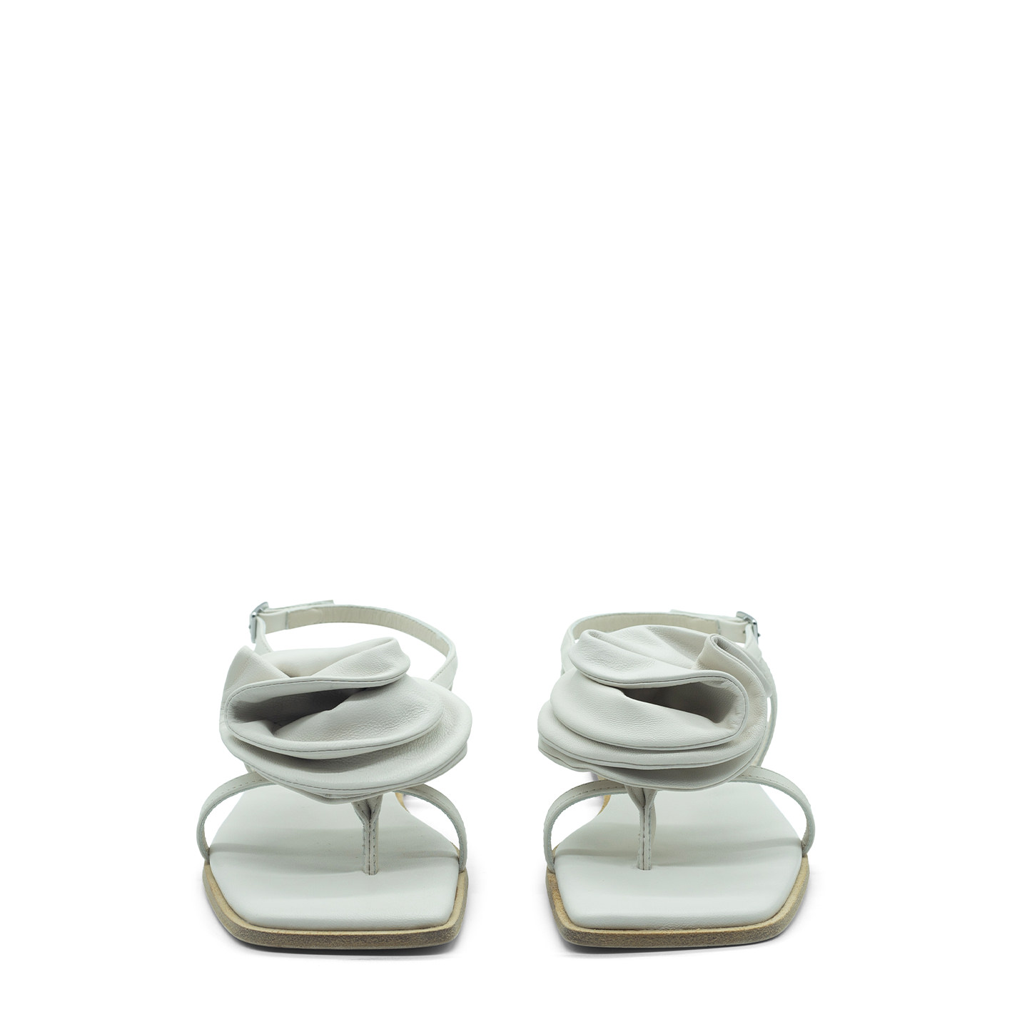 Square open cream roses sandal made of soft nappa leather, very feminine and composed of a front strap and a strap that fastens laterally with an adjustable buckle. The handmade rose and the same material as the upper enriches everything. Leather sole with non-slip rubber heel. Lightly padded insole covered in leather. Made in Italy.