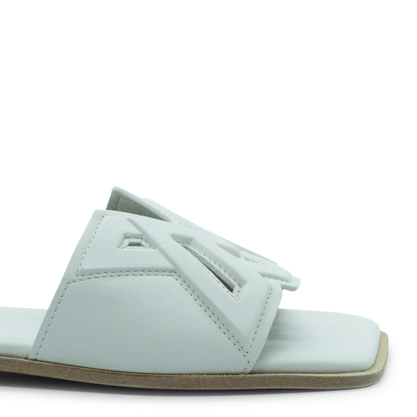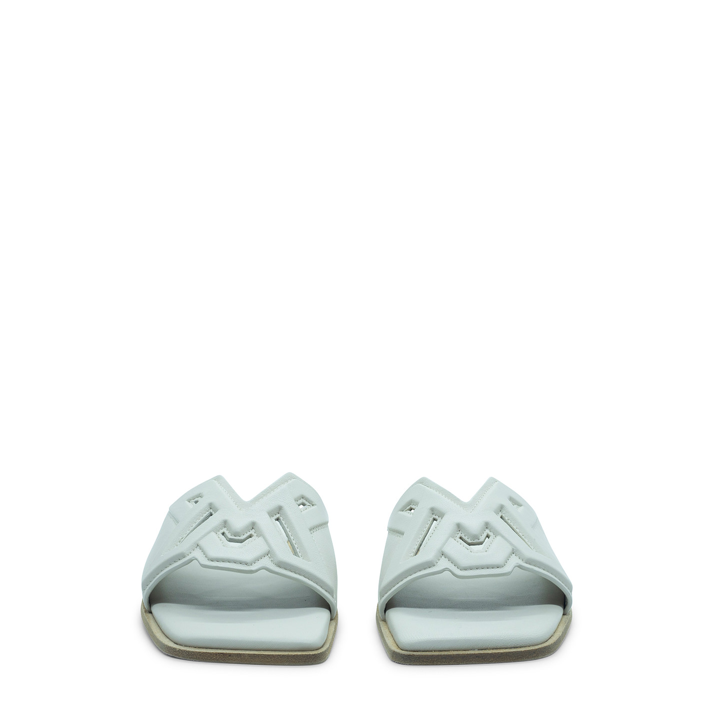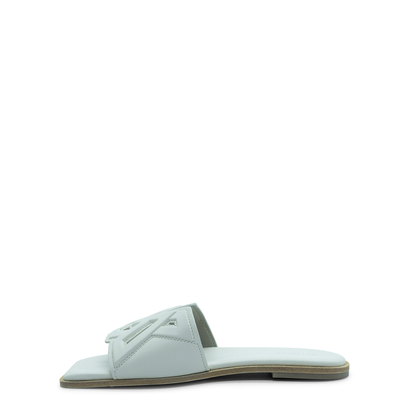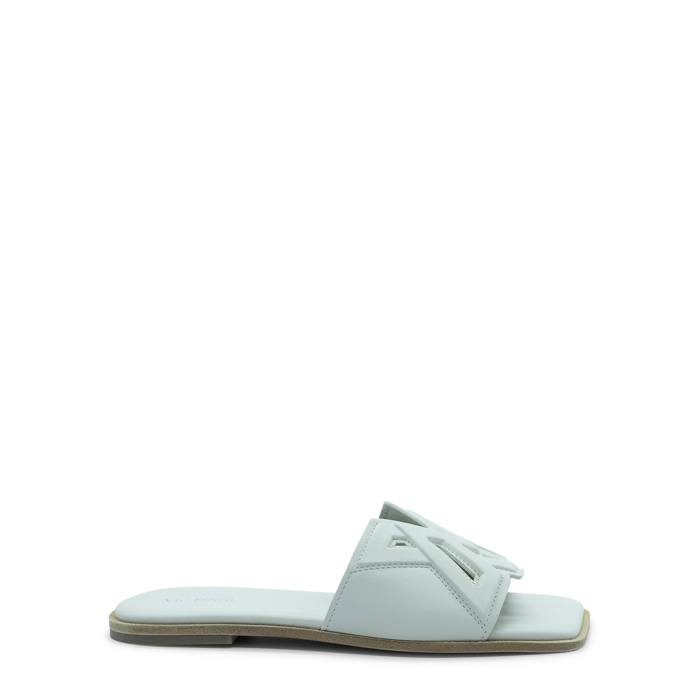 Square open monogram cream slipper made of nappa leather with embossed VM logo processing, sewn and perforated. Leather sole with non-slip rubber heel. Lightly padded insole covered in leather. Made in Italy.