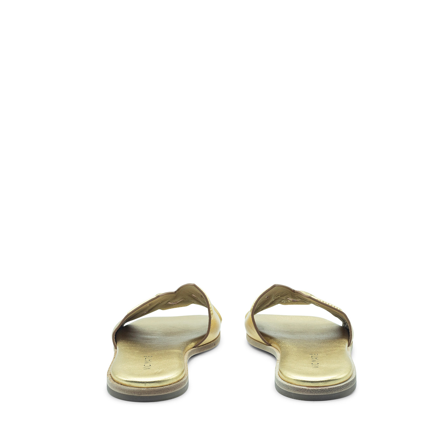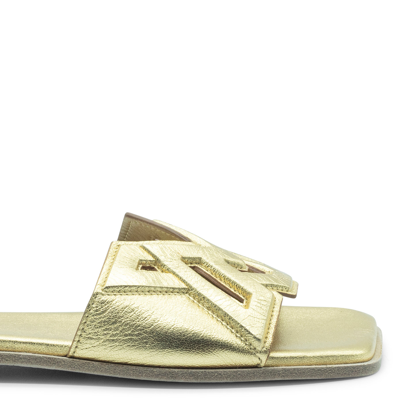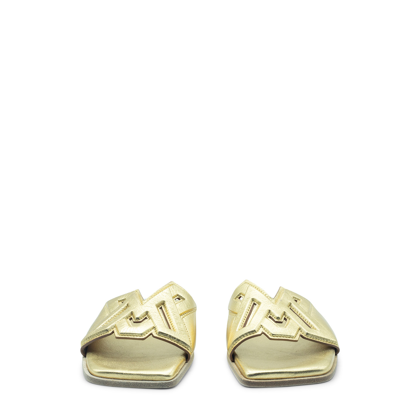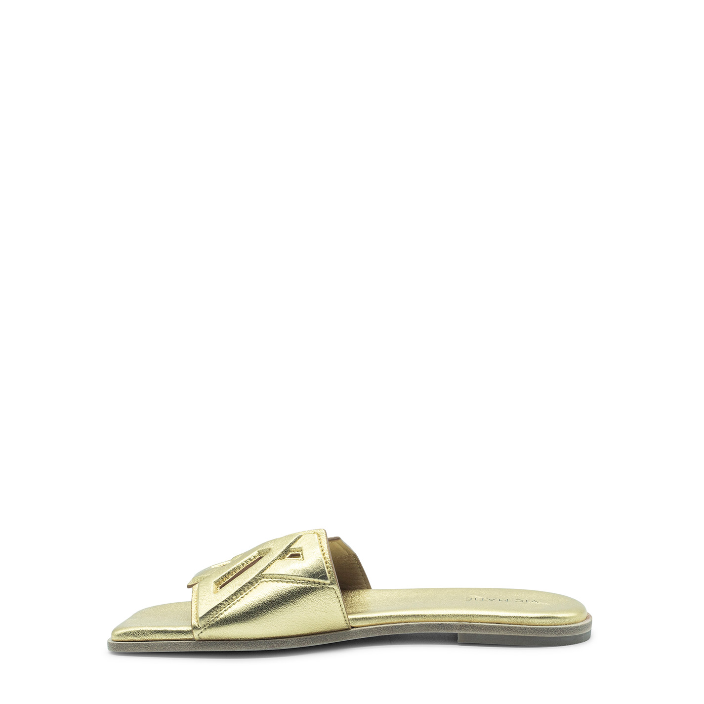 Square open monogram gold slipper realizzato in nappa laminata con lavorazione del logo VM in rilievo, cucito e traforato. Suola in cuoio con tacco antiscivolo in gomma. Sottopiede leggermente imbottito e rivestito in pelle. Made in Italy.