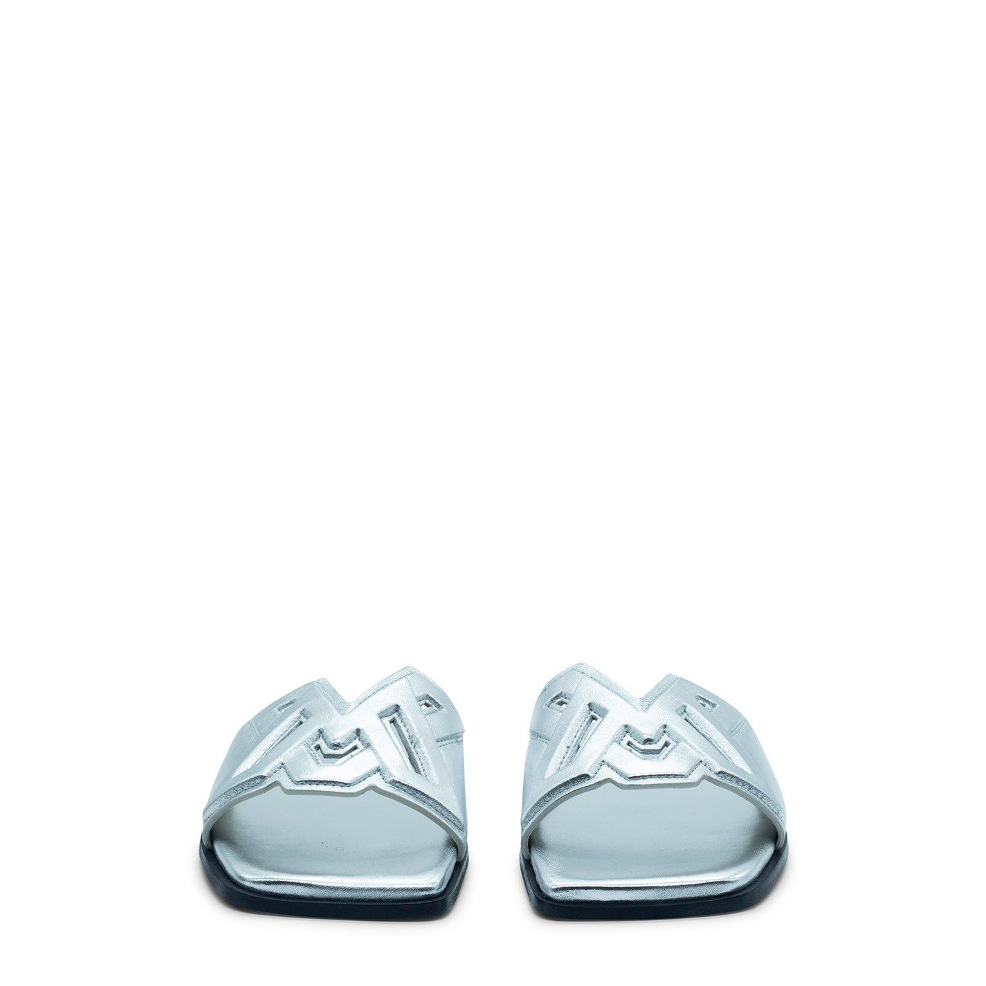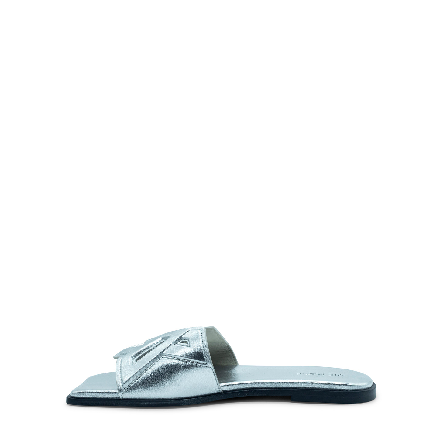 Square open silver monogram slipper made of laminated nappa leather with embossed VM logo processing, sewn and perforated. Leather sole with non-slip rubber heel. Lightly padded insole covered in leather. Made in Italy.
