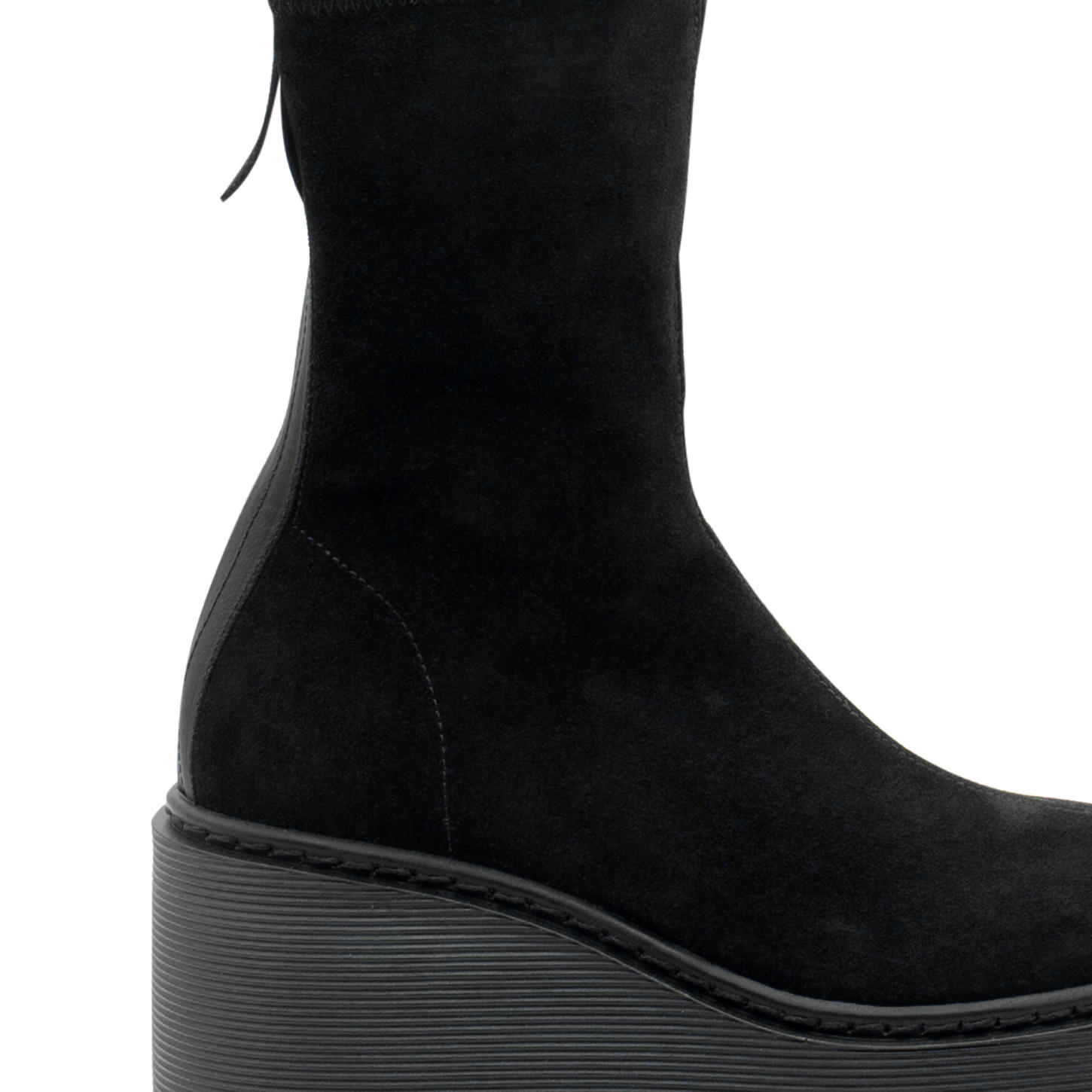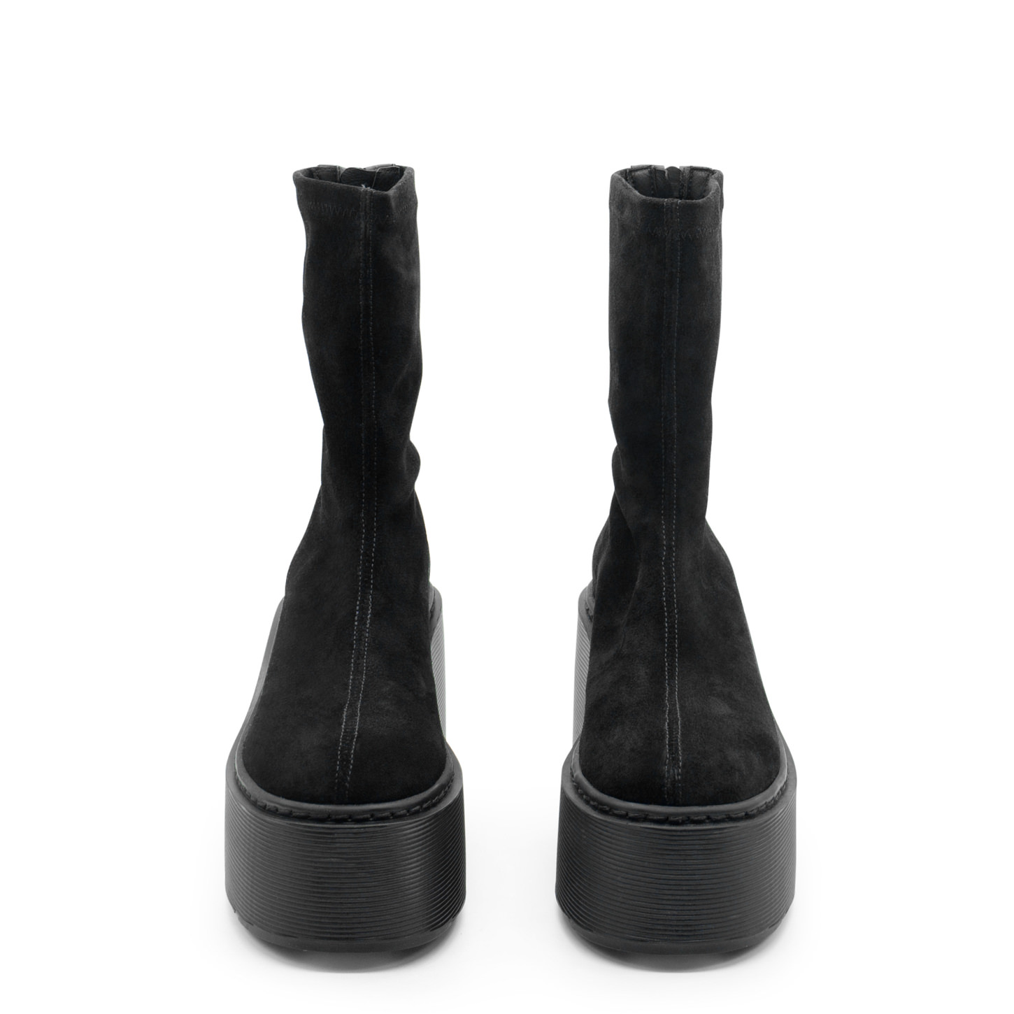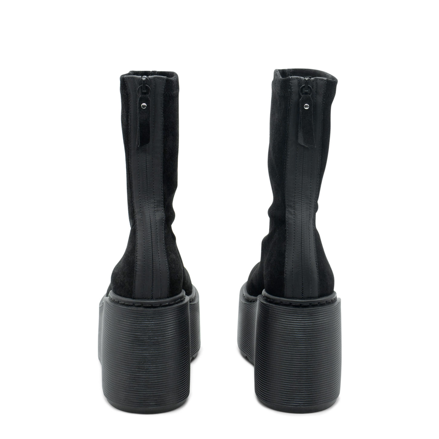 Stripy black stretch split leather platform half boots, with tone-on-tone pearly back zip. This model features a striped-effect rubber platform, with non-slip ribbed outsole. Made in Italy.