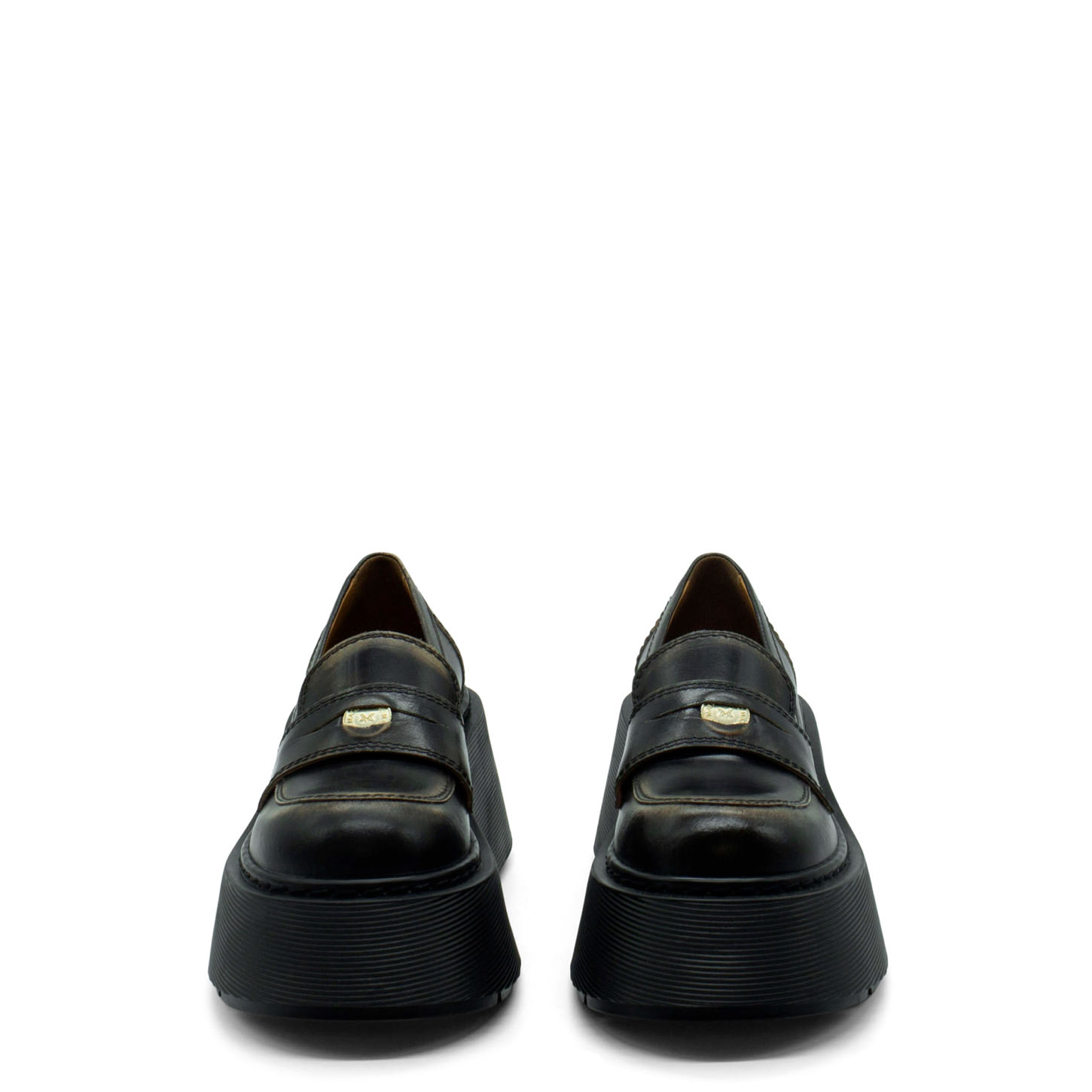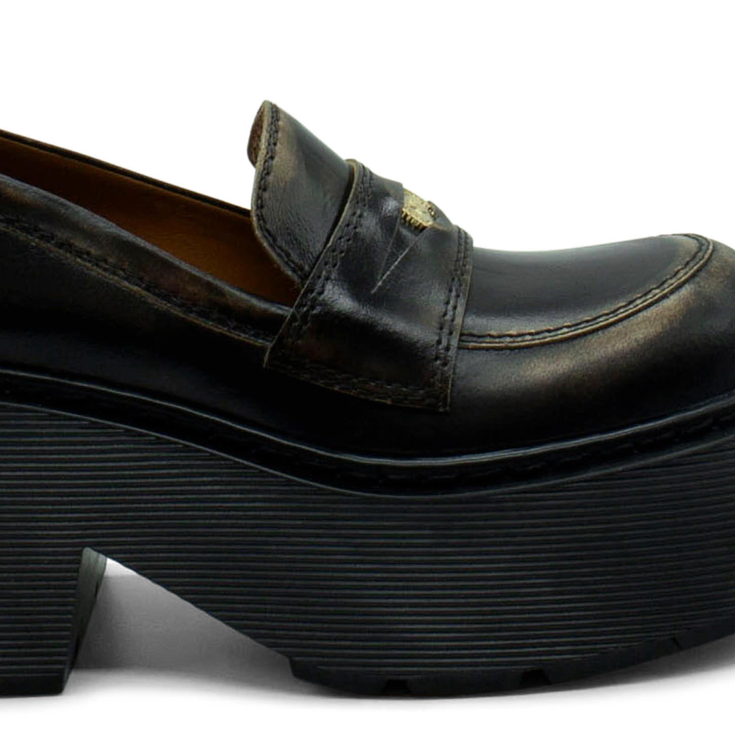 Stripy dark brown penny loafers, crafted from blackened vintage-effect leather, with Vic Matié branded coin inside the saddle slot. This model is fitted with an oversized rubber sole with seam, striped texture and a soft footbed covered in leather. Made in Italy.